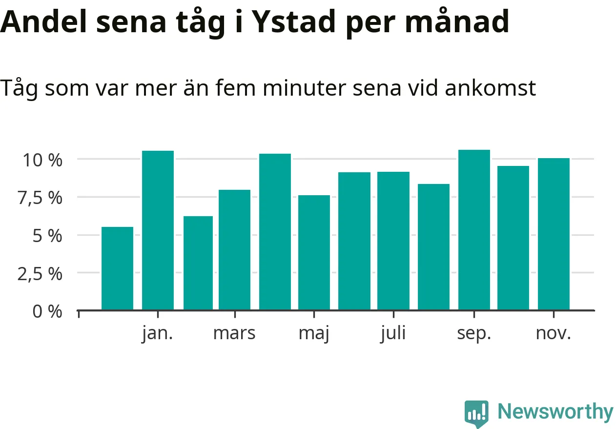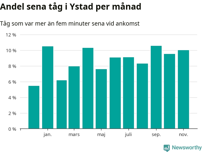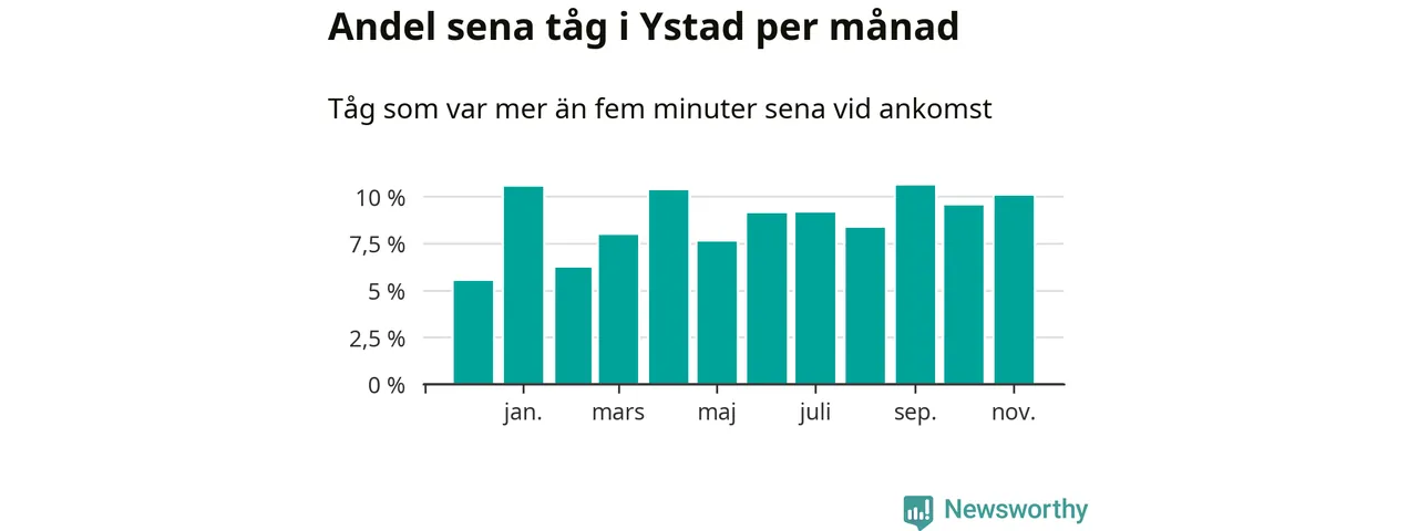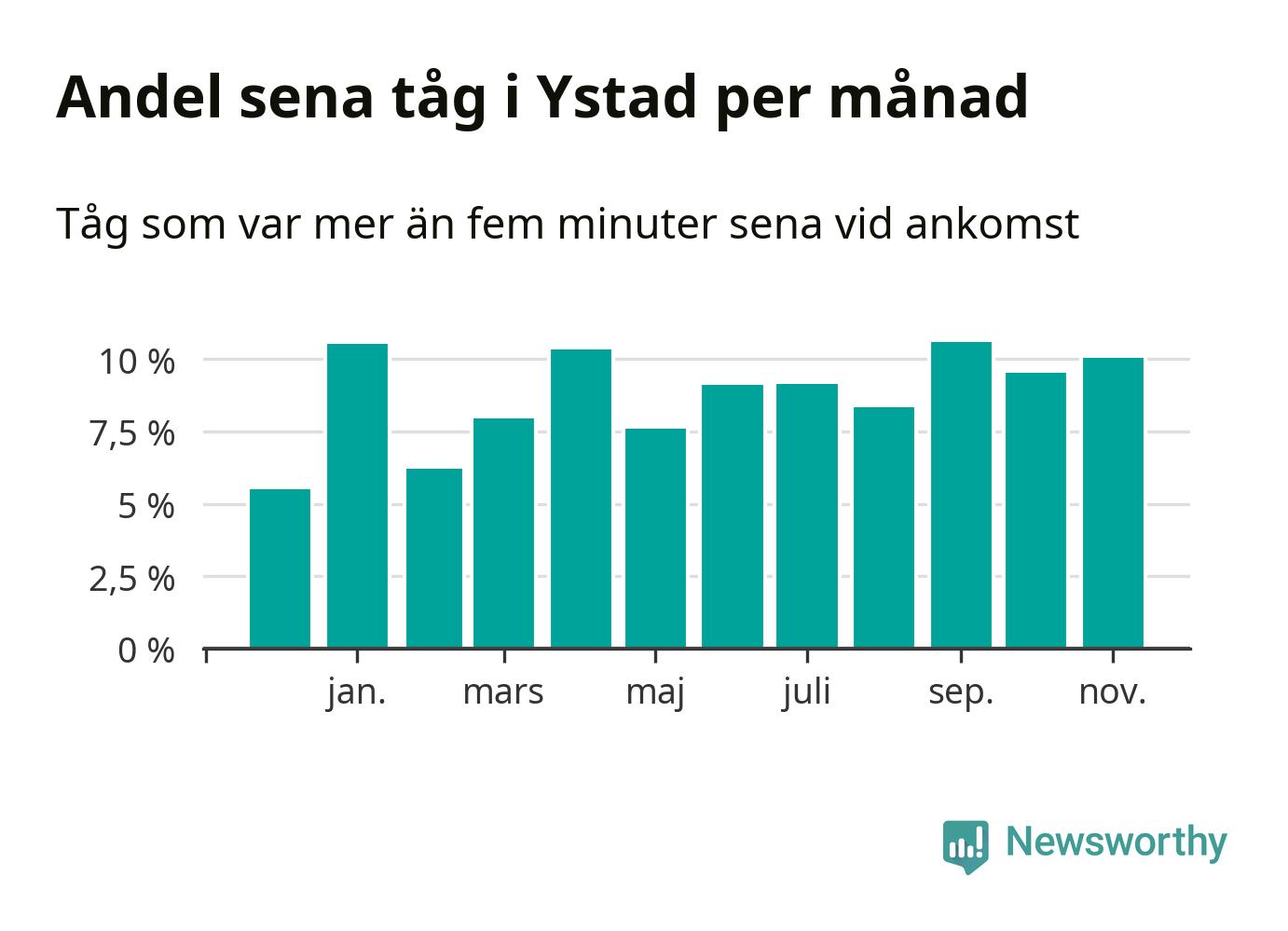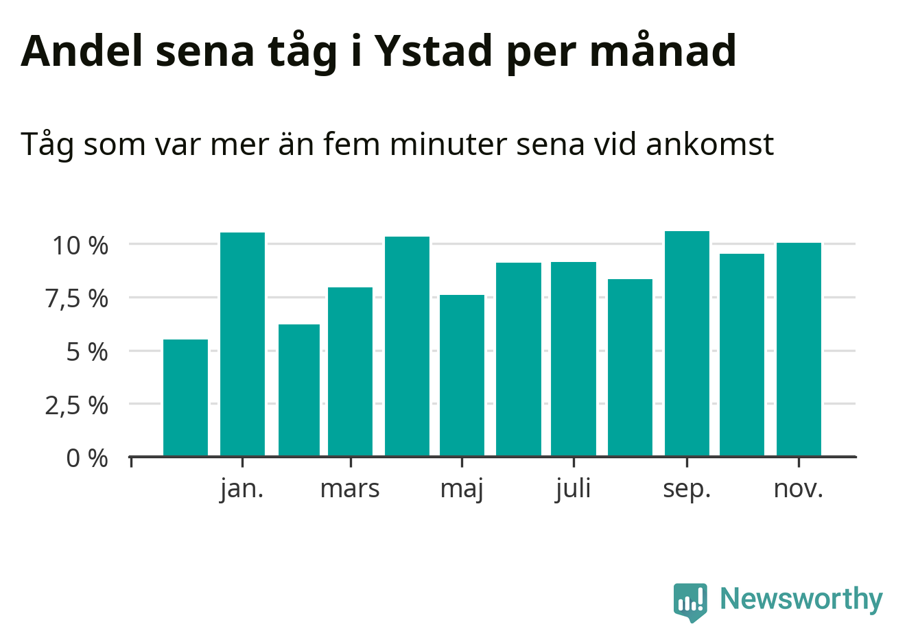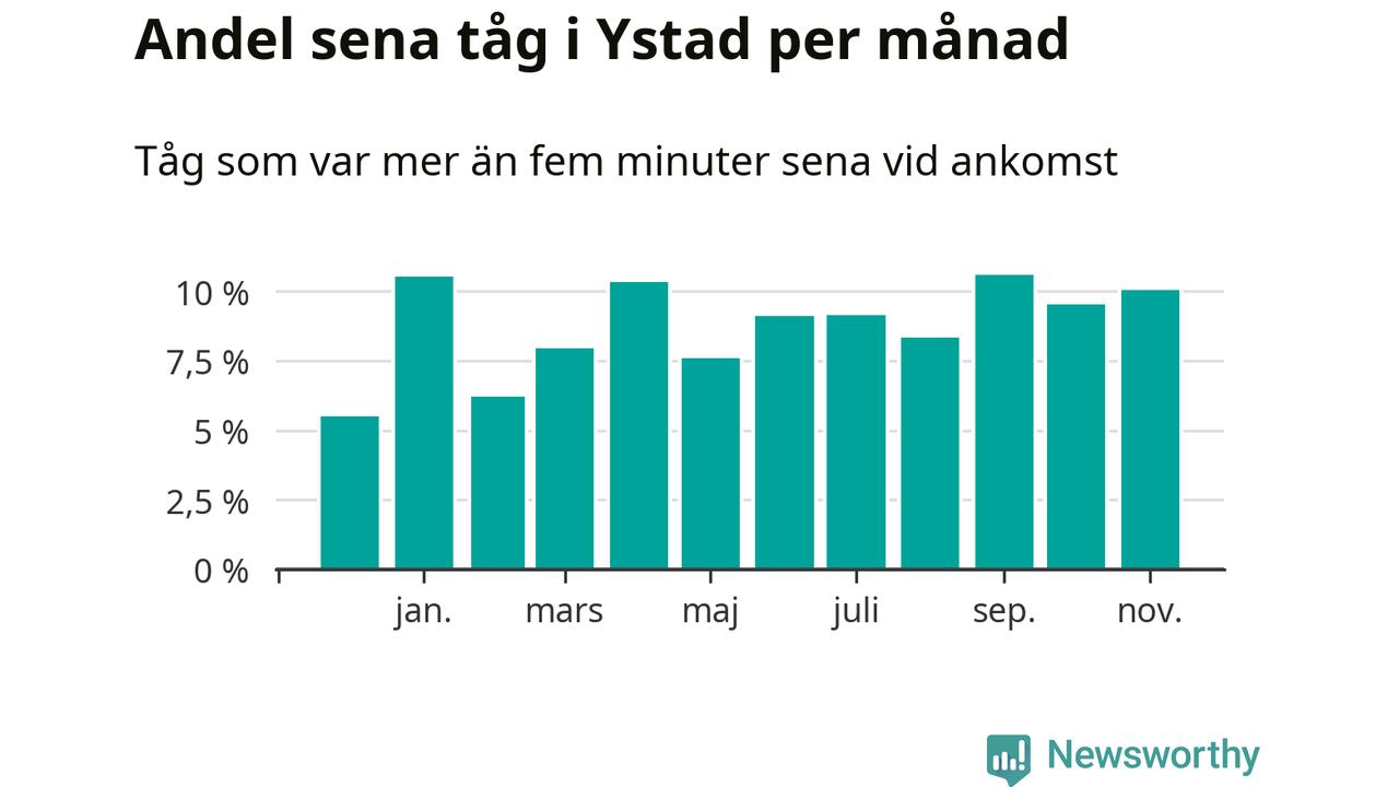 Den svenska järnvägsbranschen och Trafikverket har ett gemensamt mål om att 95 procent av tågen ska komma fram med högst fem minuters försening till sin slutstation. Tågtrafiken i Ystad låg på rätt sida om den gränsen sex av 52 veckor det senaste året, även om det officiella punktlighetsmåttet (ankomst till slutstation) inte är rakt av jämförbart med det som används i den här artikeln (där vi tittar på alla tåg som passerar en station).