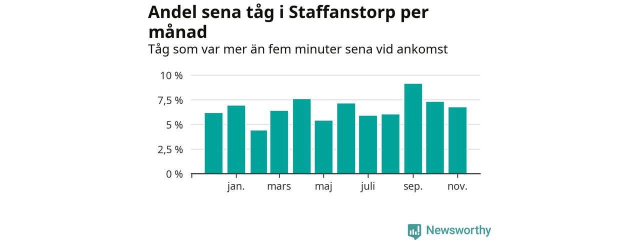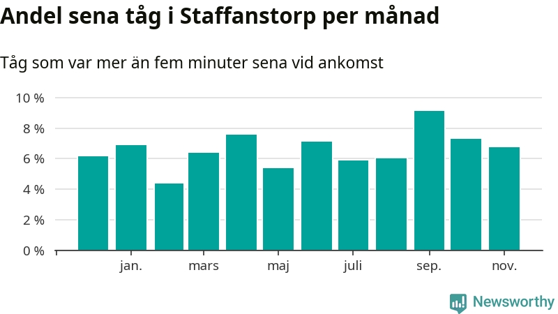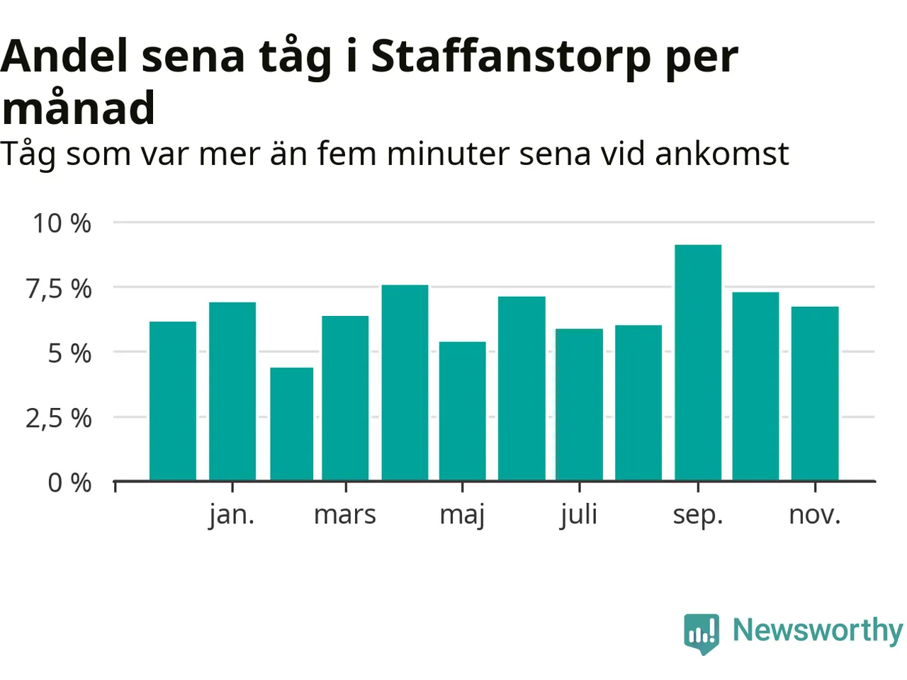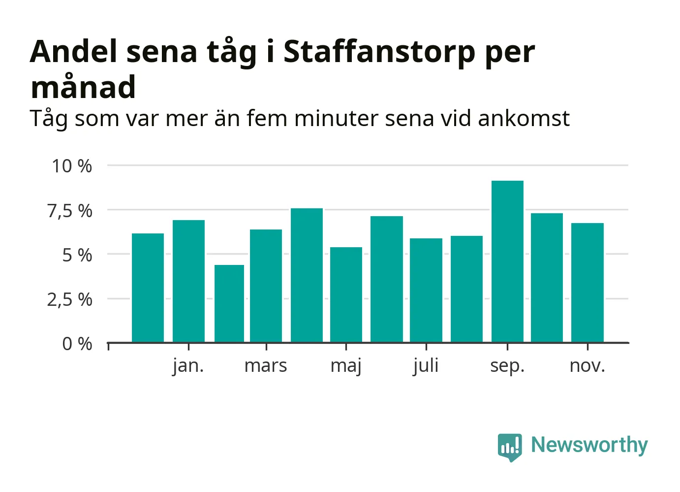 Den mest förseningsdrabbade månaden var september, med i snitt nio procent sena tåg enligt det måttet.