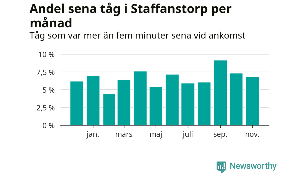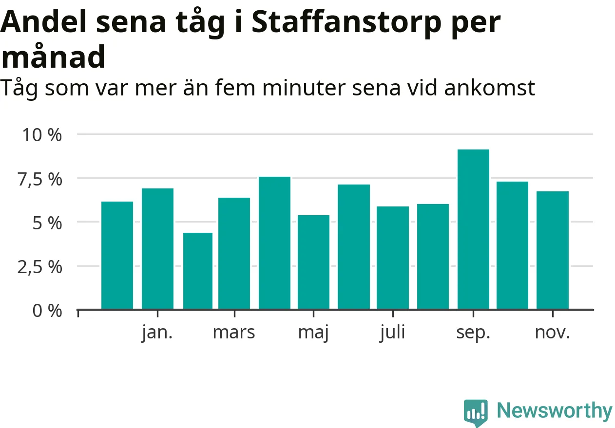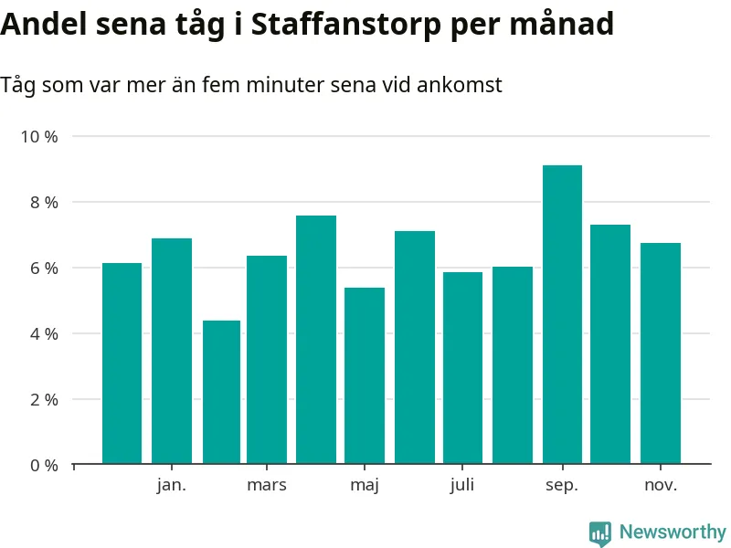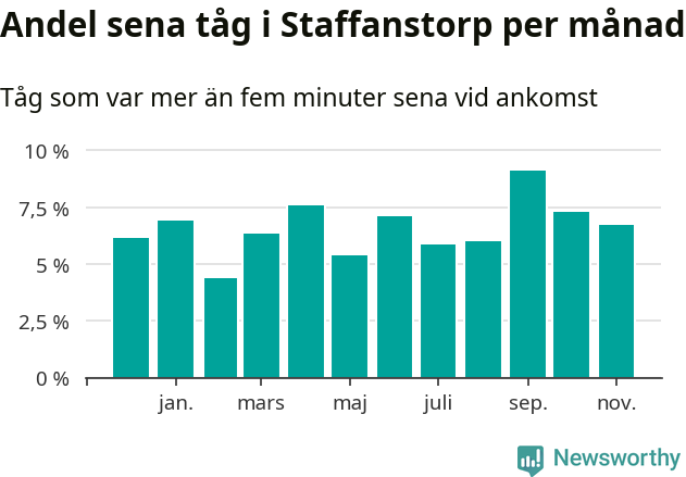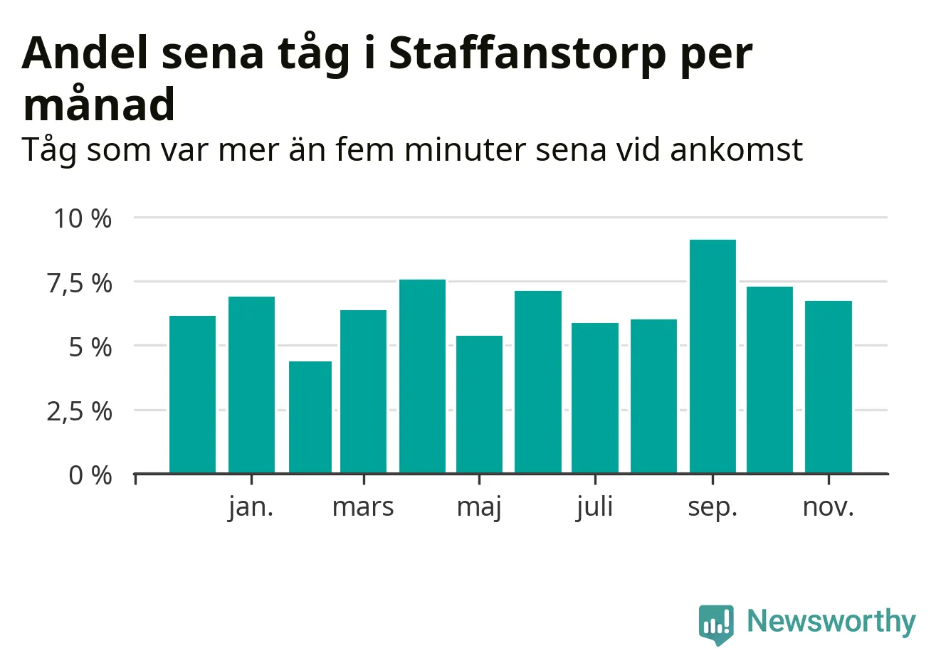 Den mest förseningsdrabbade månaden var september, med i snitt nio procent sena tåg enligt det måttet.
