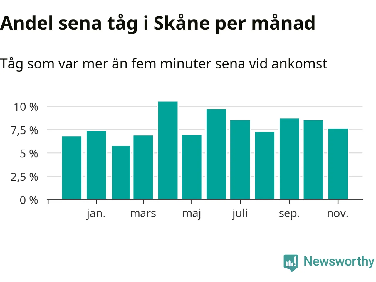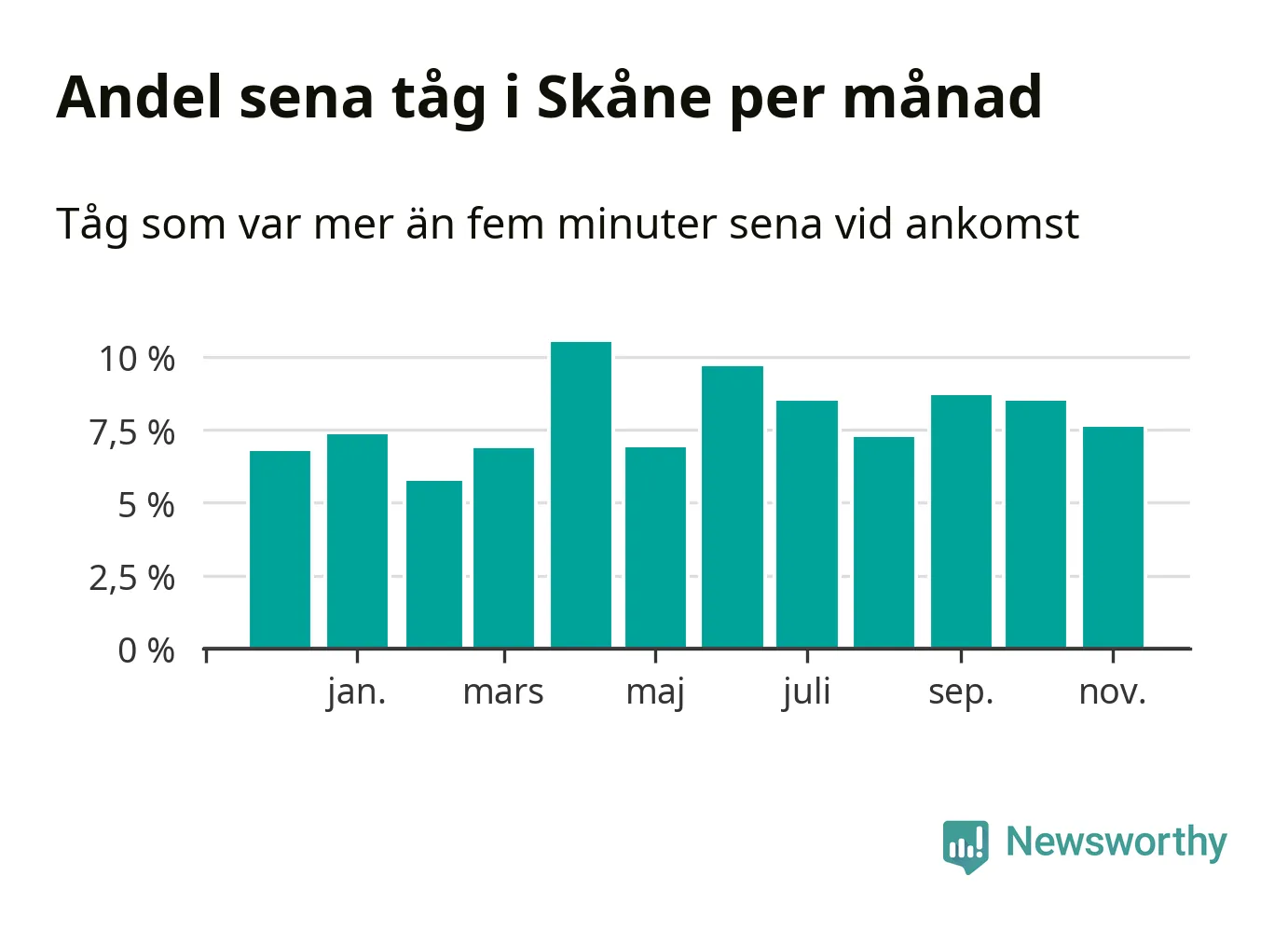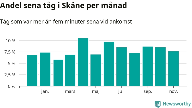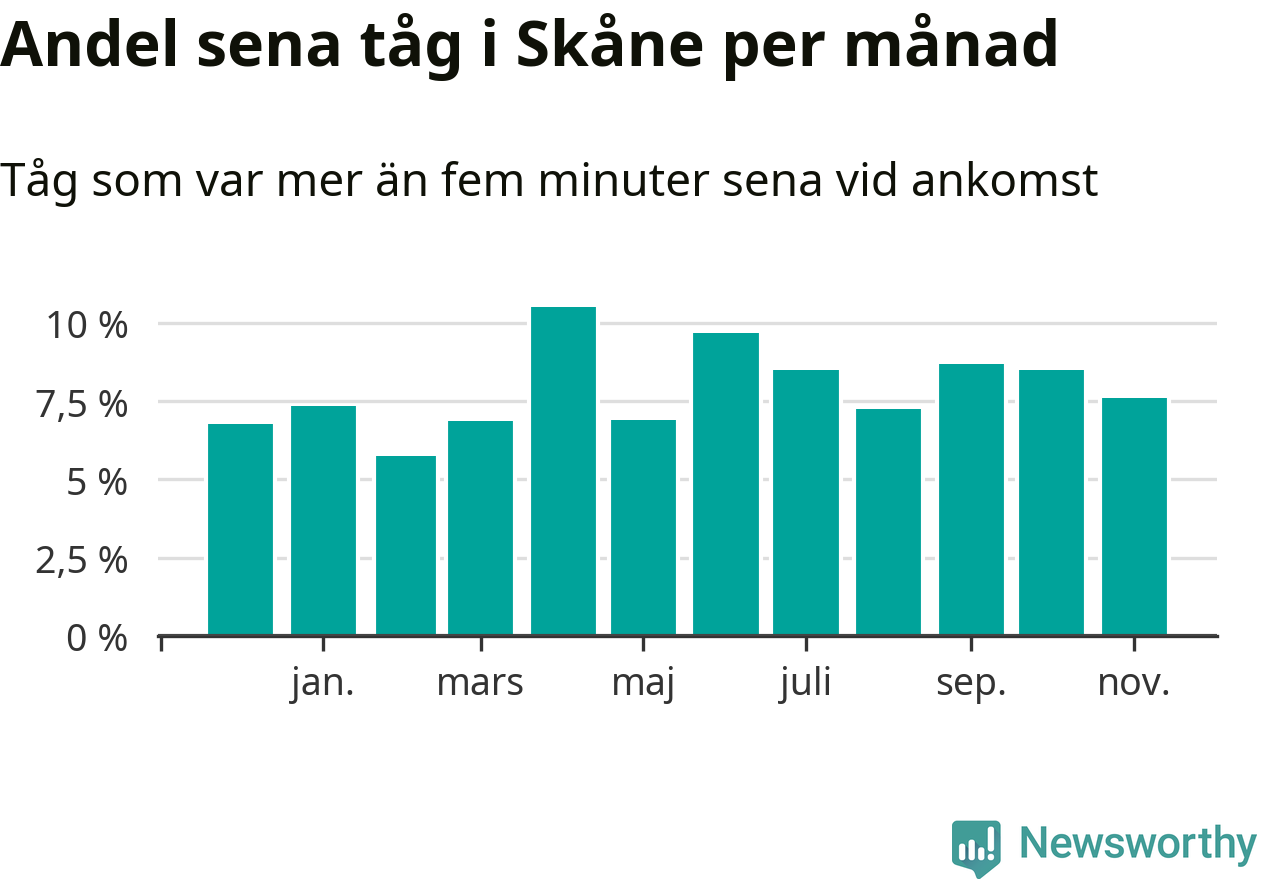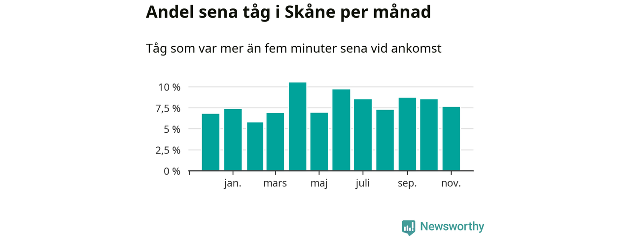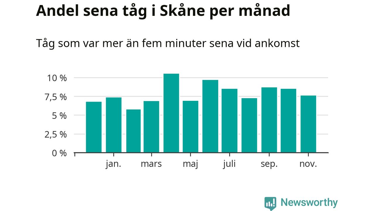 Den svenska järnvägsbranschen och Trafikverket har ett gemensamt mål om att 95 procent av tågen ska komma fram med högst fem minuters försening till sin slutstation. Dit är det långt i de flesta delar av landet. I Skåne var förseningarna färre än 5 procent under endast två veckor av 52 det senaste året. Det ska noteras att siffrorna i den här artikeln skiljer sig från det officiella punktlighetsmåttet, som bara beaktar ankomster till slutstationer, och där insamlingen sker på ett annat sätt än i den här artikeln.