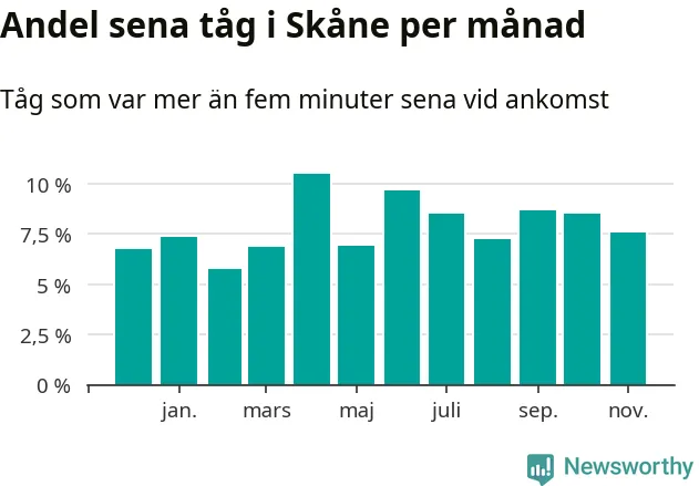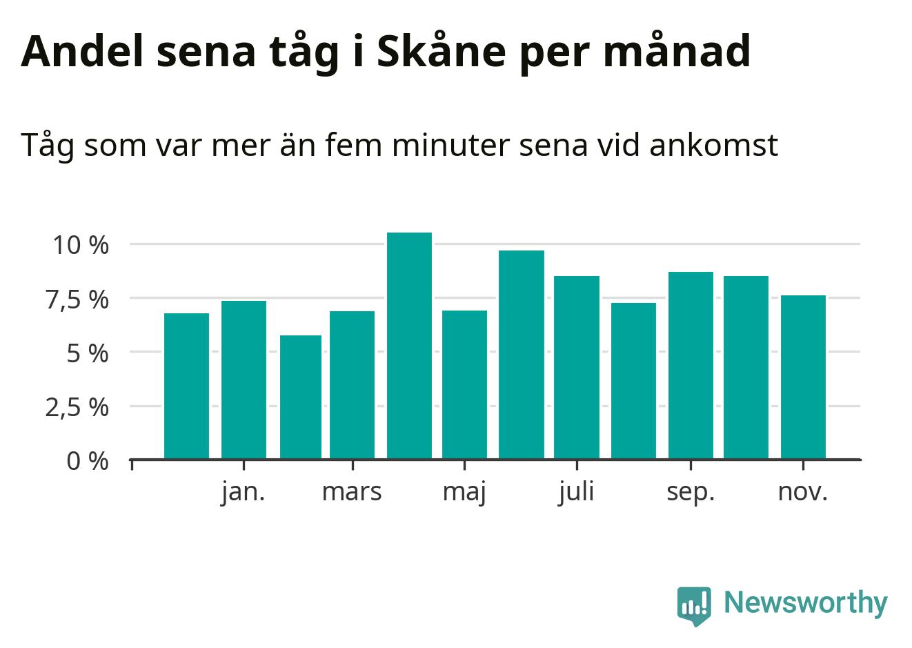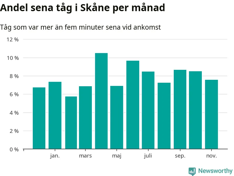 Den mest förseningsdrabbade månaden var april, med i snitt elva procent sena tåg enligt det måttet. Det senaste halvåret har andelen sena tåg varit högre än genomsnittet för halvåret innan dess.