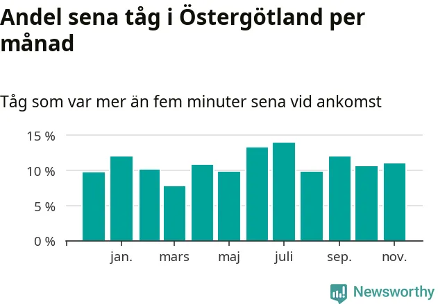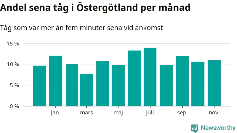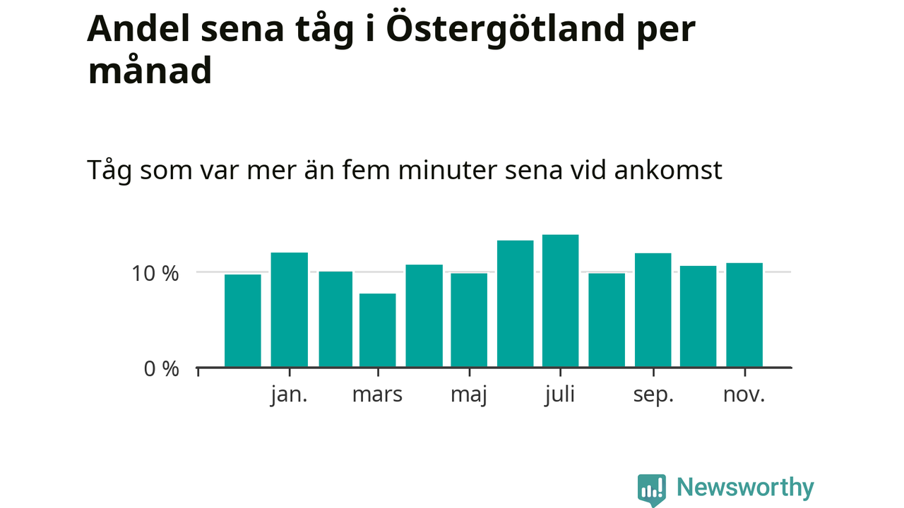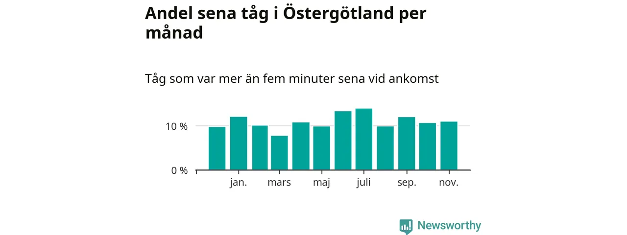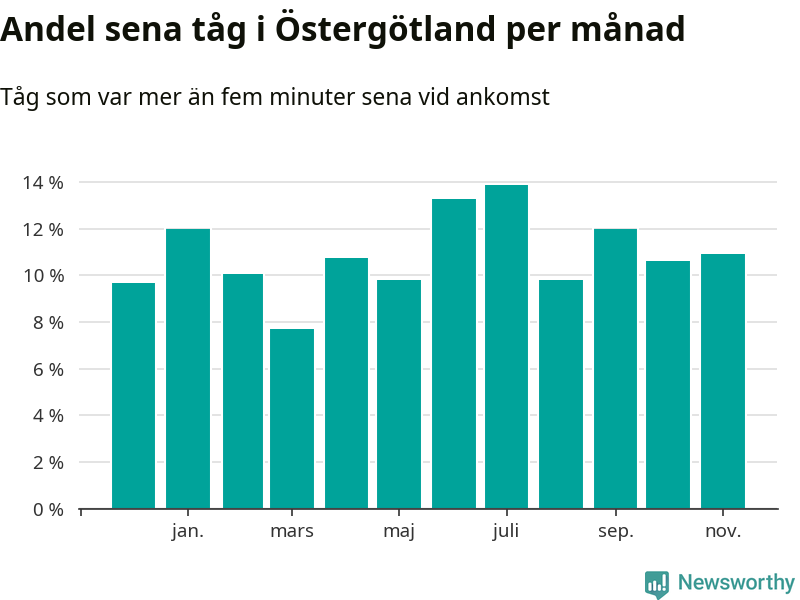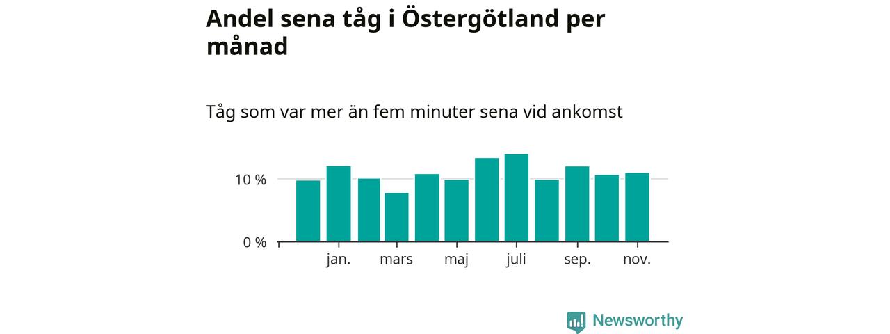 Den mest förseningsdrabbade månaden var juli, med i snitt 14 procent sena tåg enligt det måttet. Det senaste halvåret har andelen sena tåg varit högre än genomsnittet för halvåret innan dess.