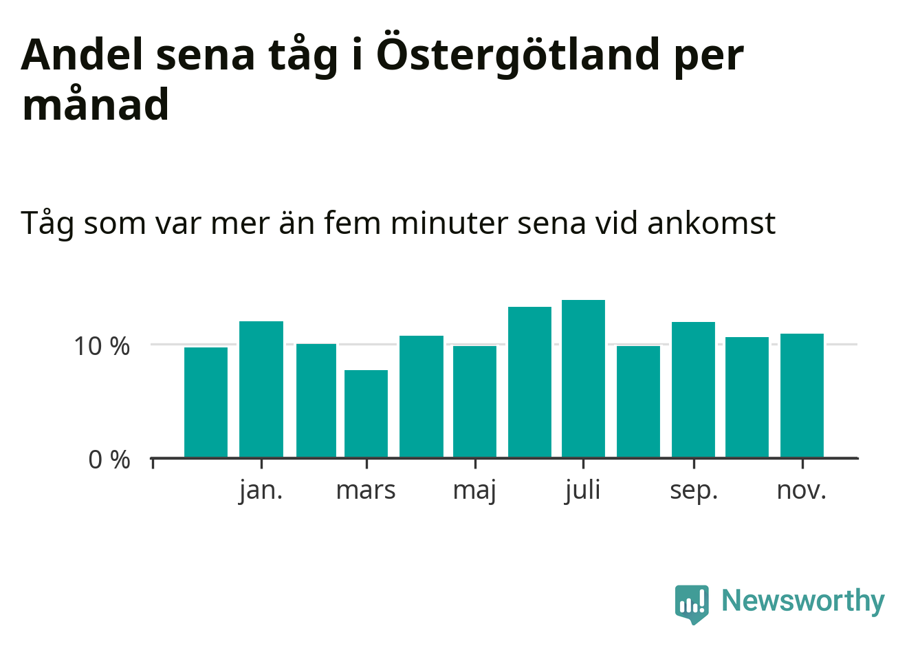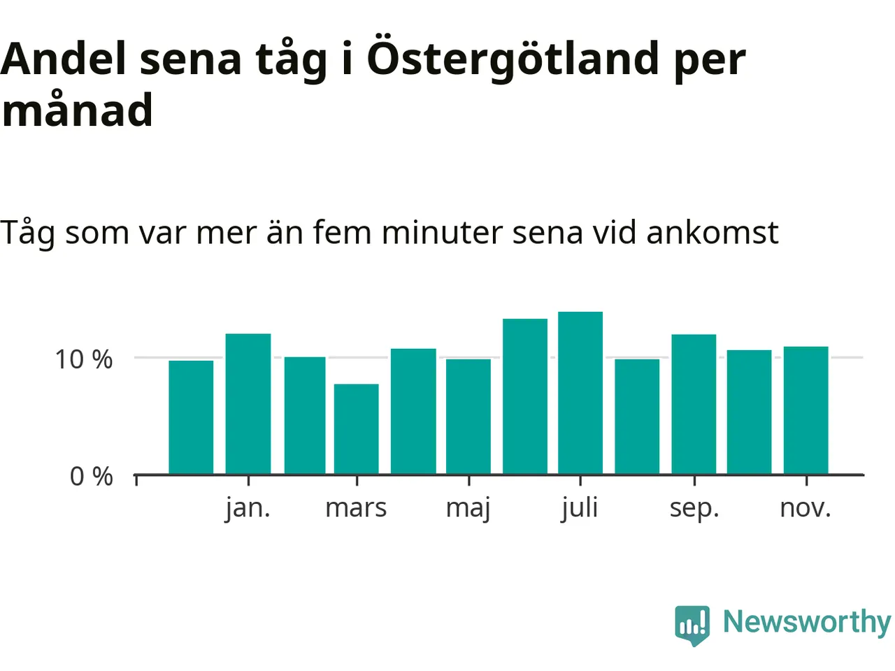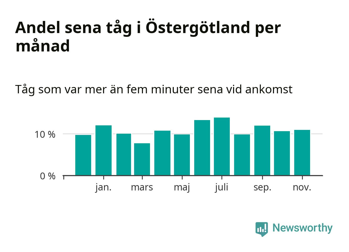 Den mest förseningsdrabbade månaden var juli, med i snitt 14 procent sena tåg enligt det måttet. Det senaste halvåret har andelen sena tåg varit högre än genomsnittet för halvåret innan dess.