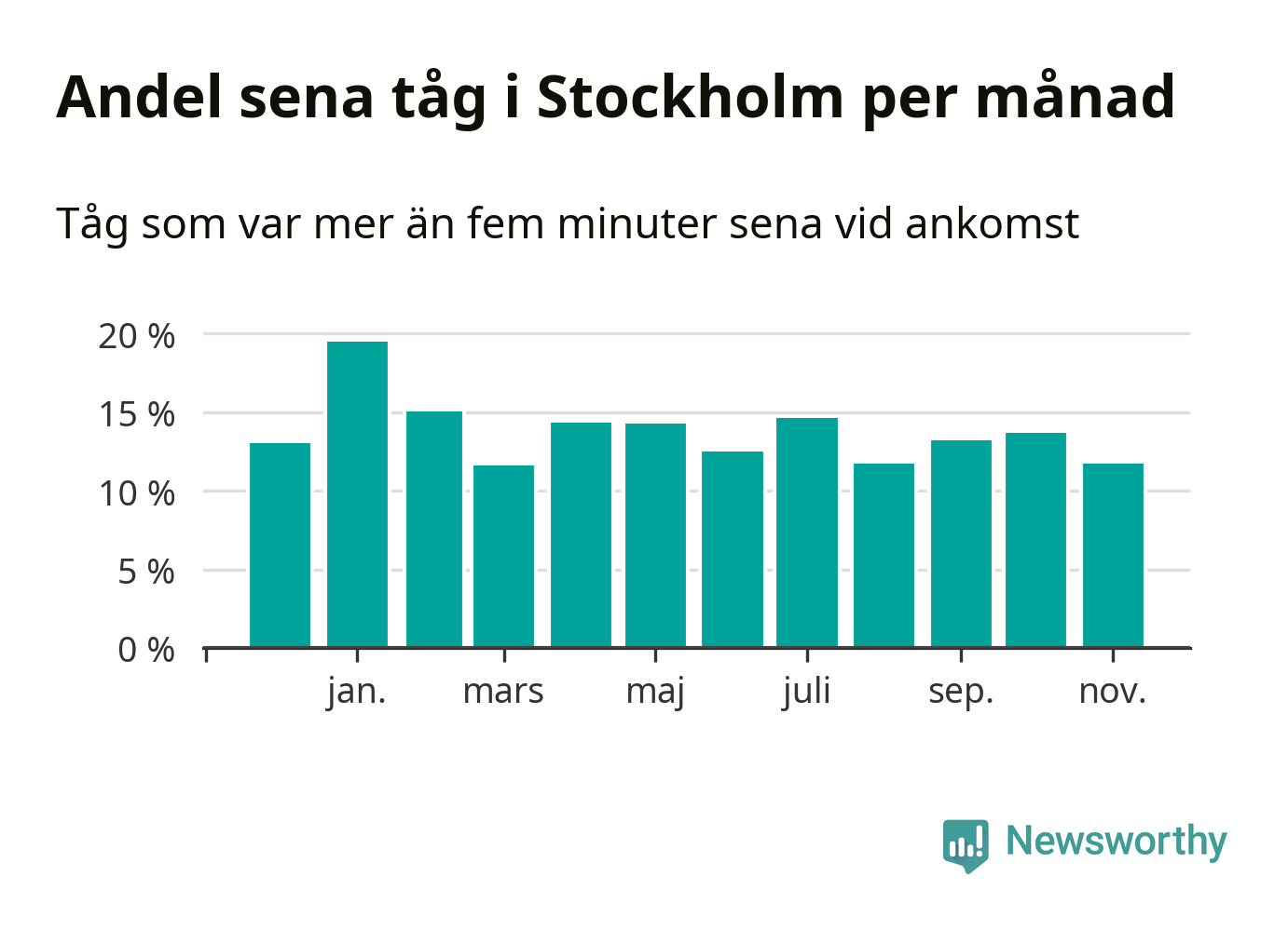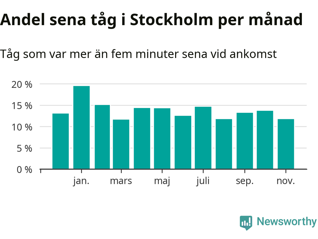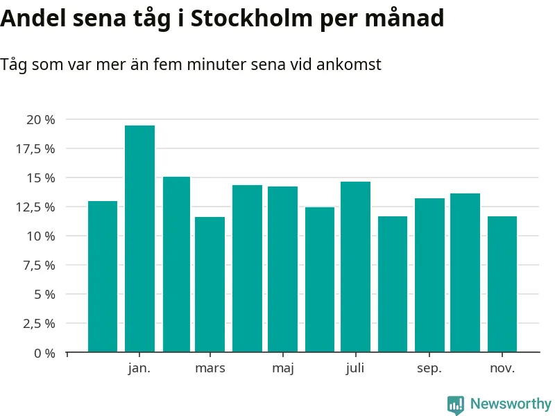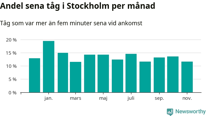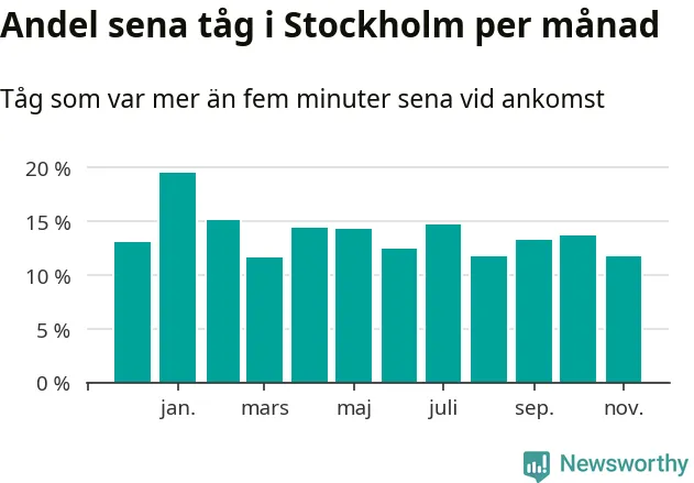 Den mest förseningsdrabbade månaden var januari, med i snitt 19 procent sena tåg enligt det måttet. Det senaste halvåret har andelen sena tåg varit lägre än halvåret innan dess.