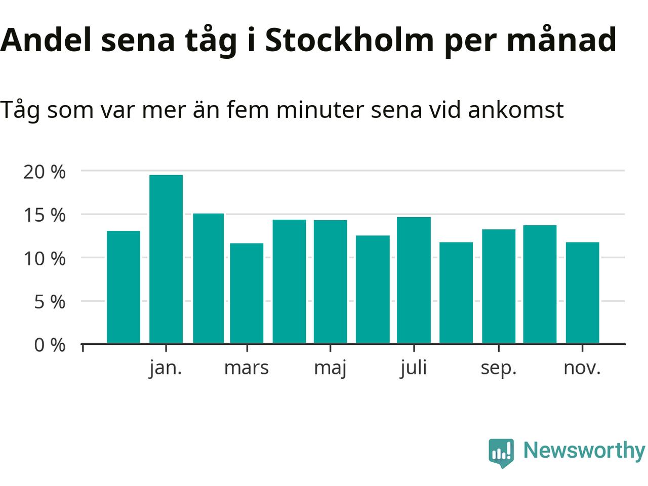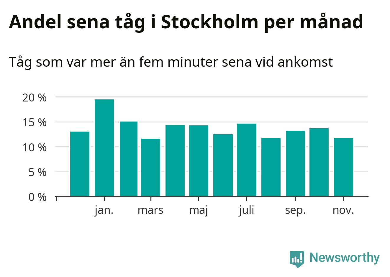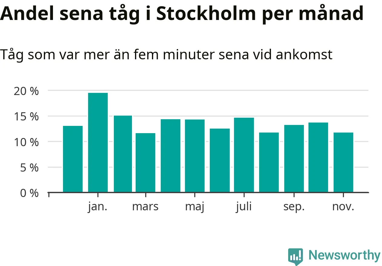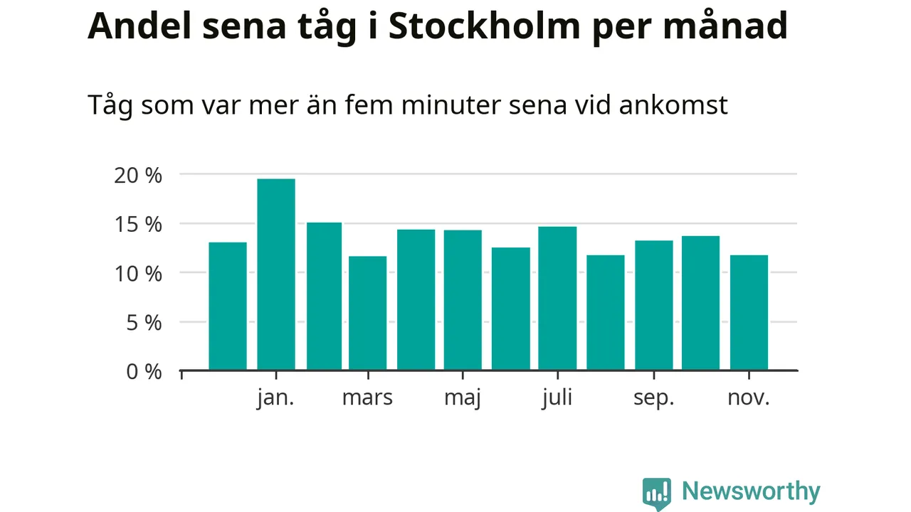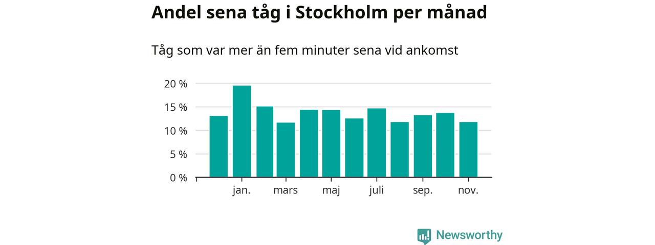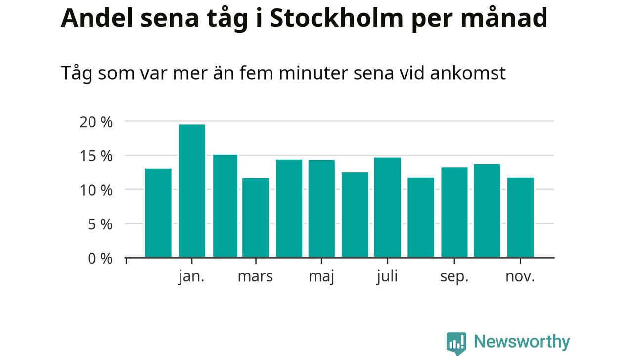Under det senaste året har 14 procent av tågen varit sena när de passerat Stockholms kommun. Ett tåg räknas här som sent om det varit mer än fem minuter efter tidtabellen.1