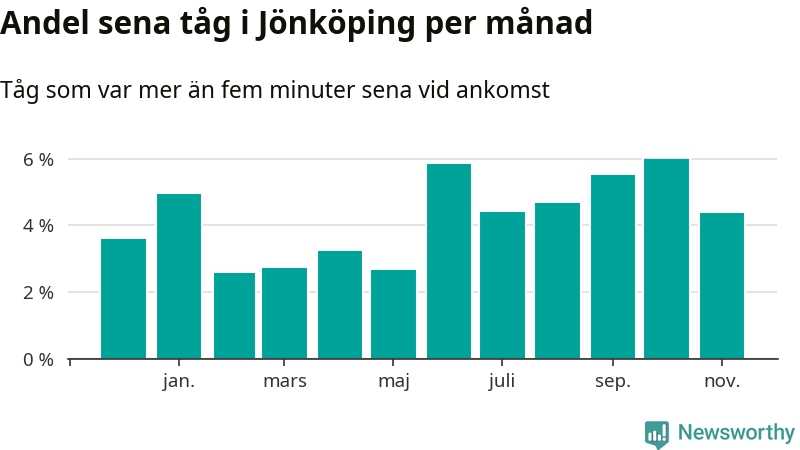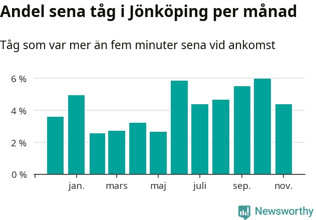 Det senaste halvåret har andelen sena tåg vid stationerna i Jönköpings kommun varit högre än halvåret innan dess. Newsworthy och Sveriges Natur har studerat tågens punktlighet det senaste året, på jakt efter järnvägens flaskhalsar.