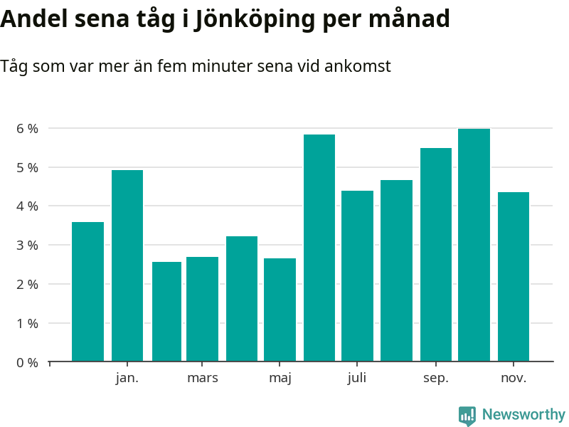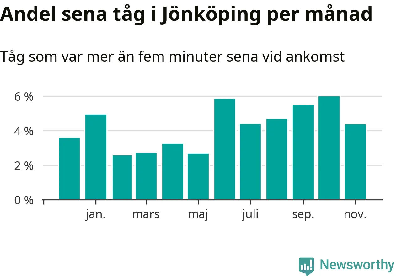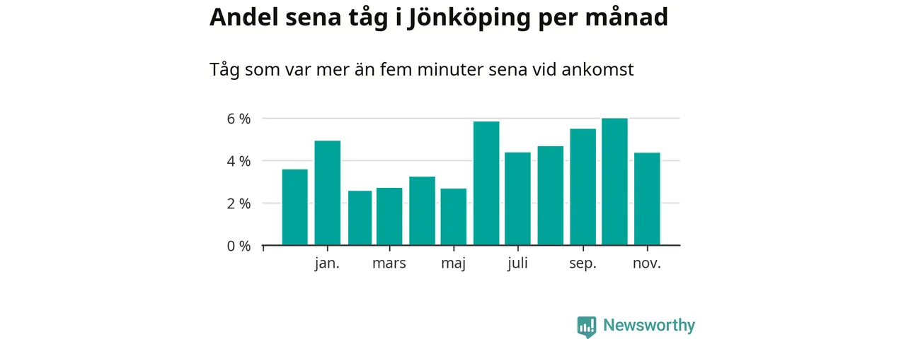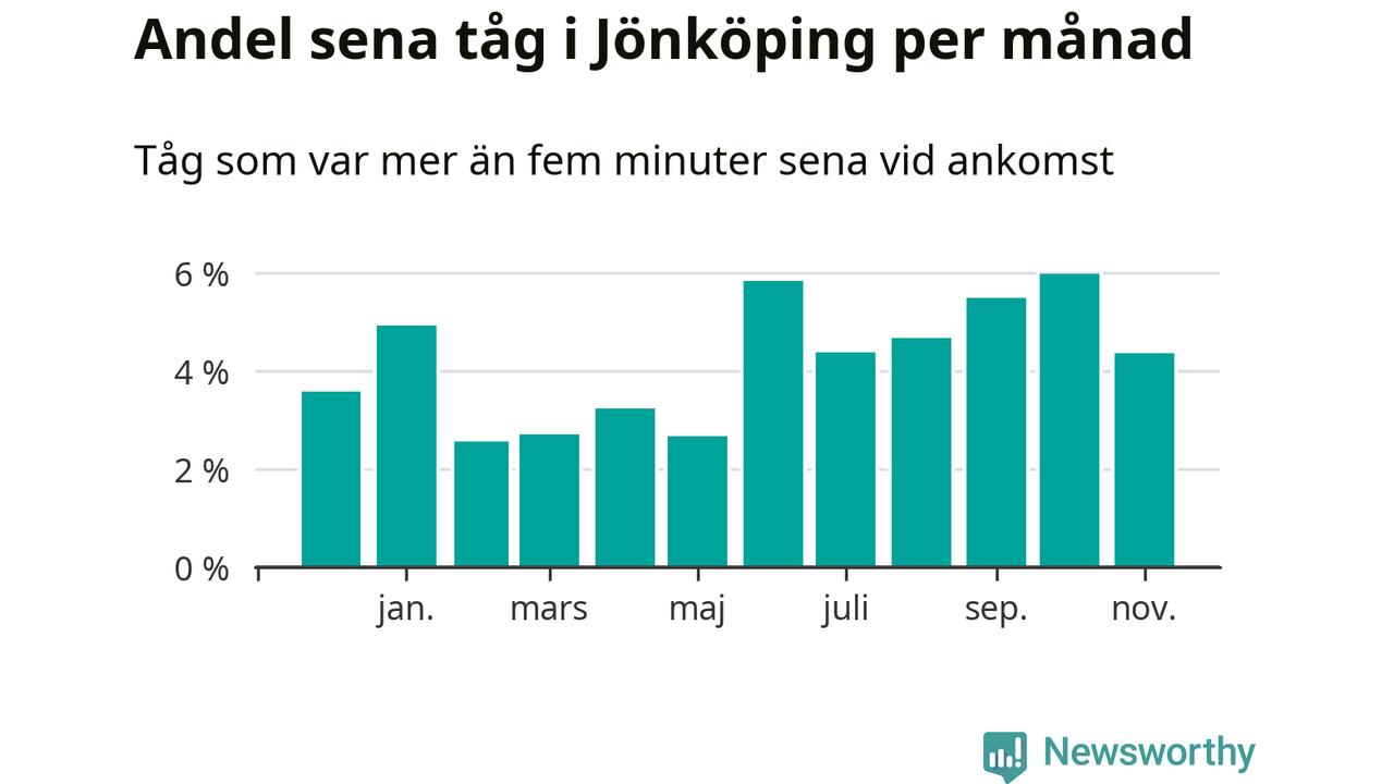 Under det senaste året har fyra procent av tågen varit sena när de passerat Jönköpings kommun. Ett tåg räknas här som sent om det varit mer än fem minuter efter tidtabellen.1