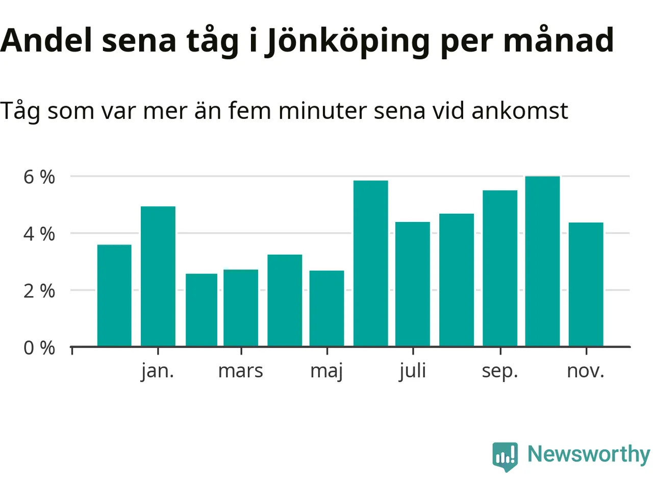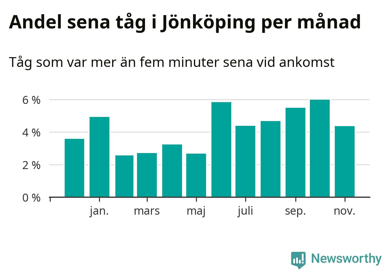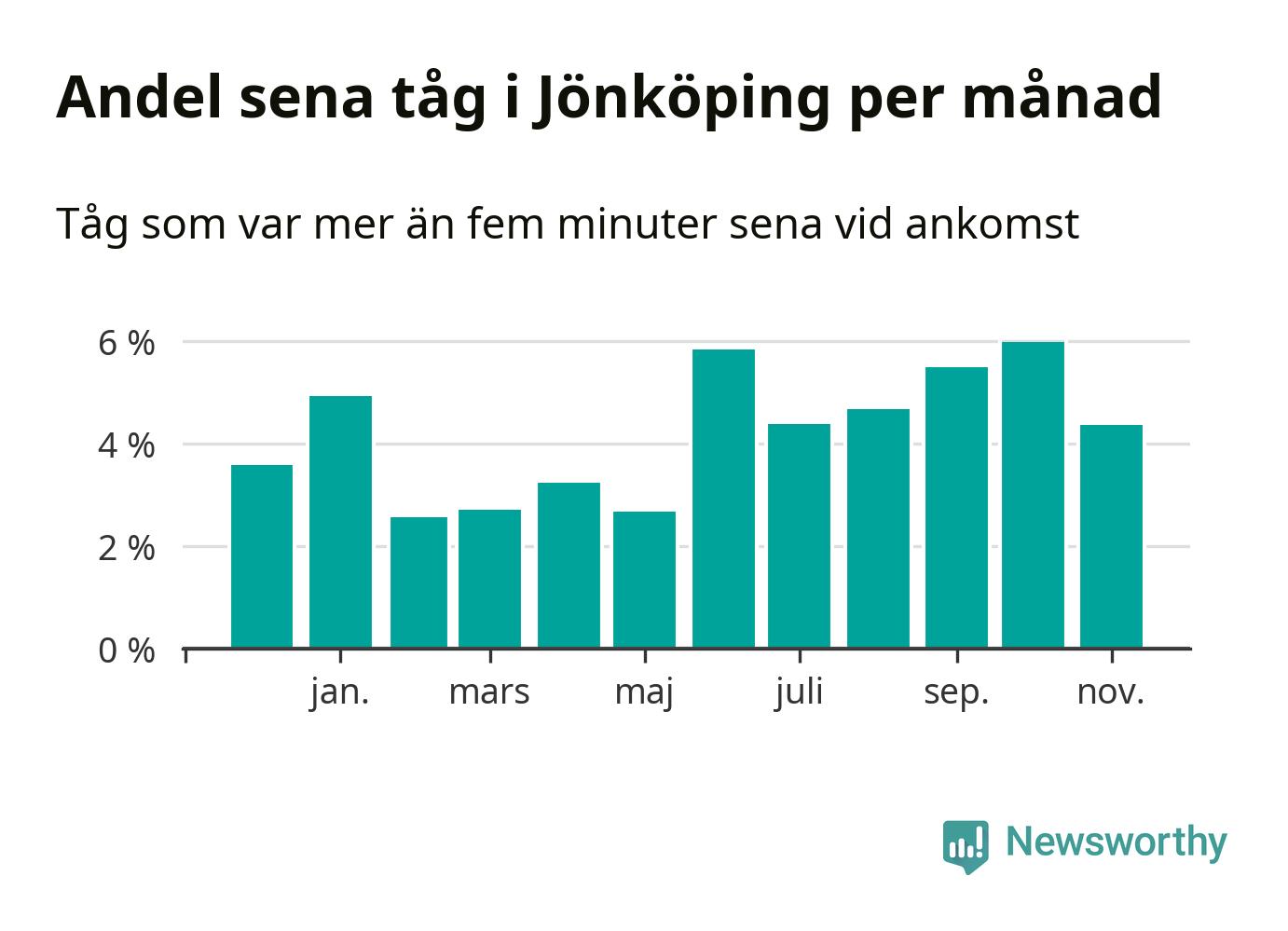 Den mest förseningsdrabbade månaden var oktober, med i snitt sex procent sena tåg enligt det måttet. Det senaste halvåret har andelen sena tåg varit högre än genomsnittet för halvåret innan dess.