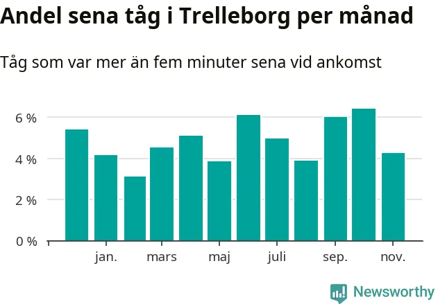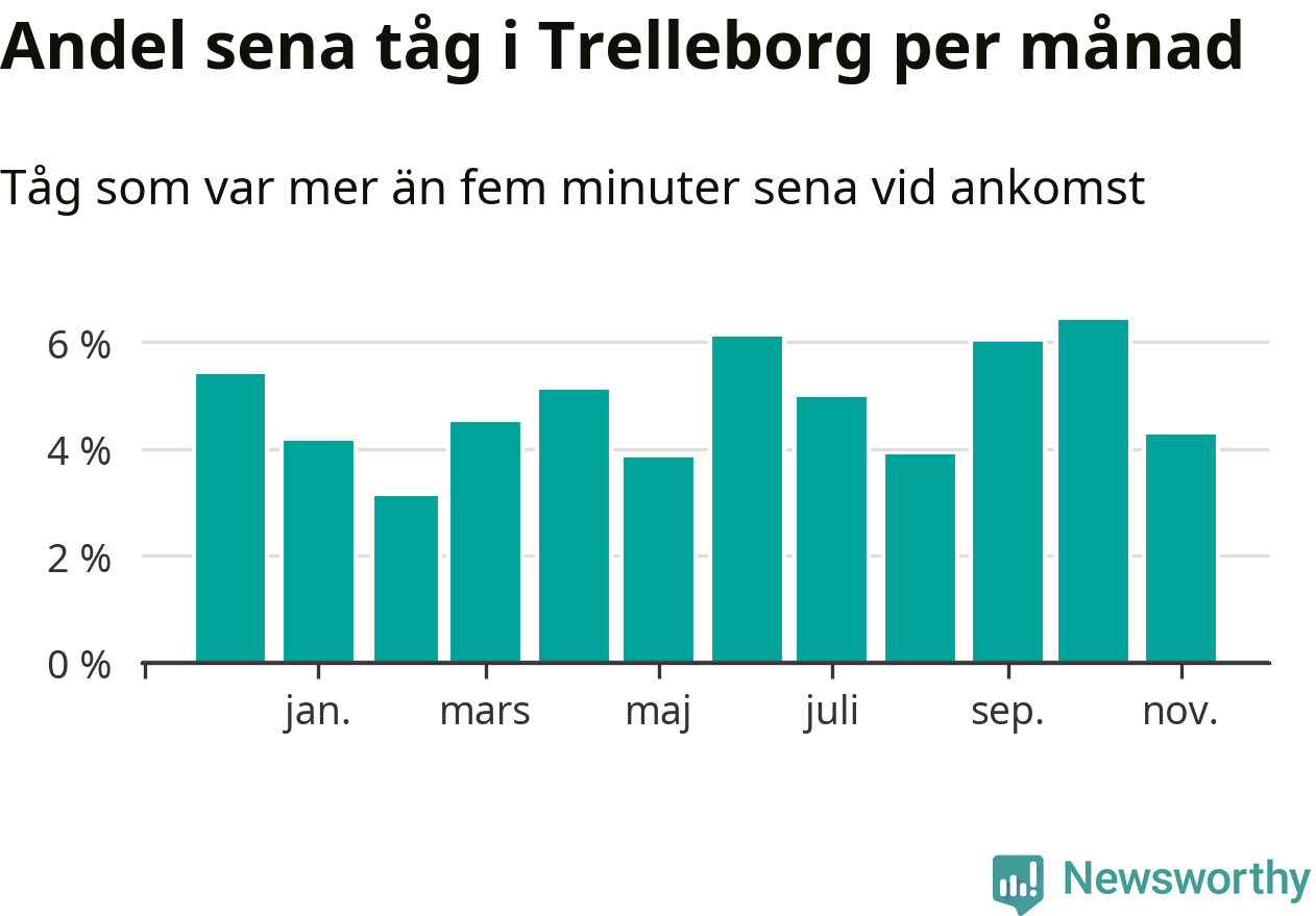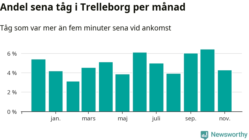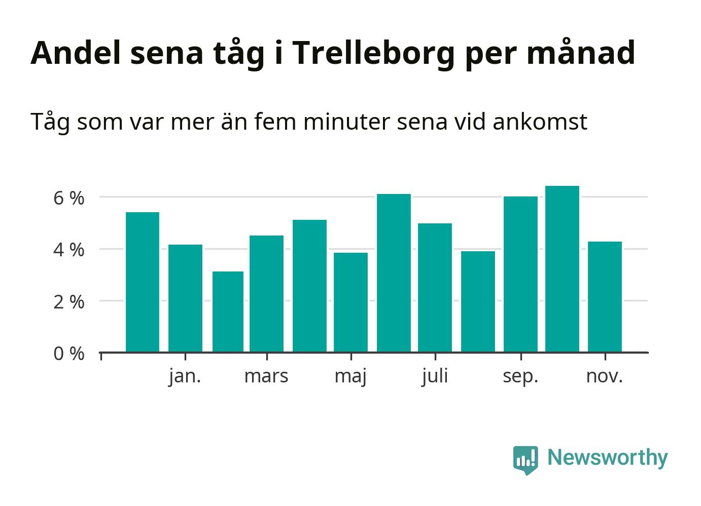 Den mest förseningsdrabbade månaden var oktober, med i snitt sex procent sena tåg enligt det måttet.