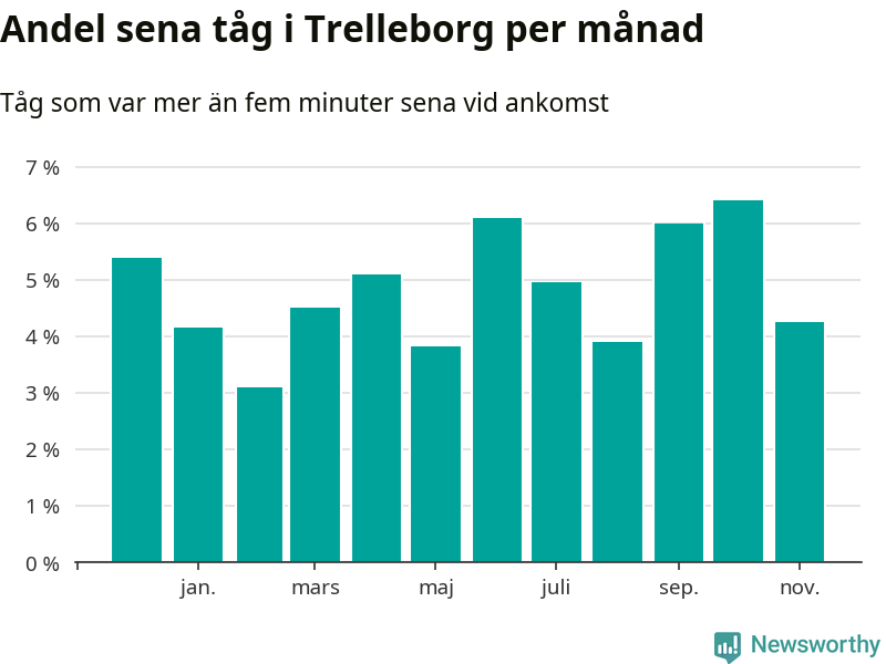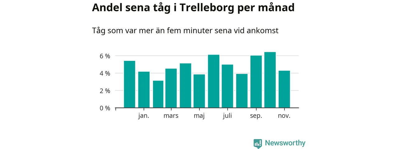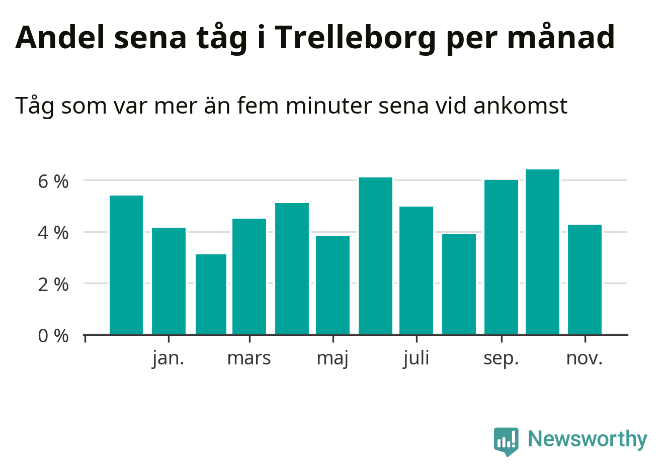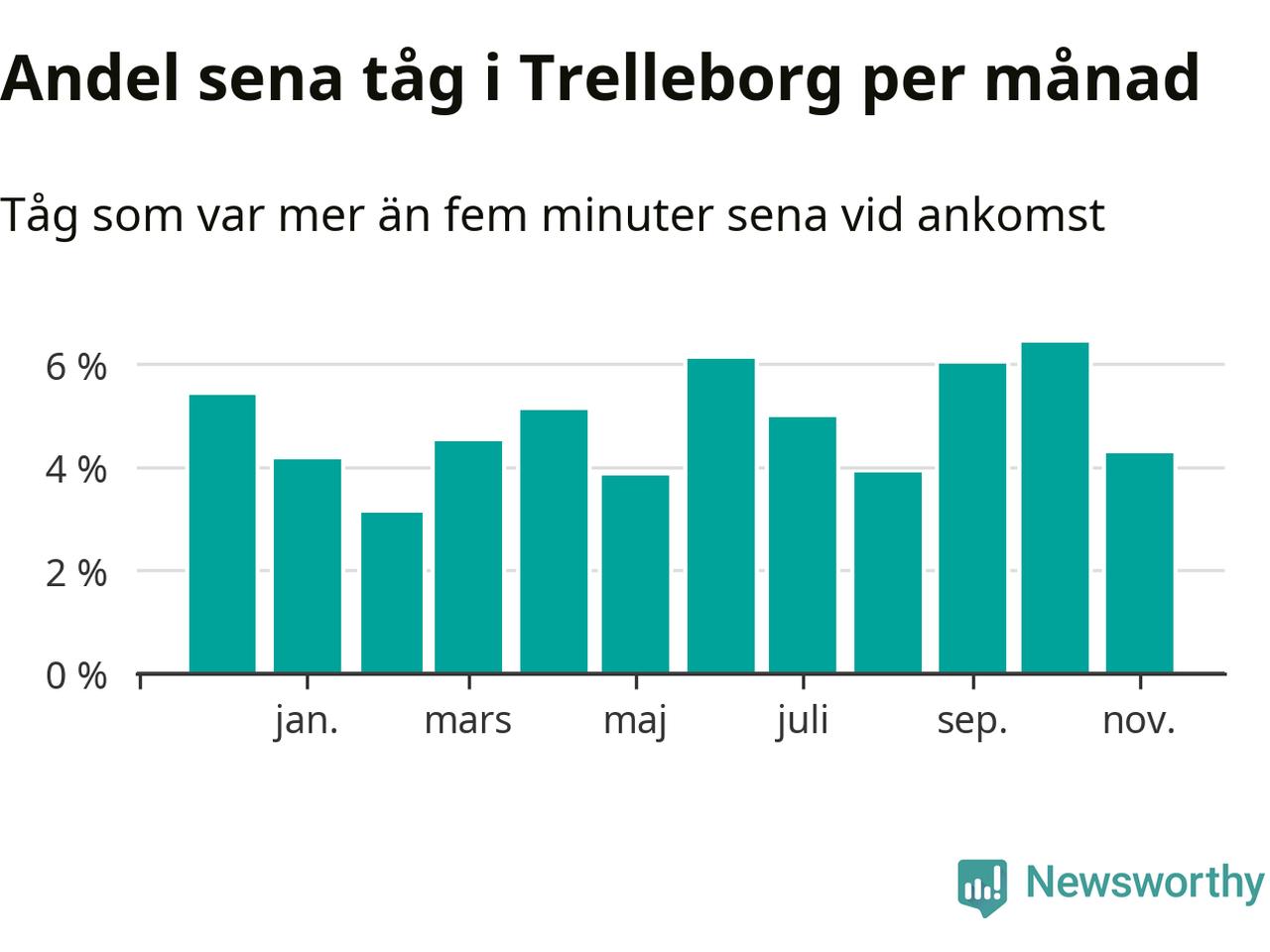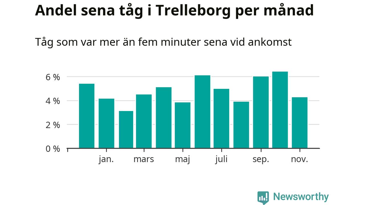Under det senaste året har fem procent av tågen varit sena när de passerat Trelleborgs station. Ett tåg räknas här som sent om det varit mer än fem minuter efter tidtabellen.1