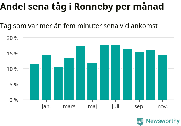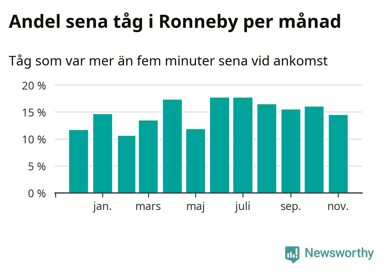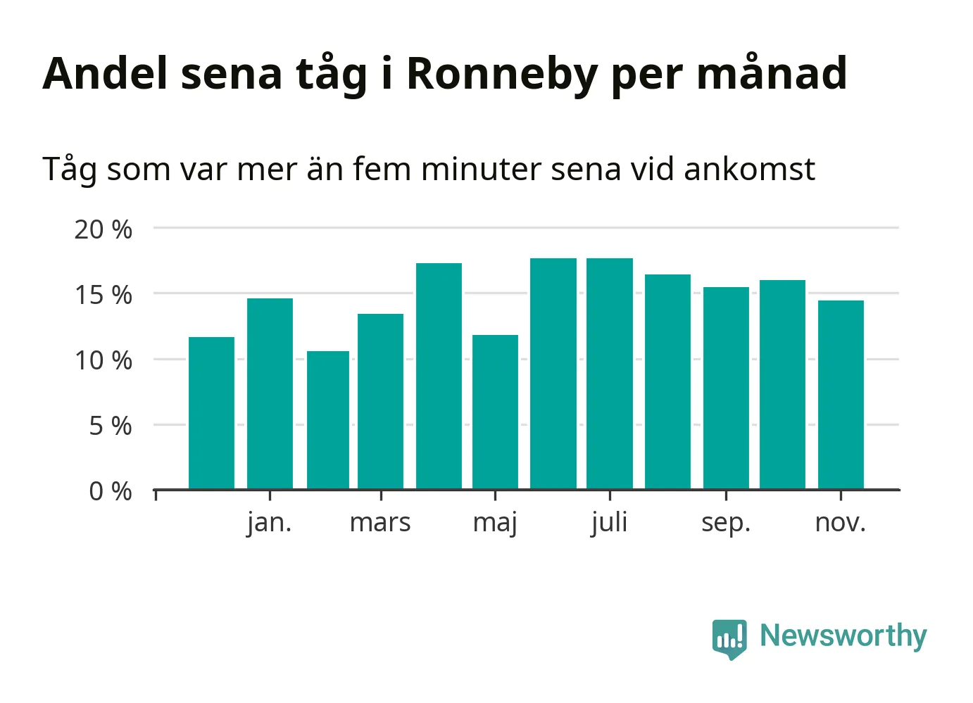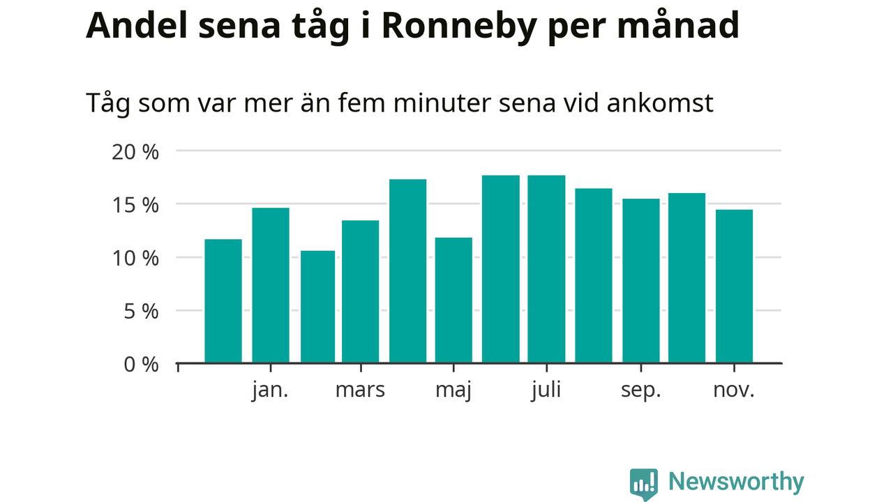 Den svenska järnvägsbranschen och Trafikverket har ett gemensamt mål om att 95 procent av tågen ska komma fram med högst fem minuters försening till sin slutstation. Dit är det långt i de flesta delar av landet. I Ronneby var förseningarna färre än 5 procent under endast en vecka av 52 det senaste året. Det ska noteras att siffrorna i den här artikeln skiljer sig från det officiella punktlighetsmåttet, som bara beaktar ankomster till slutstationer, och där insamlingen sker på ett annat sätt än i den här artikeln.