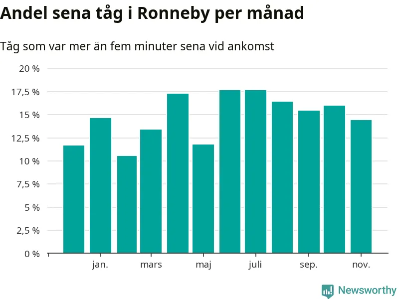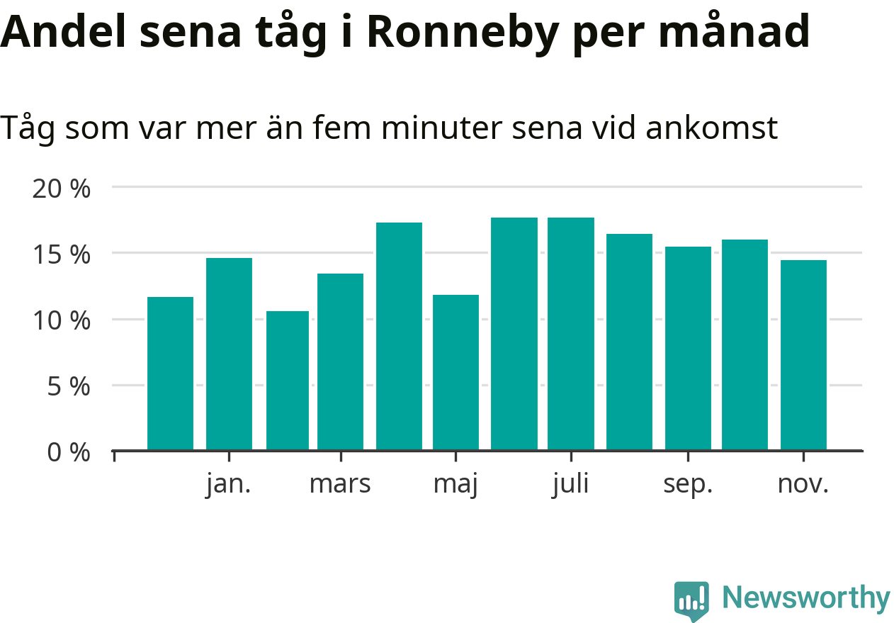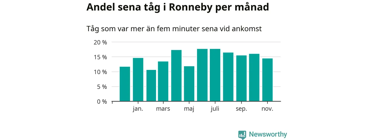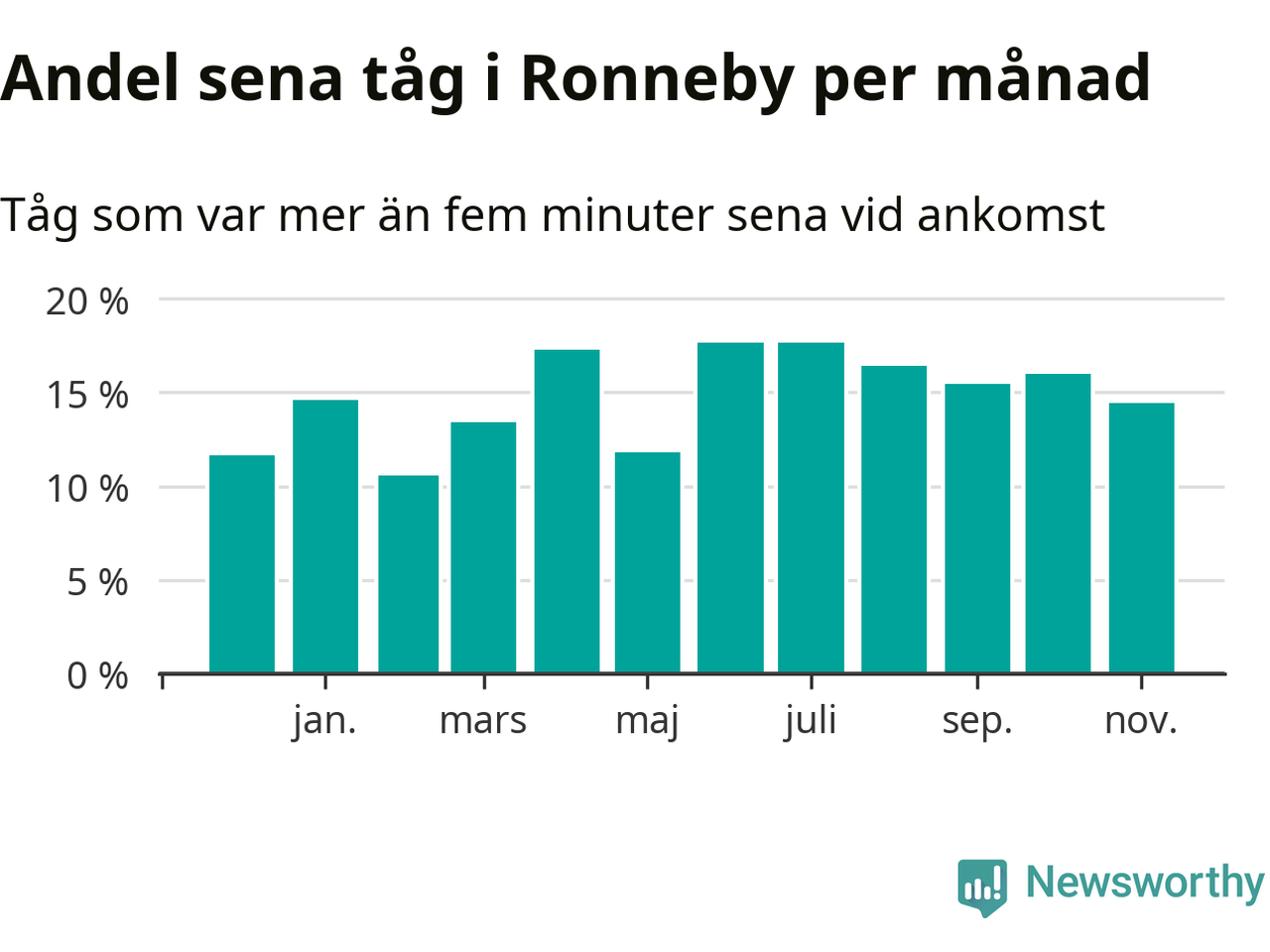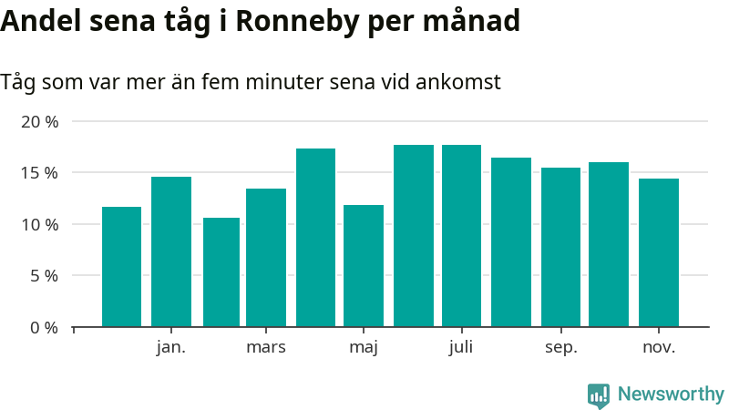 Den svenska järnvägsbranschen och Trafikverket har ett gemensamt mål om att 95 procent av tågen ska komma fram med högst fem minuters försening till sin slutstation. Dit är det långt i de flesta delar av landet. I Ronneby var förseningarna färre än 5 procent under endast en vecka av 52 det senaste året. Det ska noteras att siffrorna i den här artikeln skiljer sig från det officiella punktlighetsmåttet, som bara beaktar ankomster till slutstationer, och där insamlingen sker på ett annat sätt än i den här artikeln.