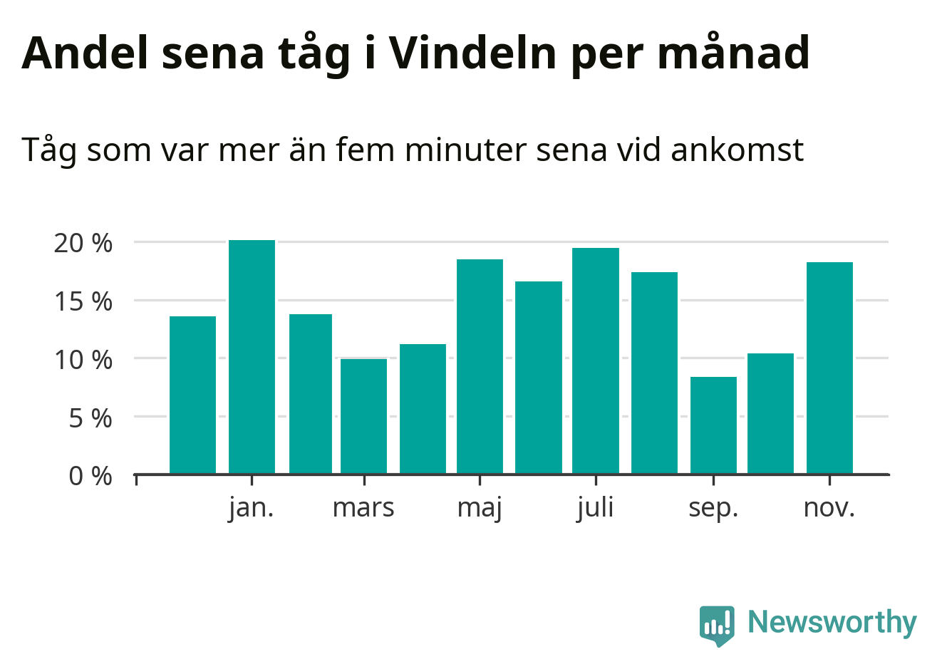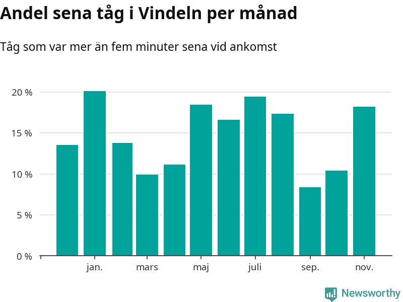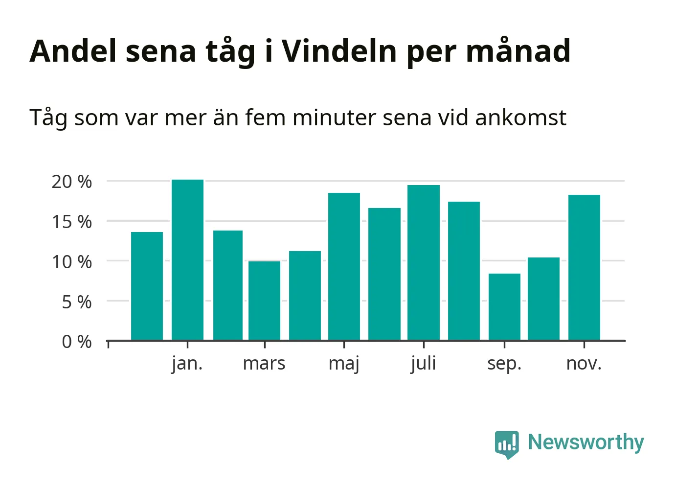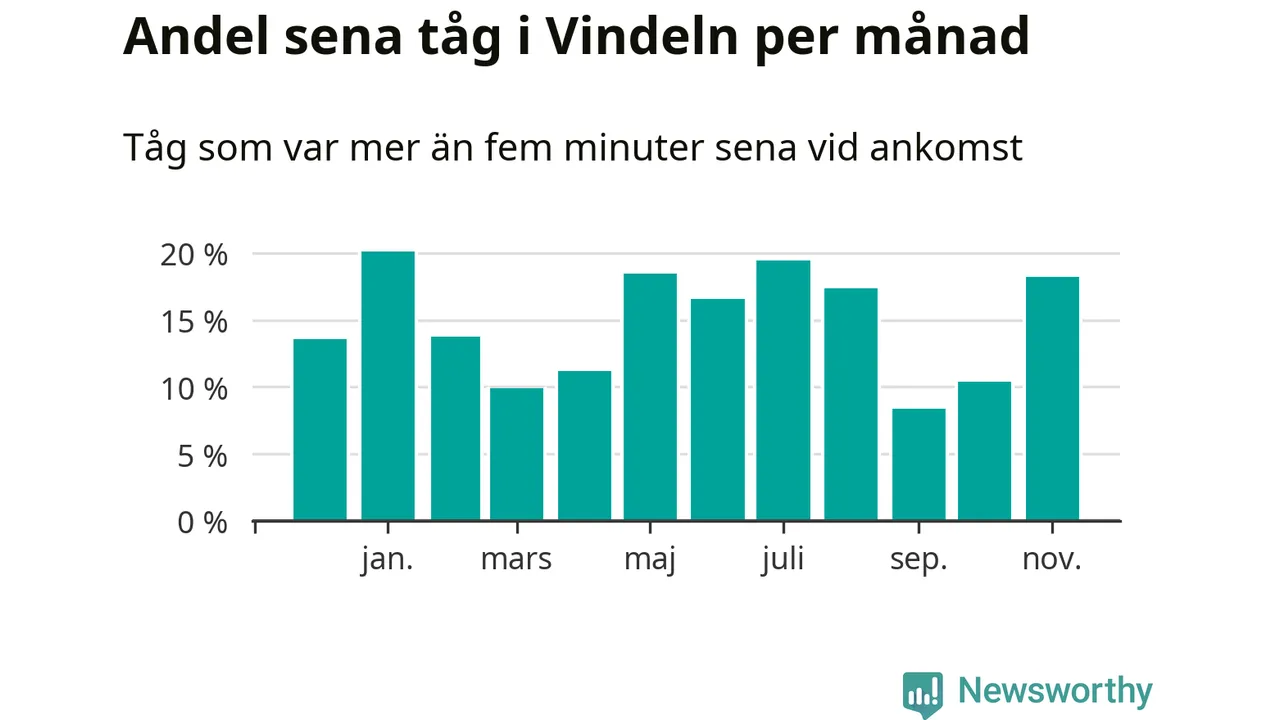 Den mest förseningsdrabbade månaden var januari, med i snitt 20 procent sena tåg enligt det måttet.
