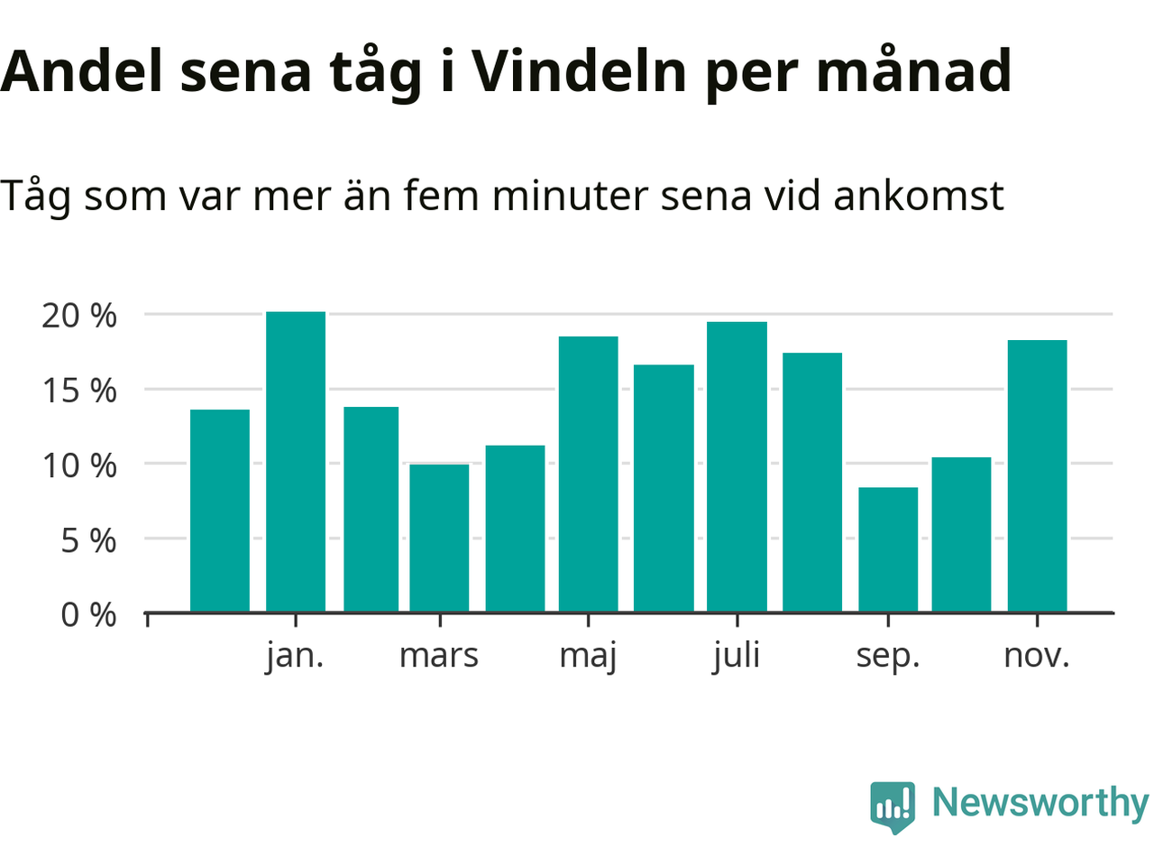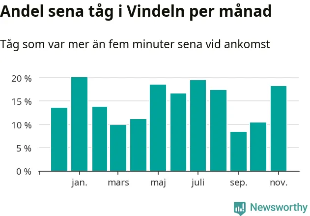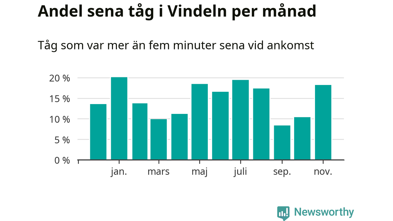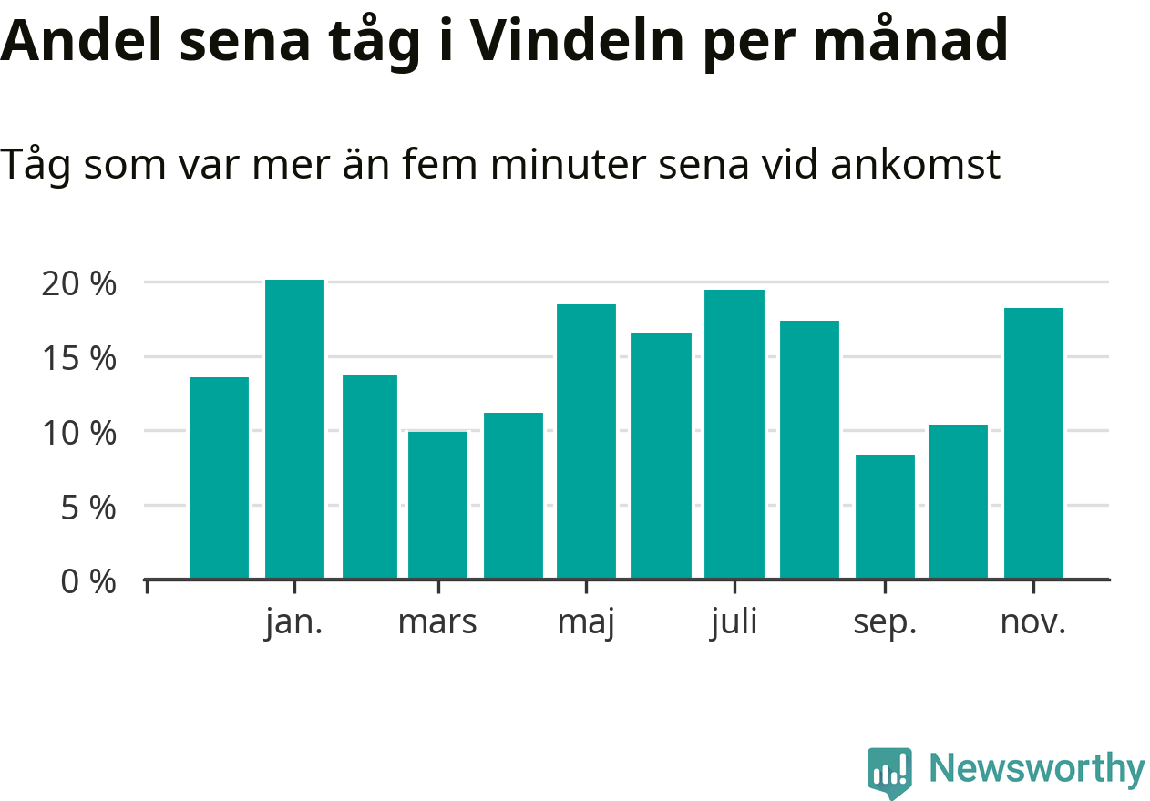 Den mest förseningsdrabbade månaden var januari, med i snitt 20 procent sena tåg enligt det måttet.