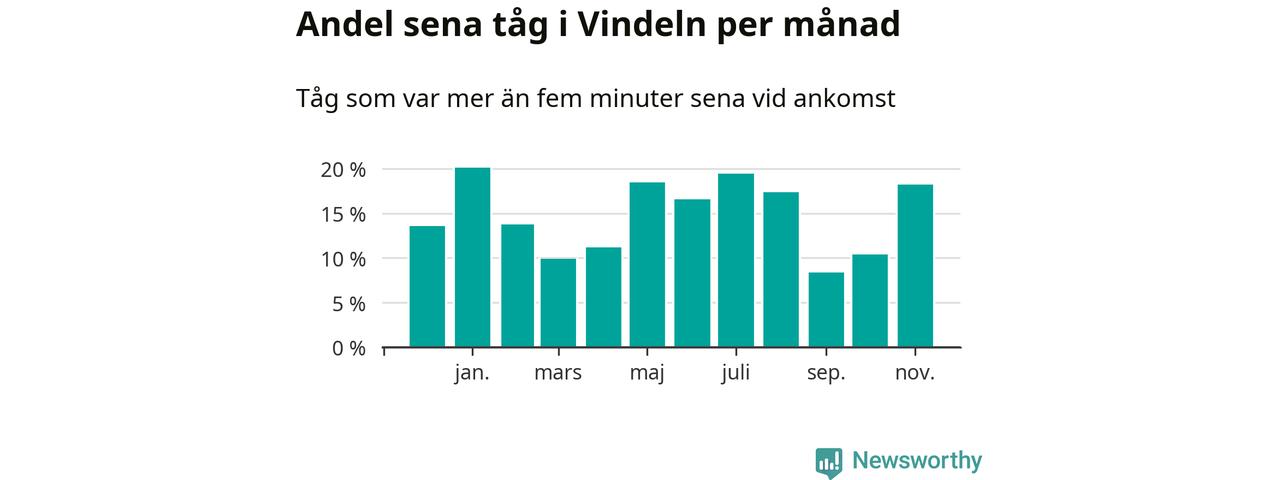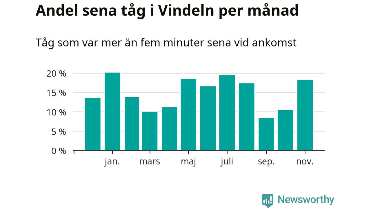Under det senaste året har 15 procent av tågen varit sena när de passerat Hällnäs, Tvärålund eller Vindeln i Vindelns kommun. Ett tåg räknas här som sent om det varit mer än fem minuter efter tidtabellen.1