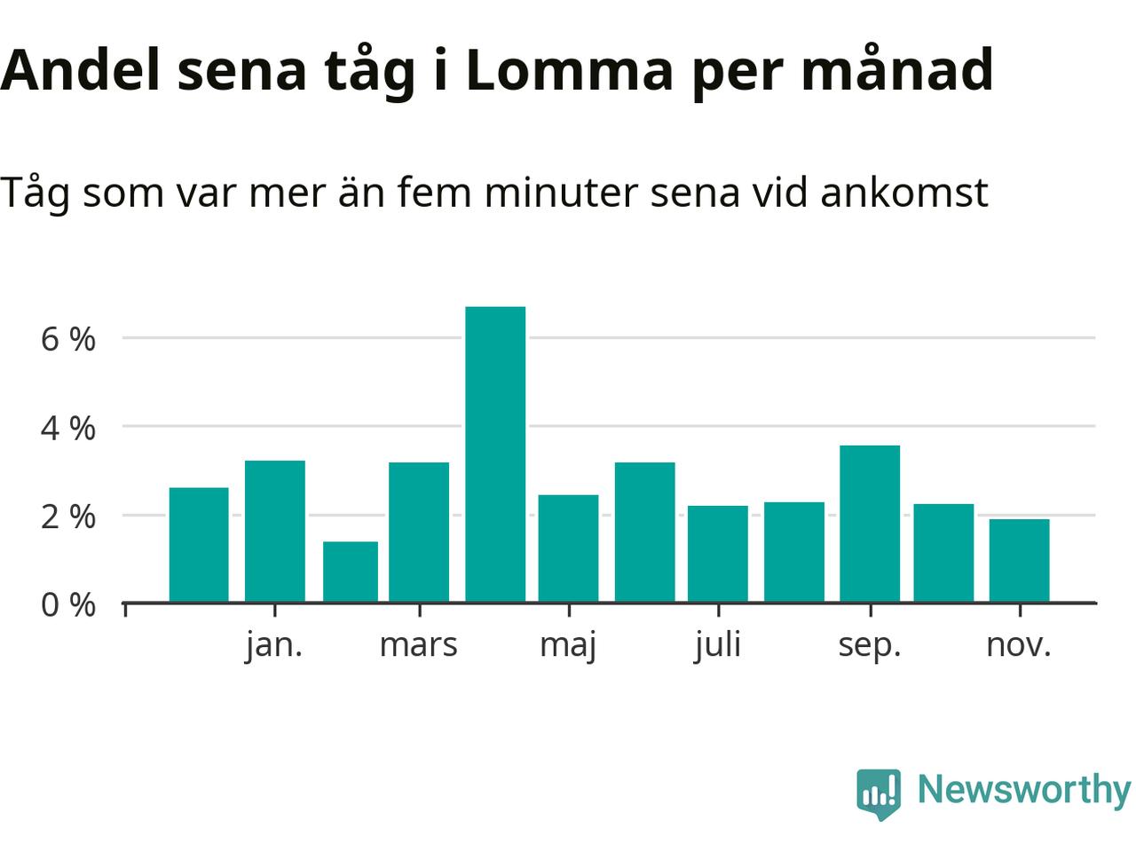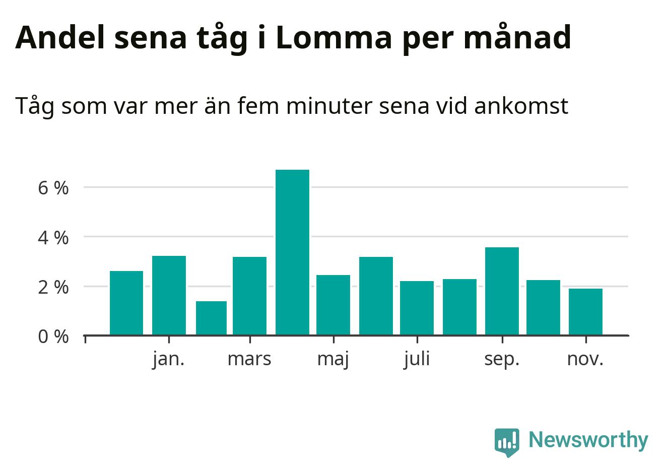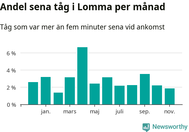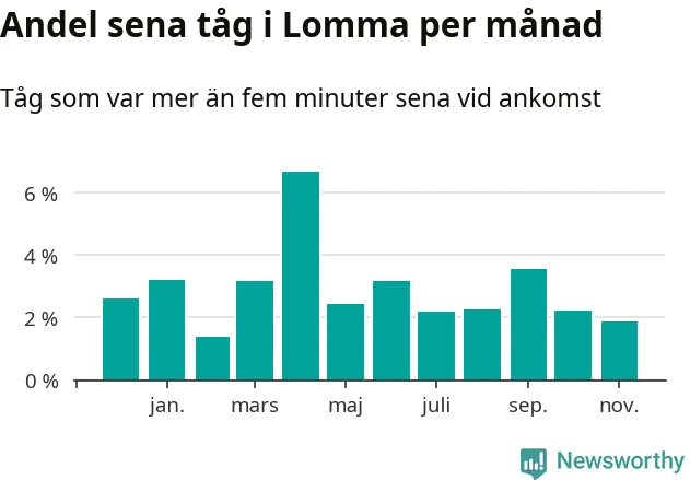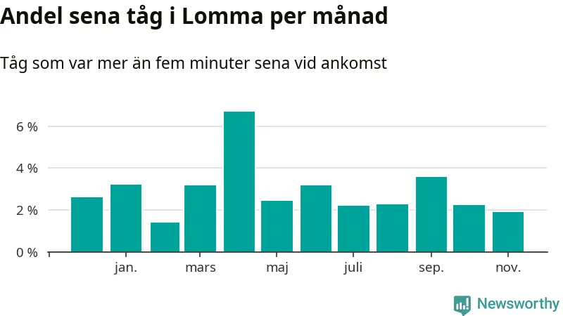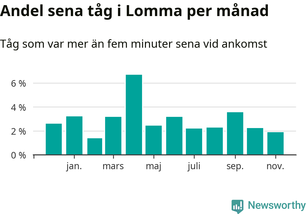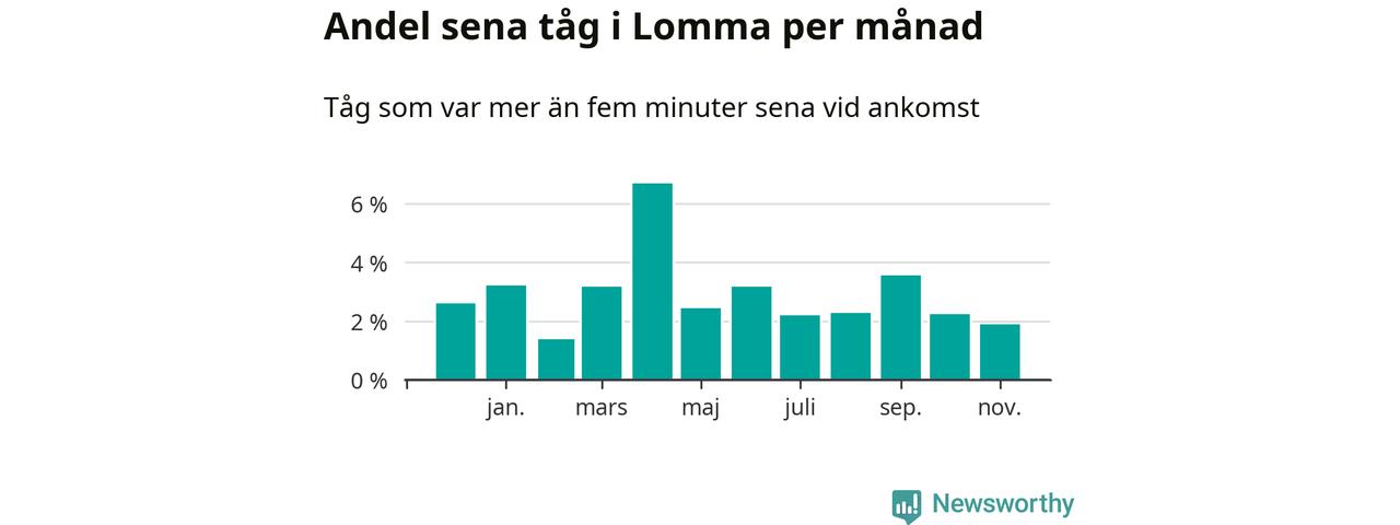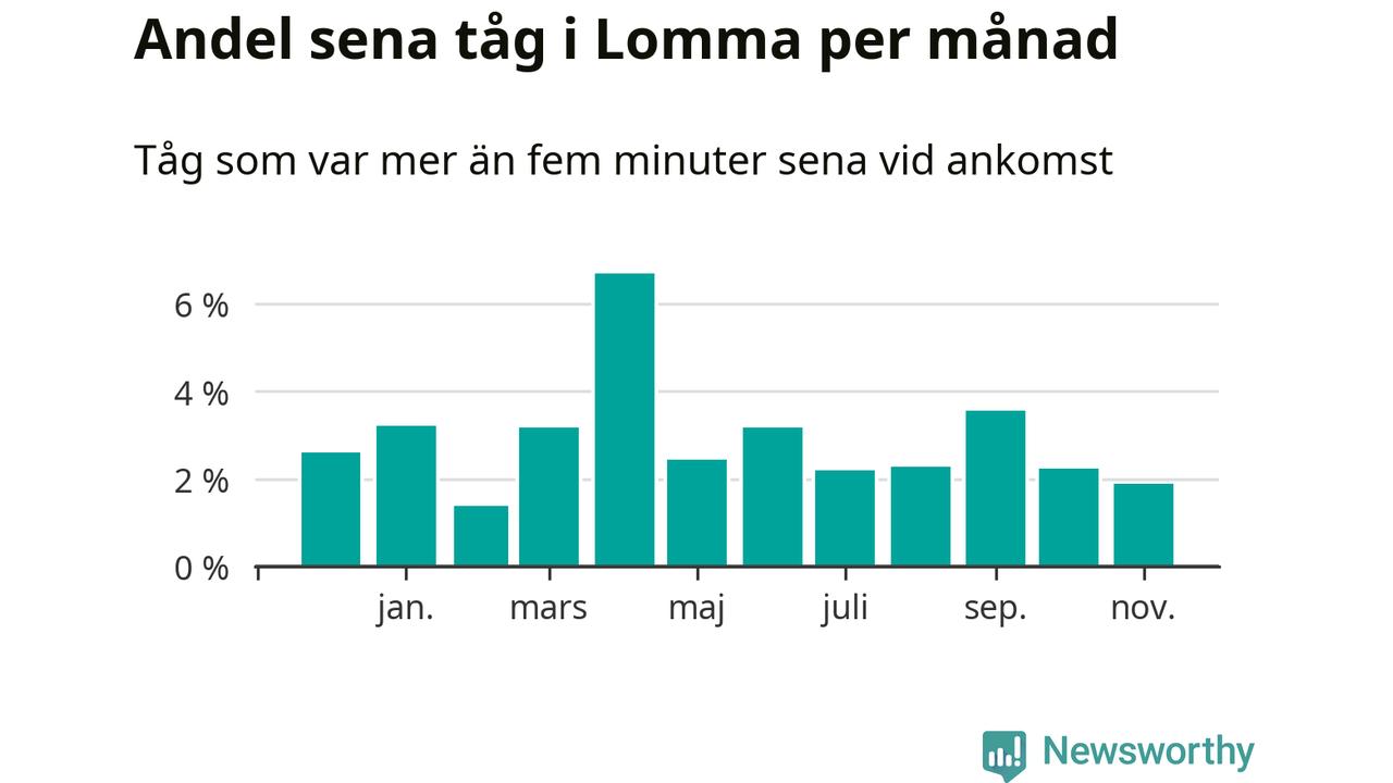 Den svenska järnvägsbranschen och Trafikverket har ett gemensamt mål om att 95 procent av tågen ska komma fram med högst fem minuters försening till sin slutstation. För Lommas del skulle man alltså kunna säga att tågtrafiken legat på rätt sida målgränsen det senaste året, även om det officiella punktlighetsmåttet (ankomst till slutstation) inte är rakt av jämförbart med det som används i den här artikeln (där vi tittar på alla tåg som passerar en station).