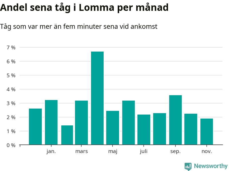 Under det senaste året har tre procent av tågen varit sena när de passerat Lomma station. Ett tåg räknas här som sent om det varit mer än fem minuter efter tidtabellen.1