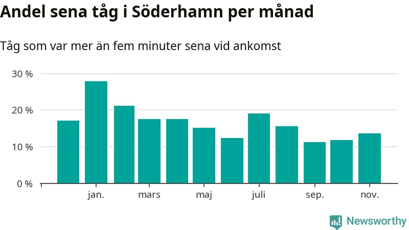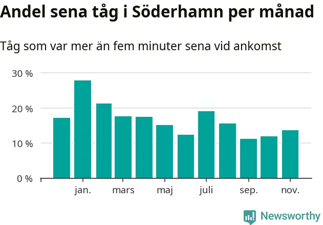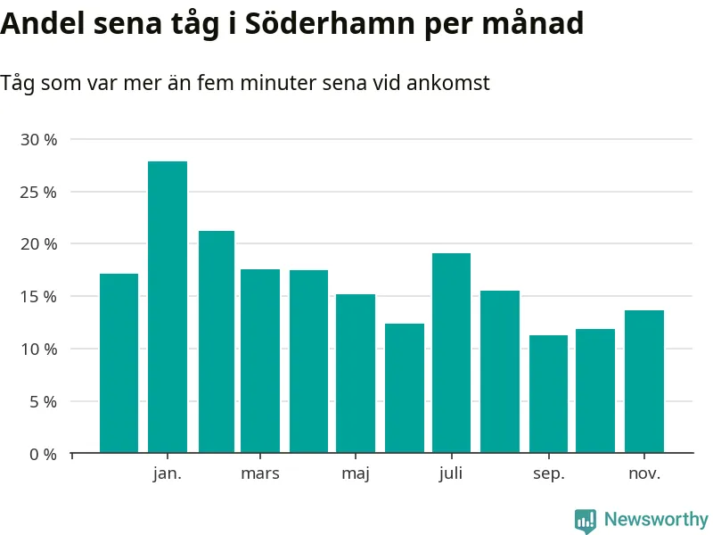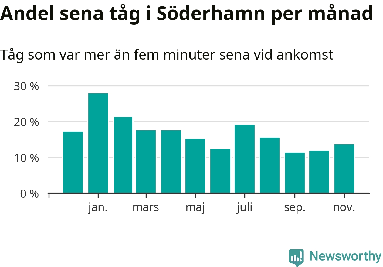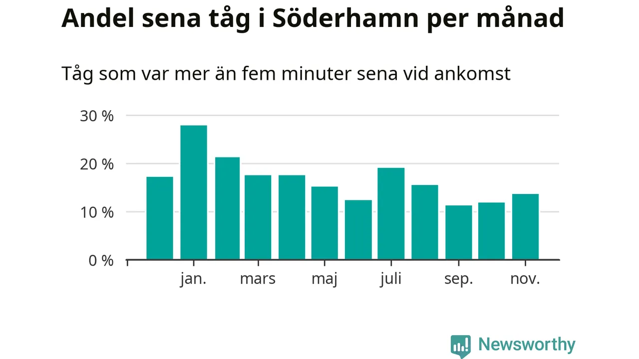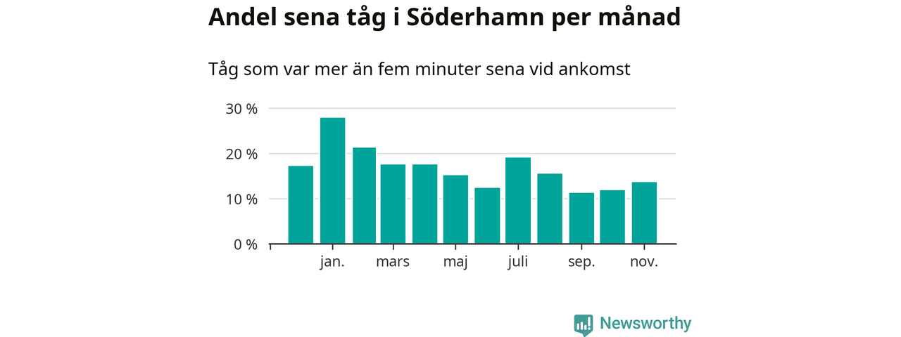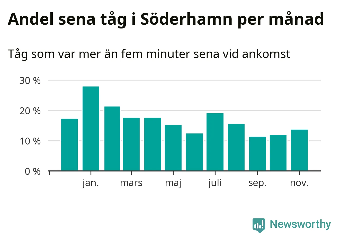Den mest förseningsdrabbade månaden var januari, med i snitt 28 procent sena tåg enligt det måttet. Det senaste halvåret har andelen sena tåg varit lägre än halvåret innan dess.