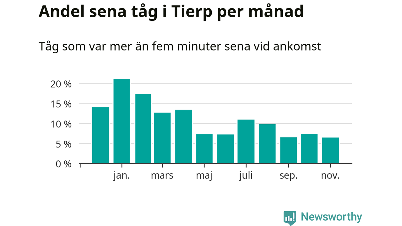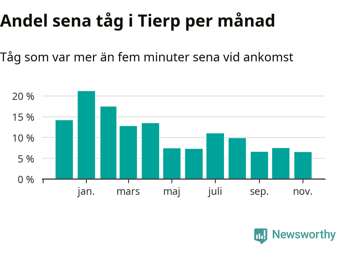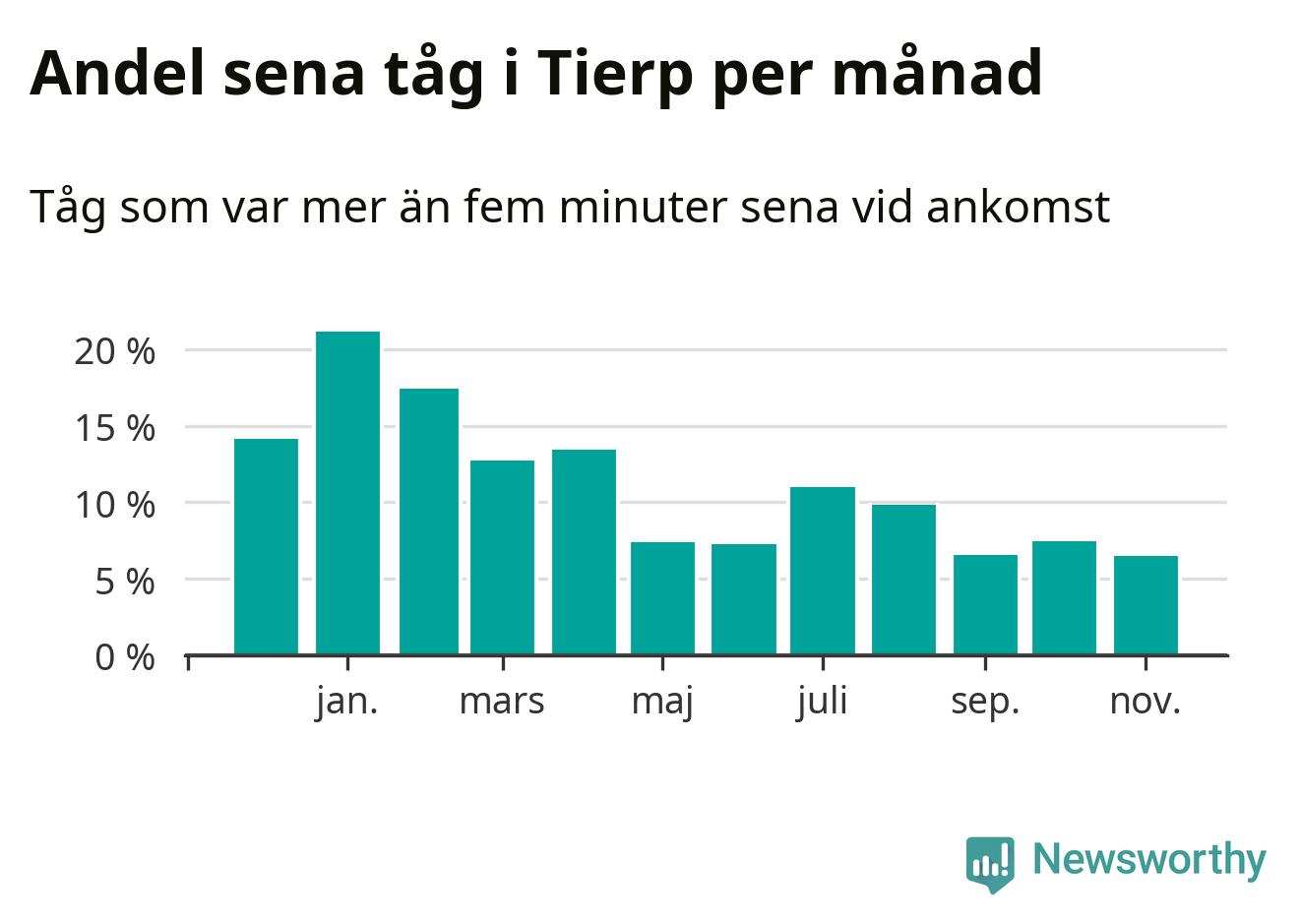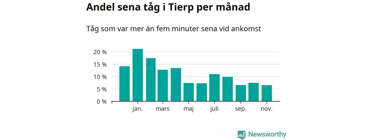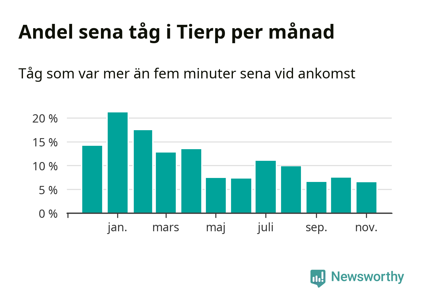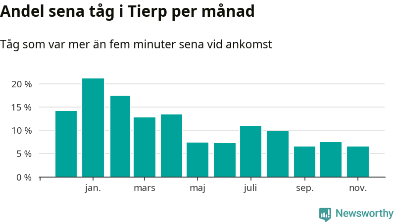 Den svenska järnvägsbranschen och Trafikverket har ett gemensamt mål om att 95 procent av tågen ska komma fram med högst fem minuters försening till sin slutstation. Dit är det långt i de flesta delar av landet. I Tierp var förseningarna färre än 5 procent under endast två veckor av 52 det senaste året. Det ska noteras att siffrorna i den här artikeln skiljer sig från det officiella punktlighetsmåttet, som bara beaktar ankomster till slutstationer, och där insamlingen sker på ett annat sätt än i den här artikeln.
