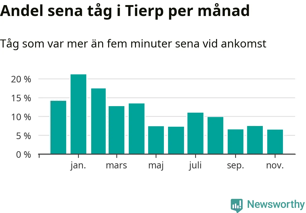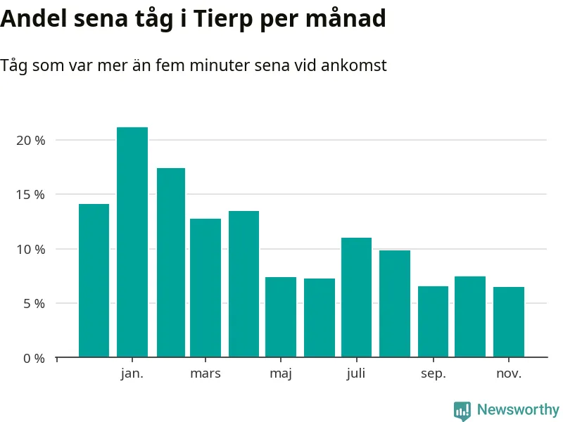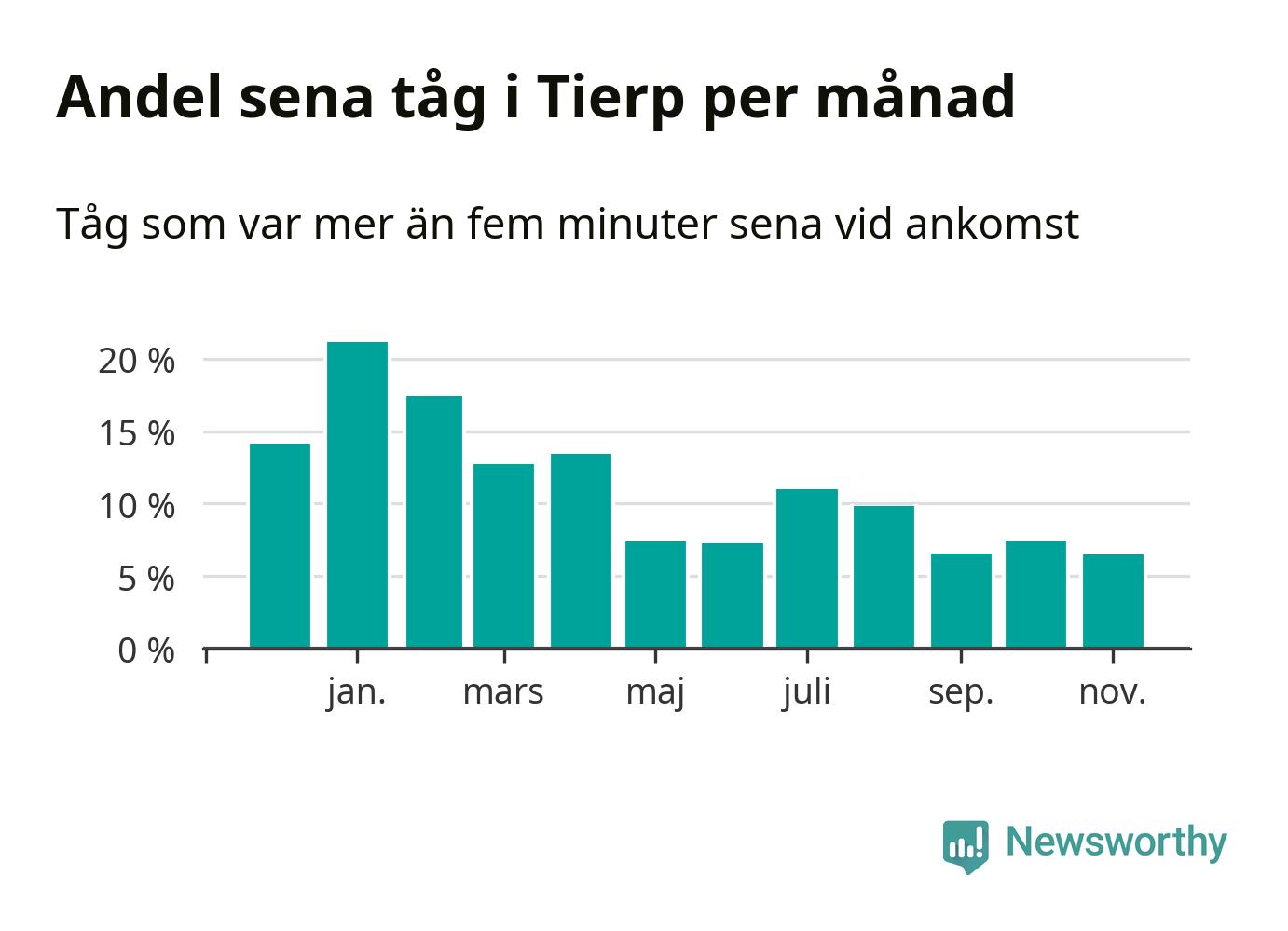 Den mest förseningsdrabbade månaden var januari, med i snitt 21 procent sena tåg enligt det måttet. Det senaste halvåret har andelen sena tåg varit lägre än halvåret innan dess.
