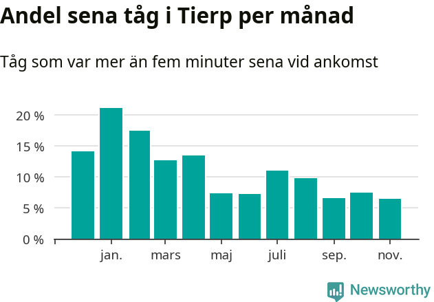 Det senaste halvåret har andelen sena tåg vid stationerna i Tierps kommun varit lägre än halvåret innan dess. Newsworthy och Sveriges Natur har studerat tågens punktlighet det senaste året, på jakt efter järnvägens flaskhalsar.