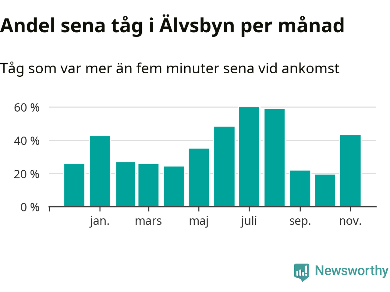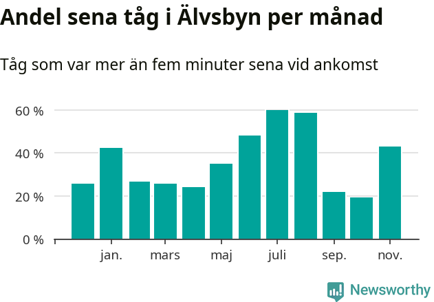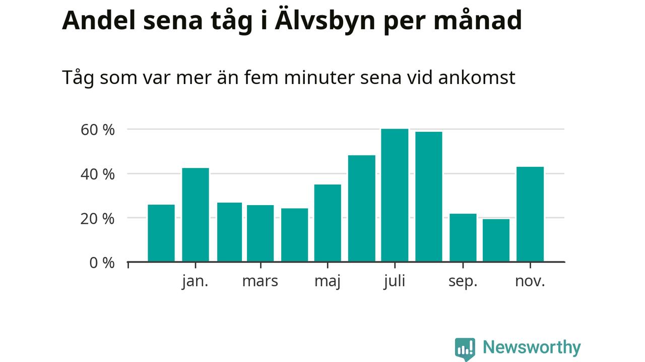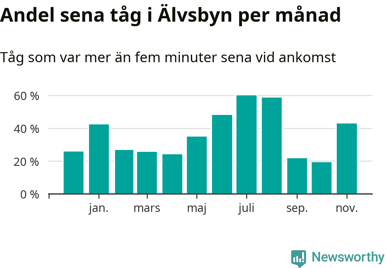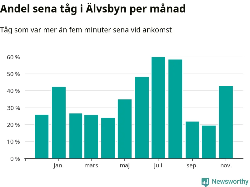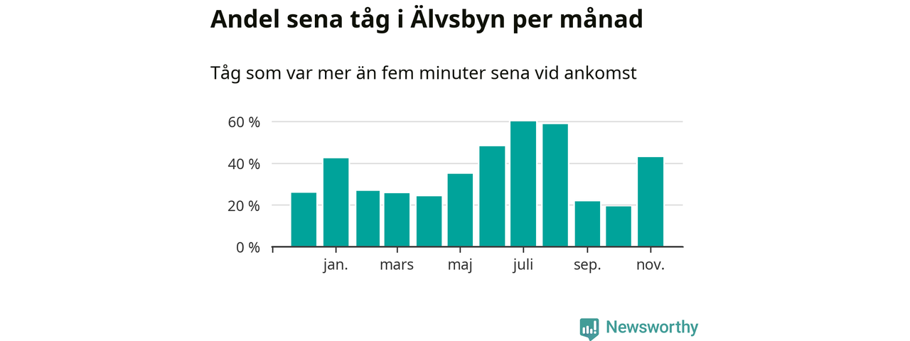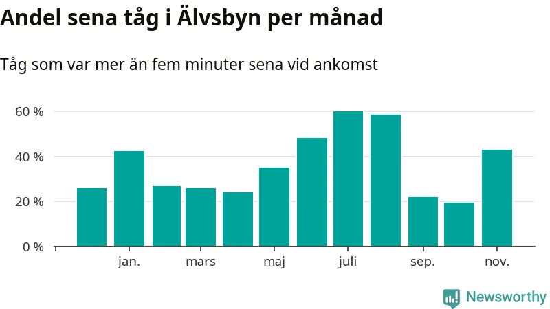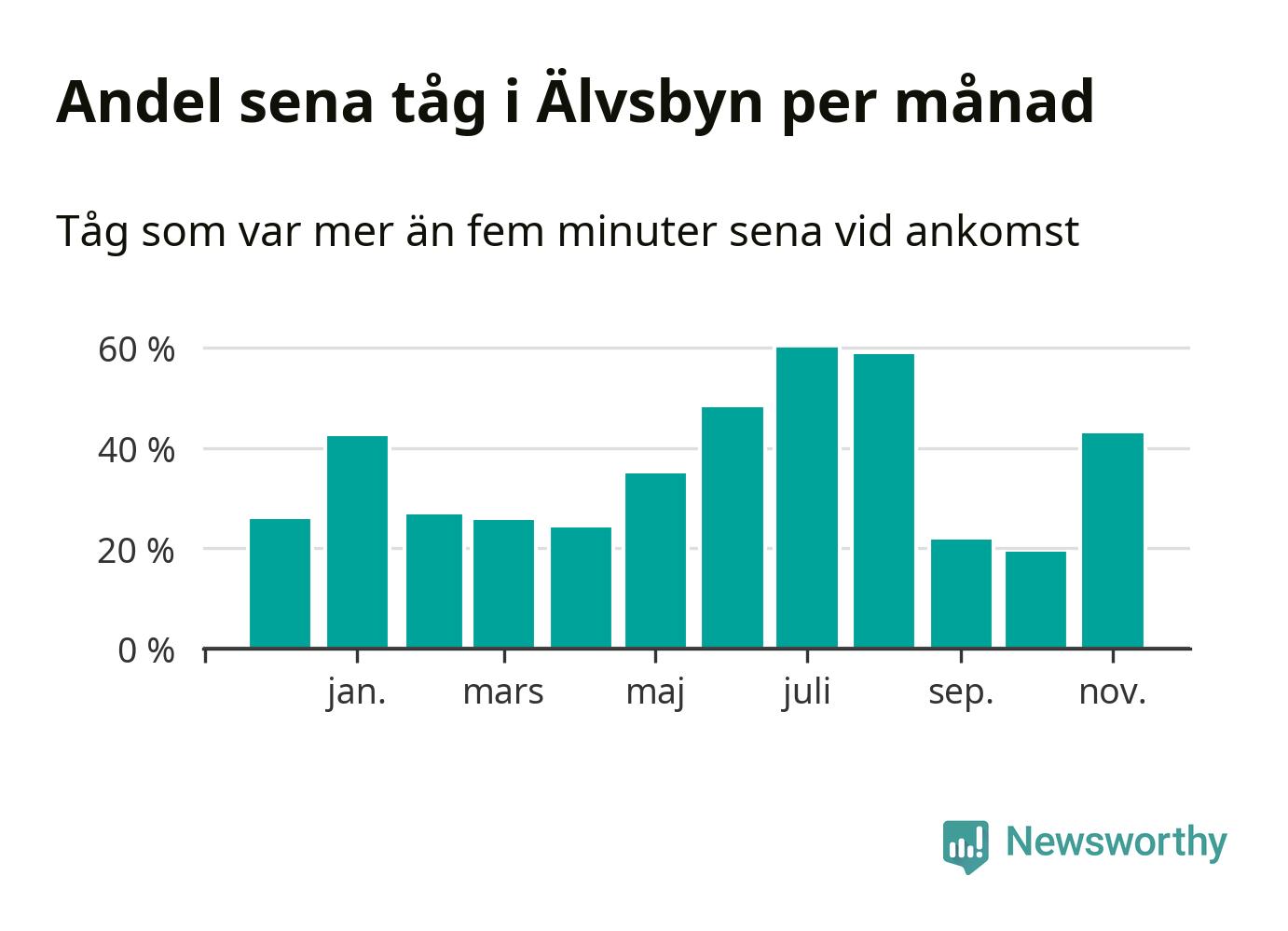 Den mest förseningsdrabbade månaden var juli, med i snitt 60 procent sena tåg enligt det måttet.