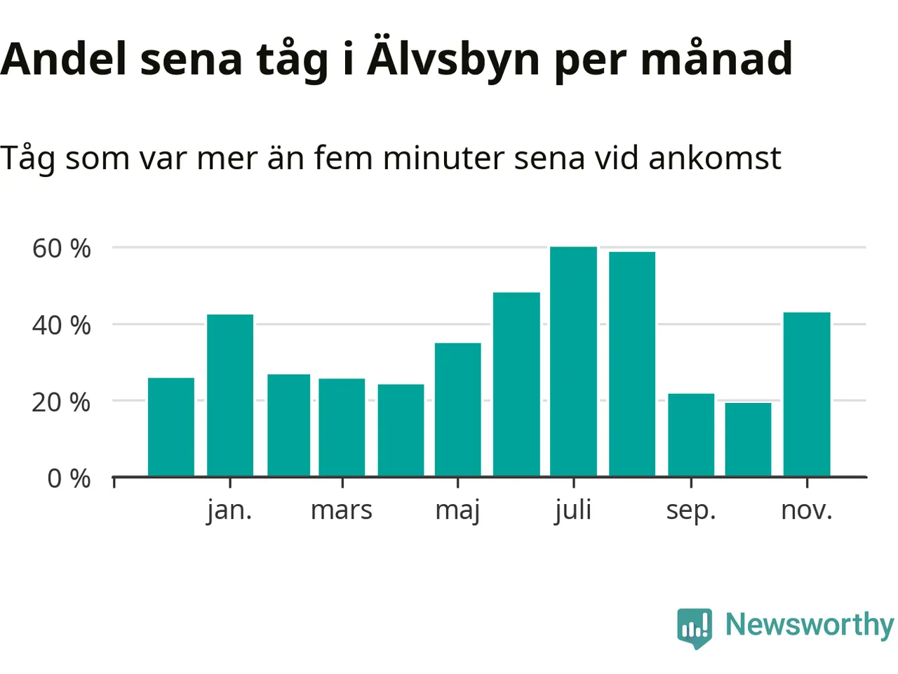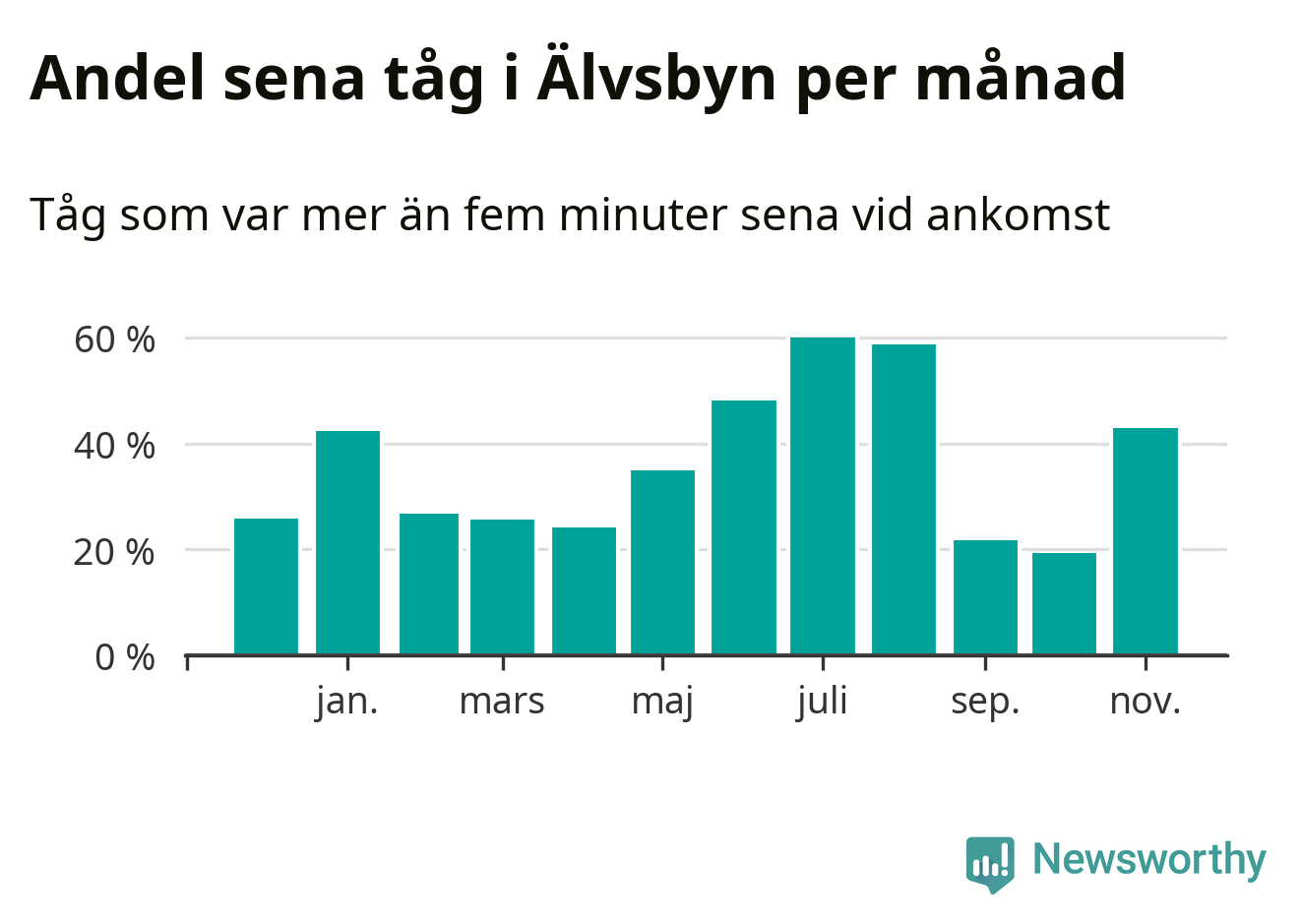 Under det senaste året har 35 procent av tågen varit sena när de passerat Älvsbyns station. Ett tåg räknas här som sent om det varit mer än fem minuter efter tidtabellen.1