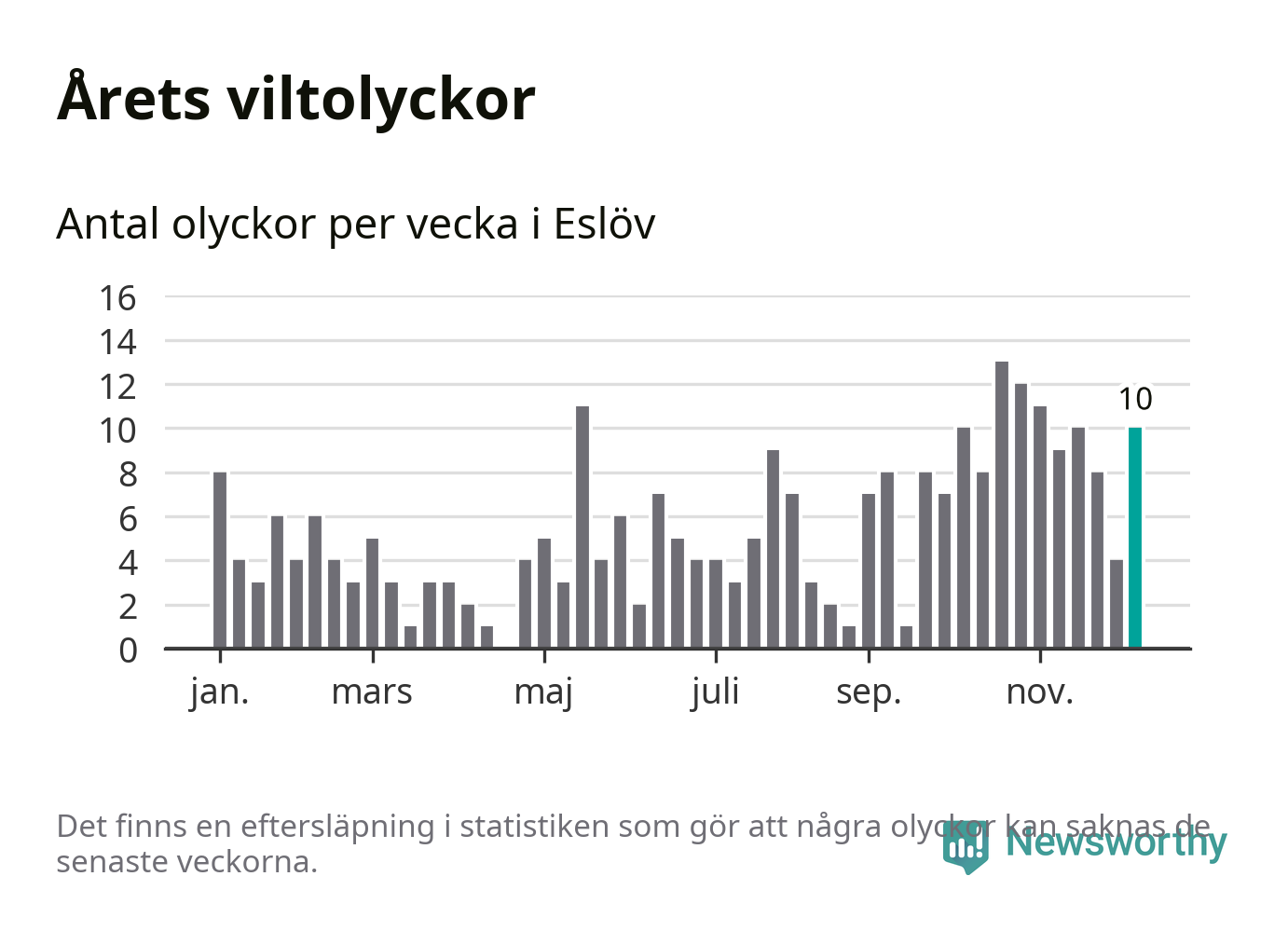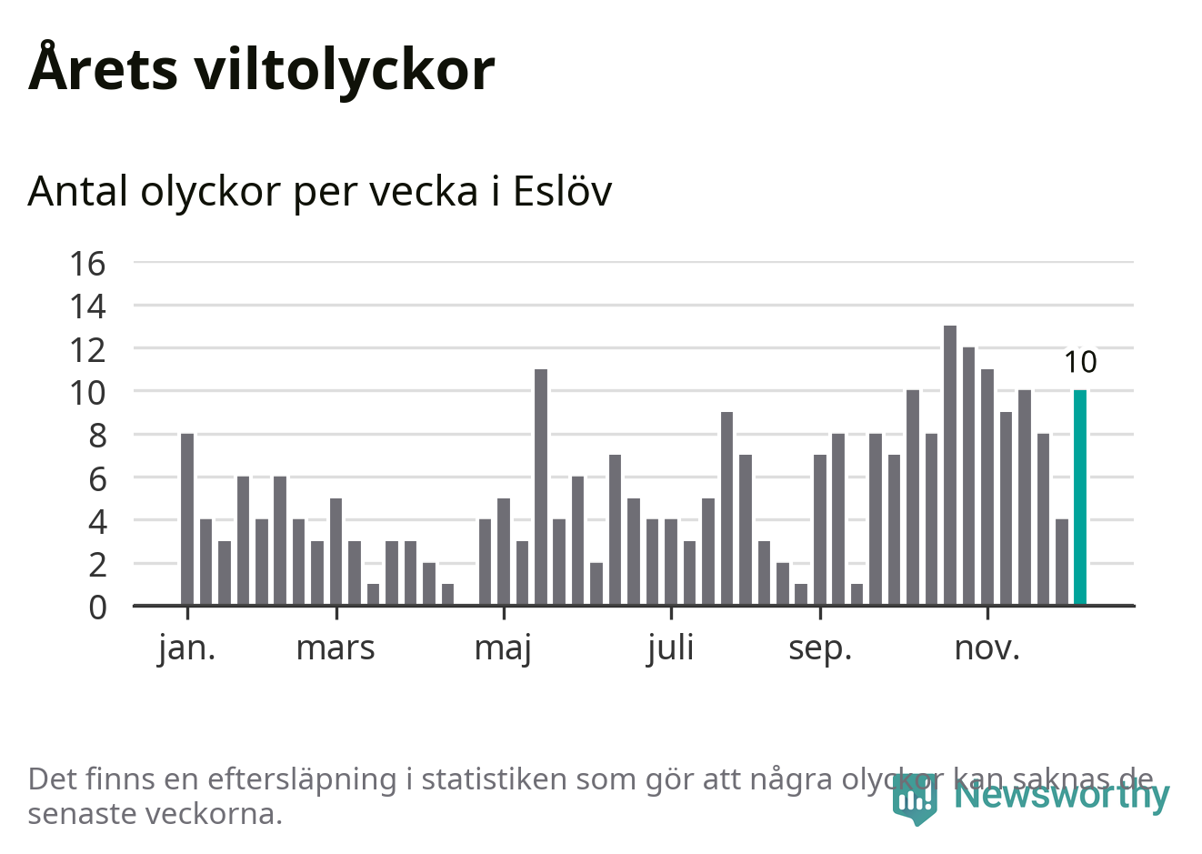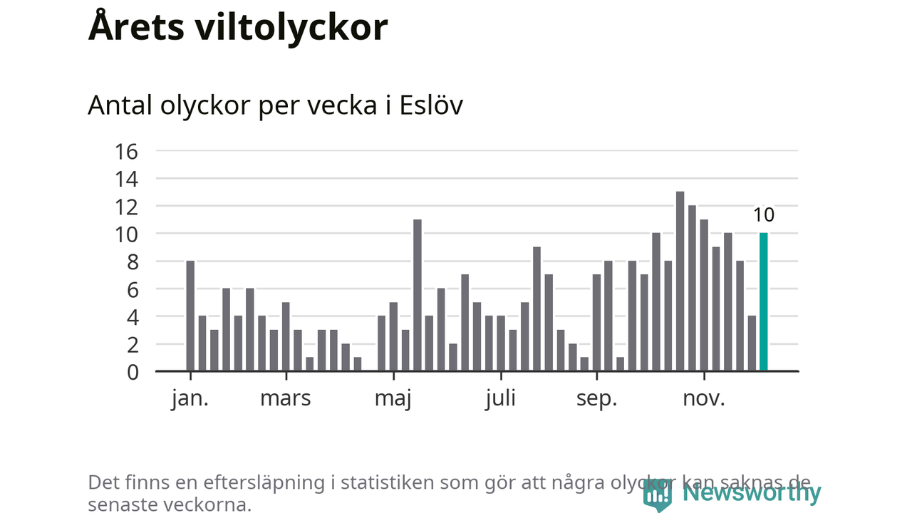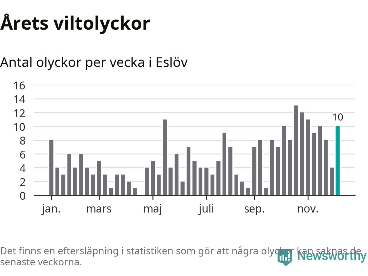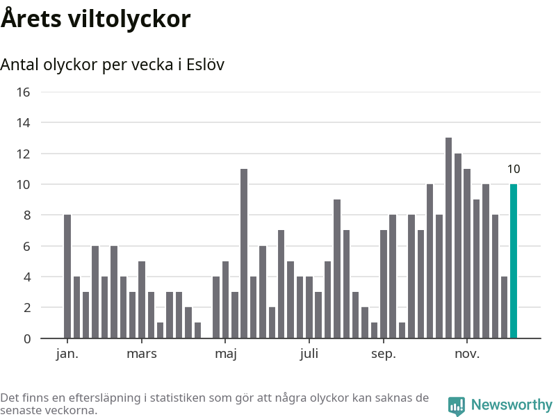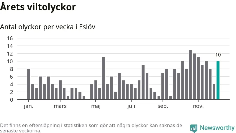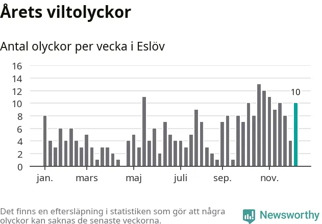 Tio olyckor på en enda vecka är också ovanligt många. Bara 16 gånger tidigare sedan 2015 har det skett