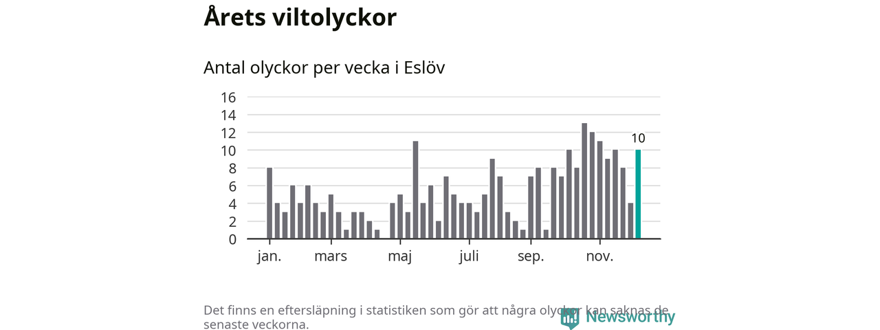 272 viltolyckor i kommunen. Det är mer än genomsnittet för motsvarande period (omkring 236) de senaste tio åren.