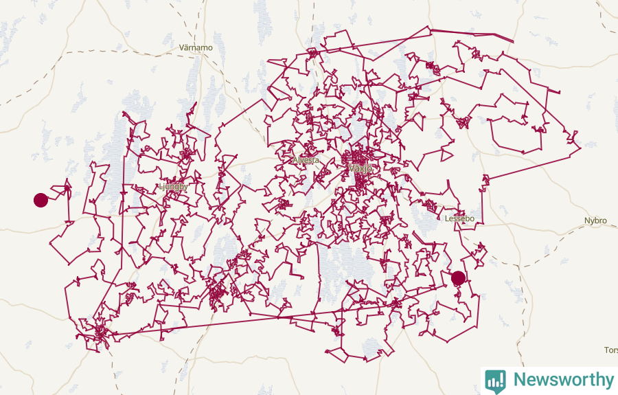 Och det finns färdiga matematiska modeller för att lösa problemet. Med statistik från SCB om hur många barn det bor i olika delar av kommunen har Newsworthy låtit en algoritm ta fram ett förslag på hur en optimal resväg skulle kunna se ut (eller åtminstone nästan optimal – algoritmerna för att lösa handelsresandeproblemet kräver extremt mycket datorkraft).