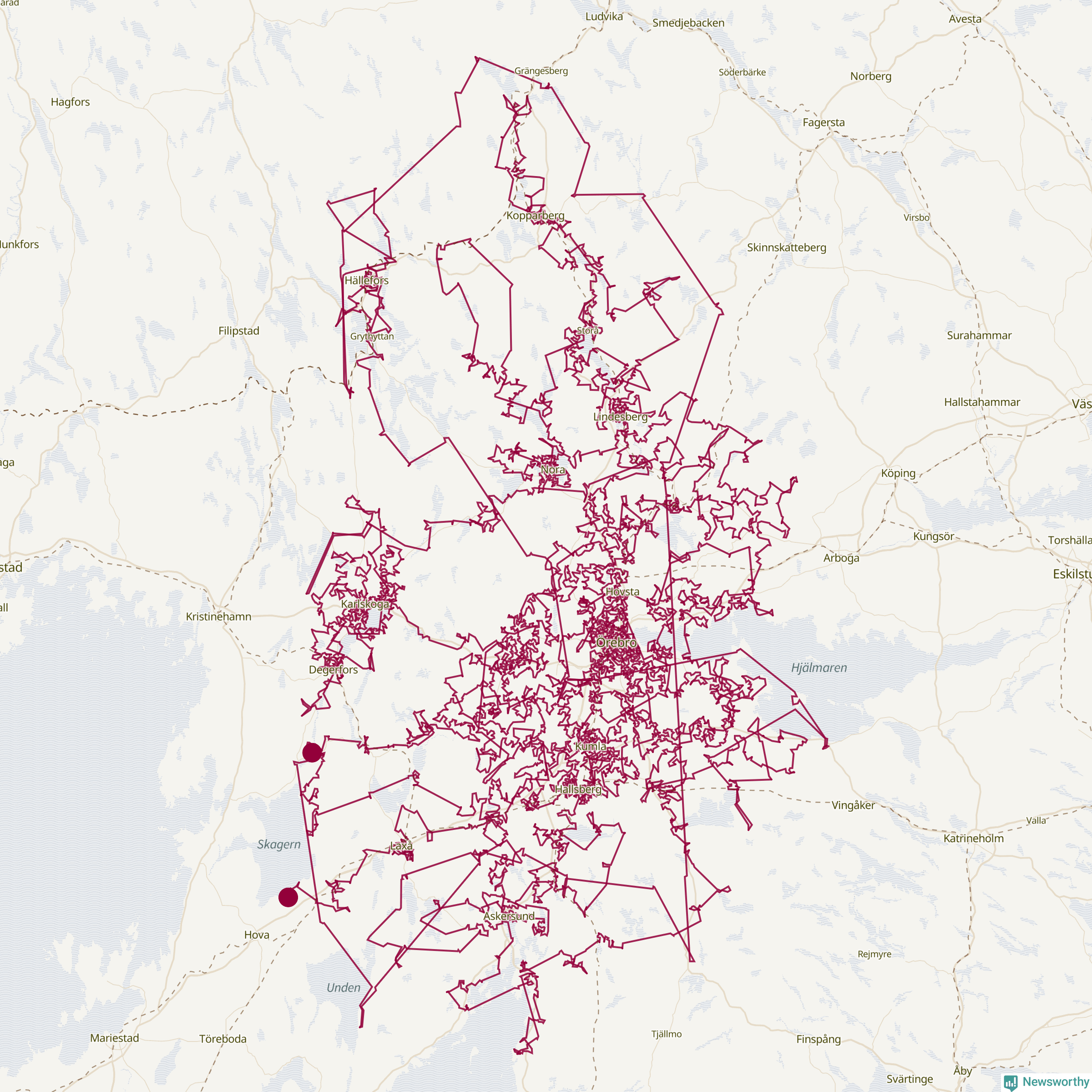 Och det finns färdiga matematiska modeller för att lösa problemet. Med statistik från SCB om hur många barn det bor i olika delar av kommunen har Newsworthy låtit en algoritm ta fram ett förslag på hur en optimal resväg skulle kunna se ut (eller åtminstone nästan optimal – algoritmerna för att lösa handelsresandeproblemet kräver extremt mycket datorkraft).