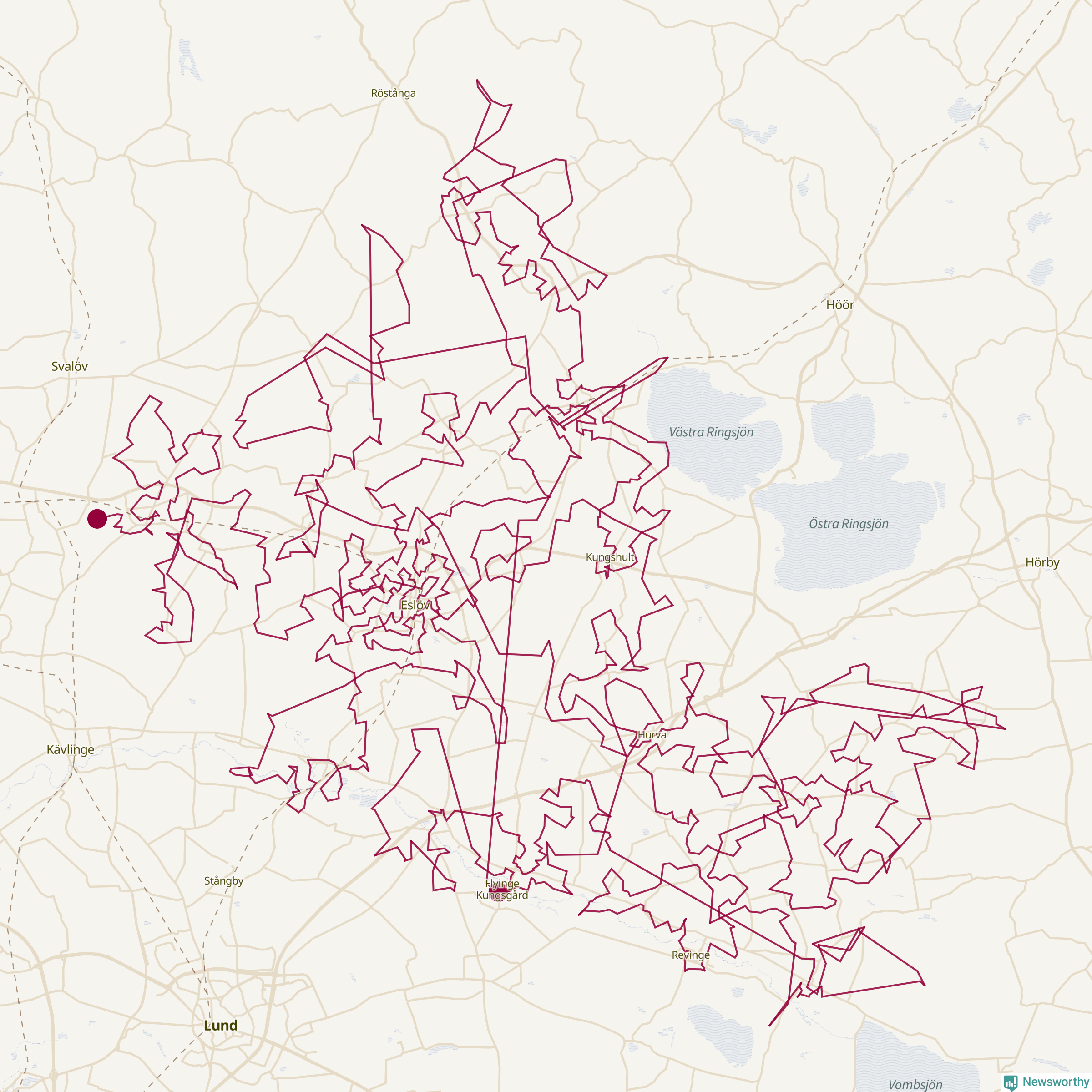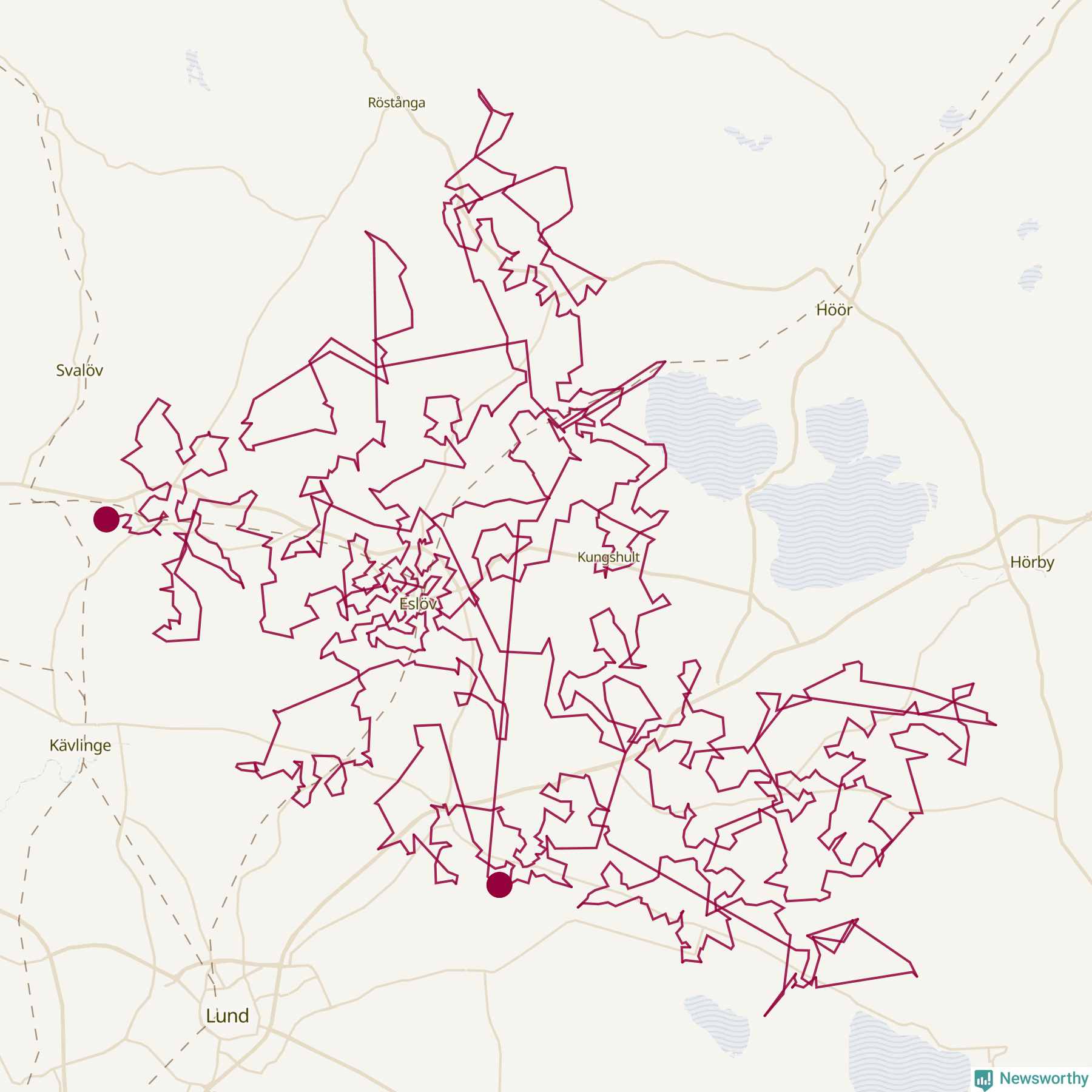 Och det finns färdiga matematiska modeller för att lösa problemet. Med statistik från SCB om hur många barn det bor i olika delar av kommunen har Newsworthy låtit en algoritm ta fram ett förslag på hur en optimal resväg skulle kunna se ut (eller åtminstone nästan optimal – algoritmerna för att lösa handelsresandeproblemet kräver extremt mycket datorkraft).