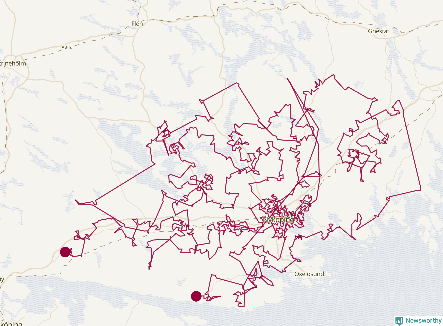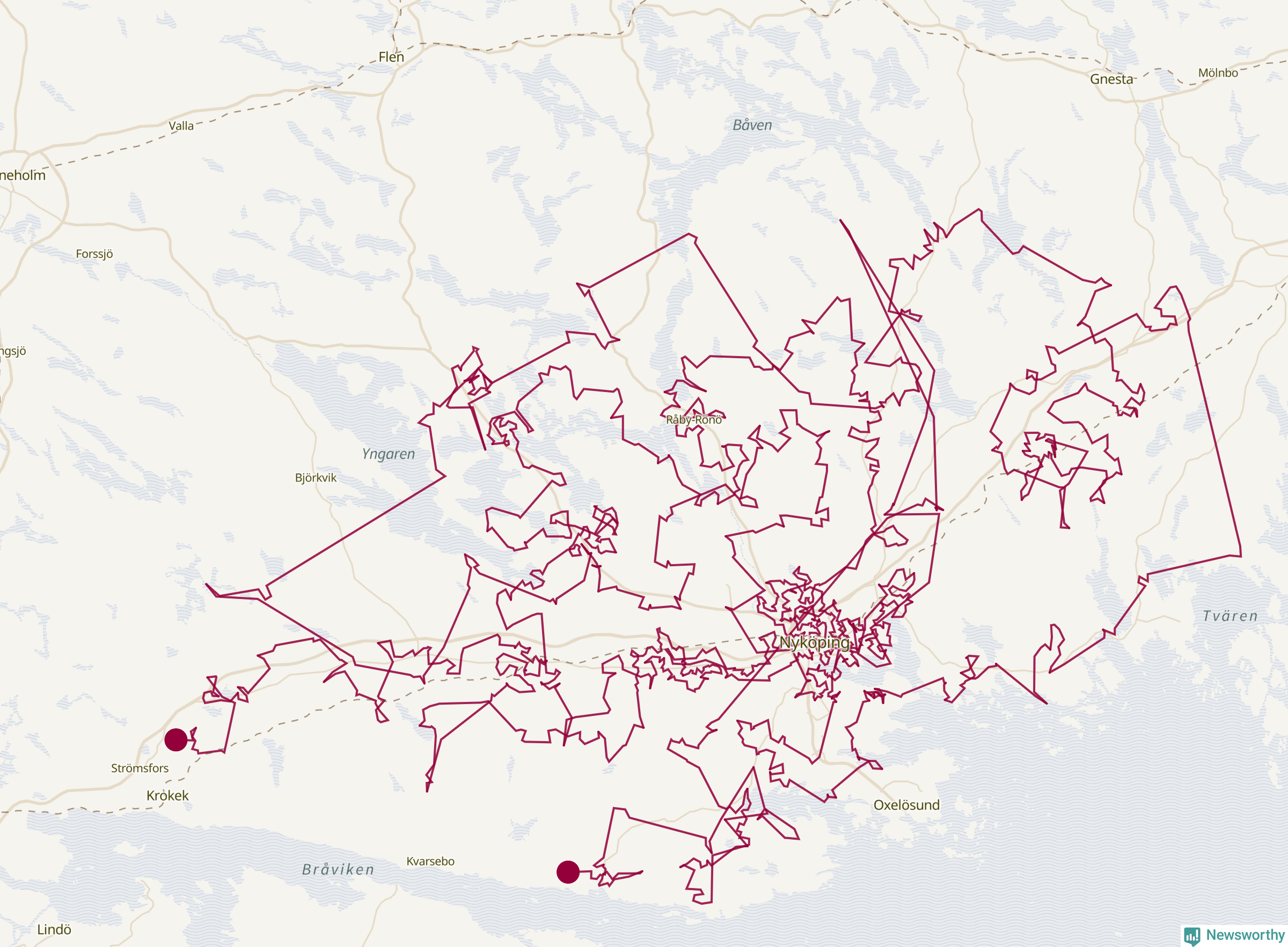 Och det finns färdiga matematiska modeller för att lösa problemet. Med statistik från SCB om hur många barn det bor i olika delar av kommunen har Newsworthy låtit en algoritm ta fram ett förslag på hur en optimal resväg skulle kunna se ut (eller åtminstone nästan optimal – algoritmerna för att lösa handelsresandeproblemet kräver extremt mycket datorkraft).