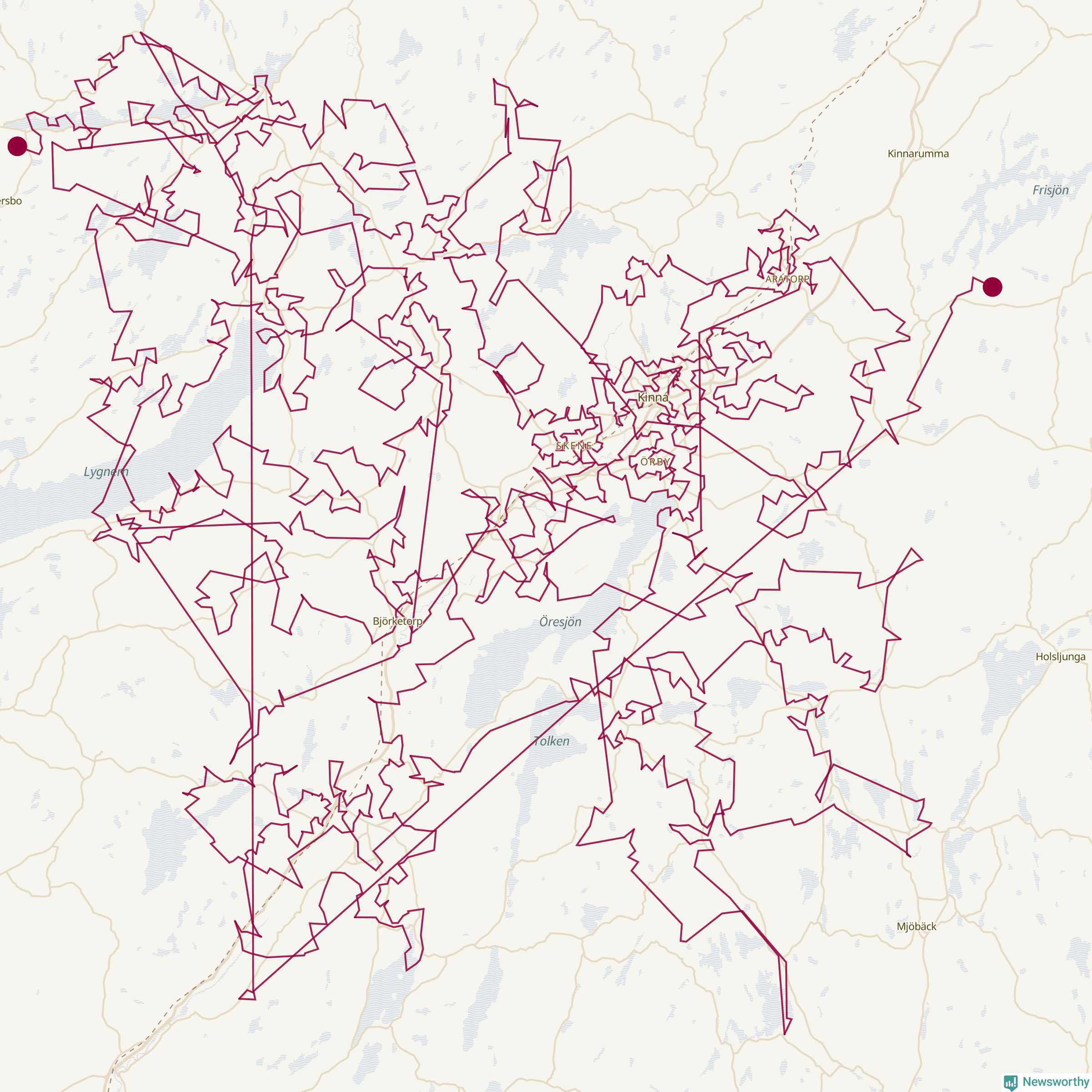 Och det finns färdiga matematiska modeller för att lösa problemet. Med statistik från SCB om hur många barn det bor i olika delar av kommunen har Newsworthy låtit en algoritm ta fram ett förslag på hur en optimal resväg skulle kunna se ut (eller åtminstone nästan optimal – algoritmerna för att lösa handelsresandeproblemet kräver extremt mycket datorkraft).
