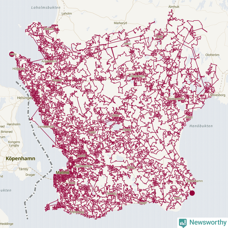 Så här skulle tomtens resa kunna se ut i Skåne: