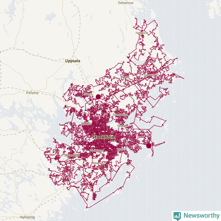 Och det finns färdiga matematiska modeller för att lösa problemet. Med statistik från SCB om hur många barn det bor i olika delar av kommunen har Newsworthy låtit en algoritm ta fram ett förslag på hur en optimal resväg skulle kunna se ut (eller åtminstone nästan optimal – algoritmerna för att lösa handelsresandeproblemet kräver extremt mycket datorkraft).