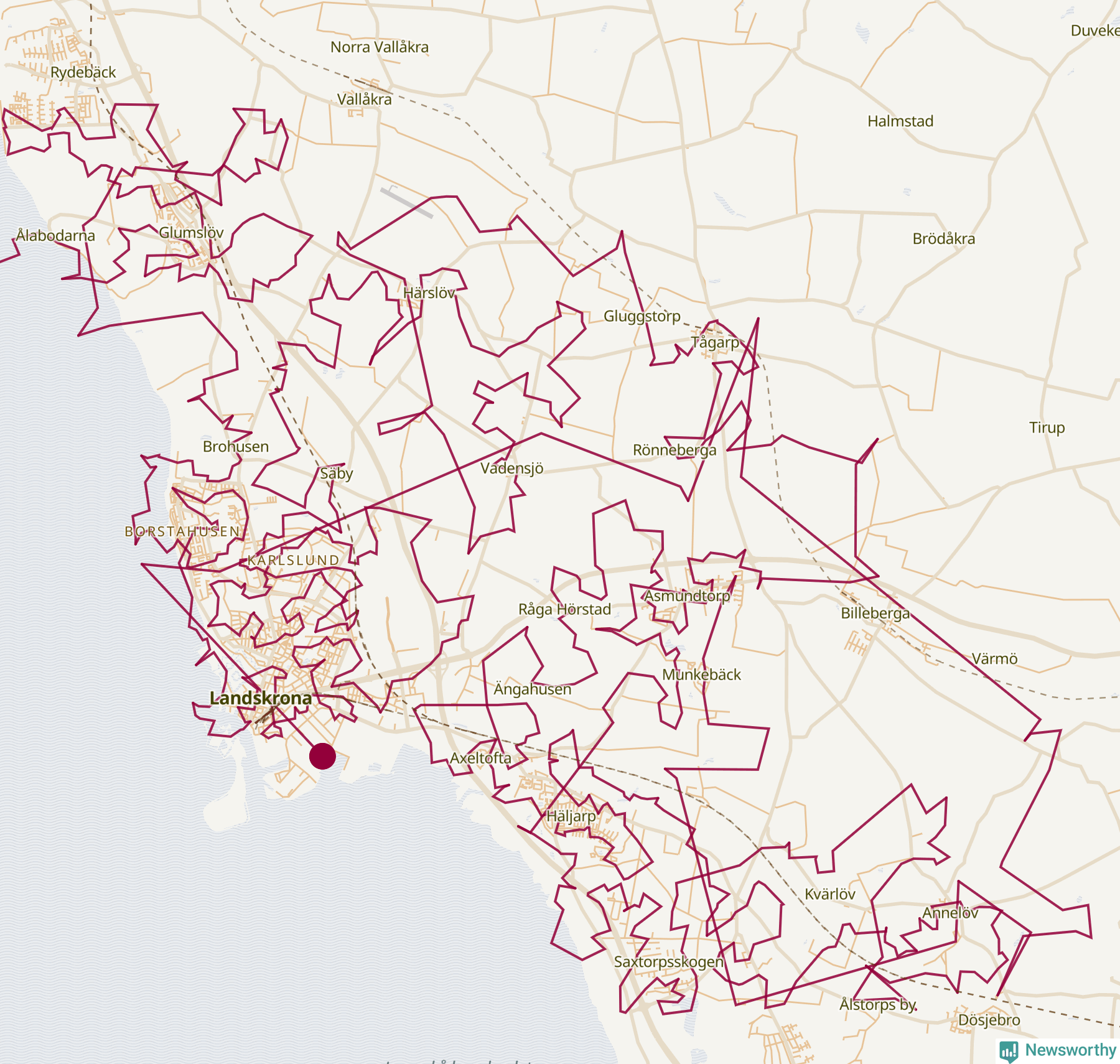 Och det finns färdiga matematiska modeller för att lösa problemet. Med statistik från SCB om hur många barn det bor i olika delar av kommunen har Newsworthy låtit en algoritm ta fram ett förslag på hur en optimal resväg skulle kunna se ut (eller åtminstone nästan optimal – algoritmerna för att lösa handelsresandeproblemet kräver extremt mycket datorkraft).