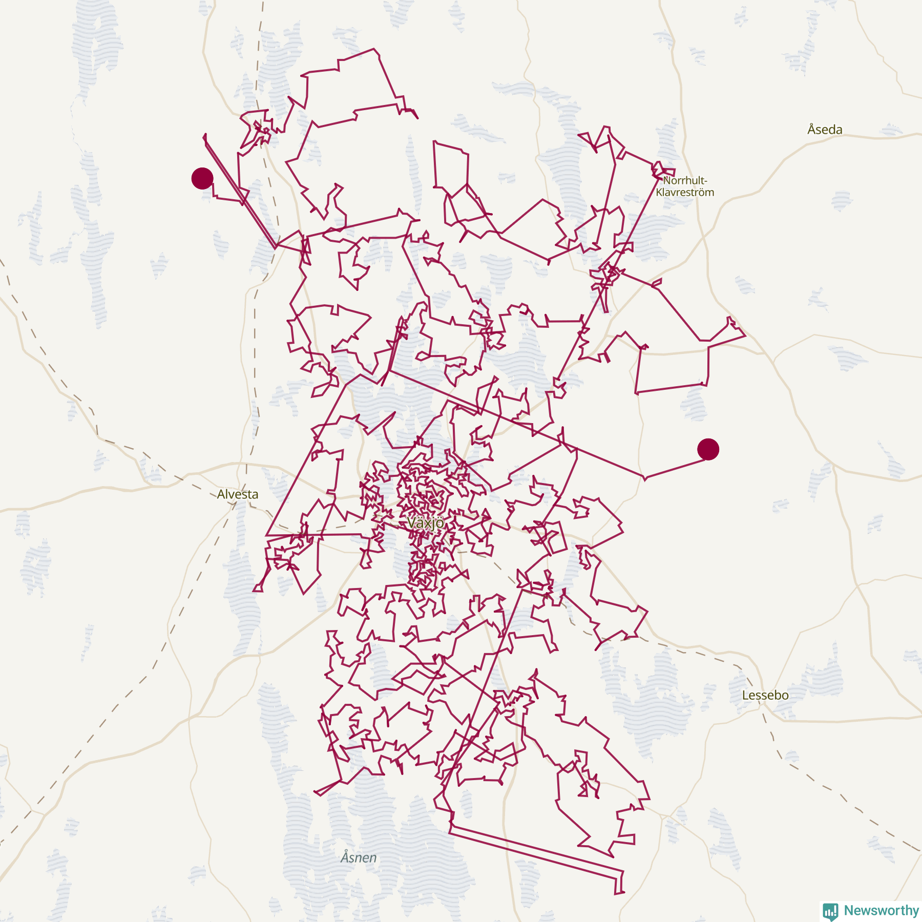 Och det finns färdiga matematiska modeller för att lösa problemet. Med statistik från SCB om hur många barn det bor i olika delar av kommunen har Newsworthy låtit en algoritm ta fram ett förslag på hur en optimal resväg skulle kunna se ut (eller åtminstone nästan optimal – algoritmerna för att lösa handelsresandeproblemet kräver extremt mycket datorkraft).