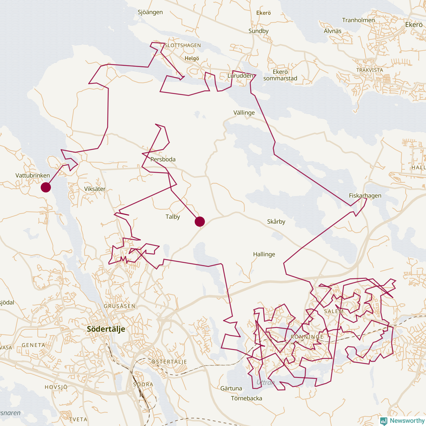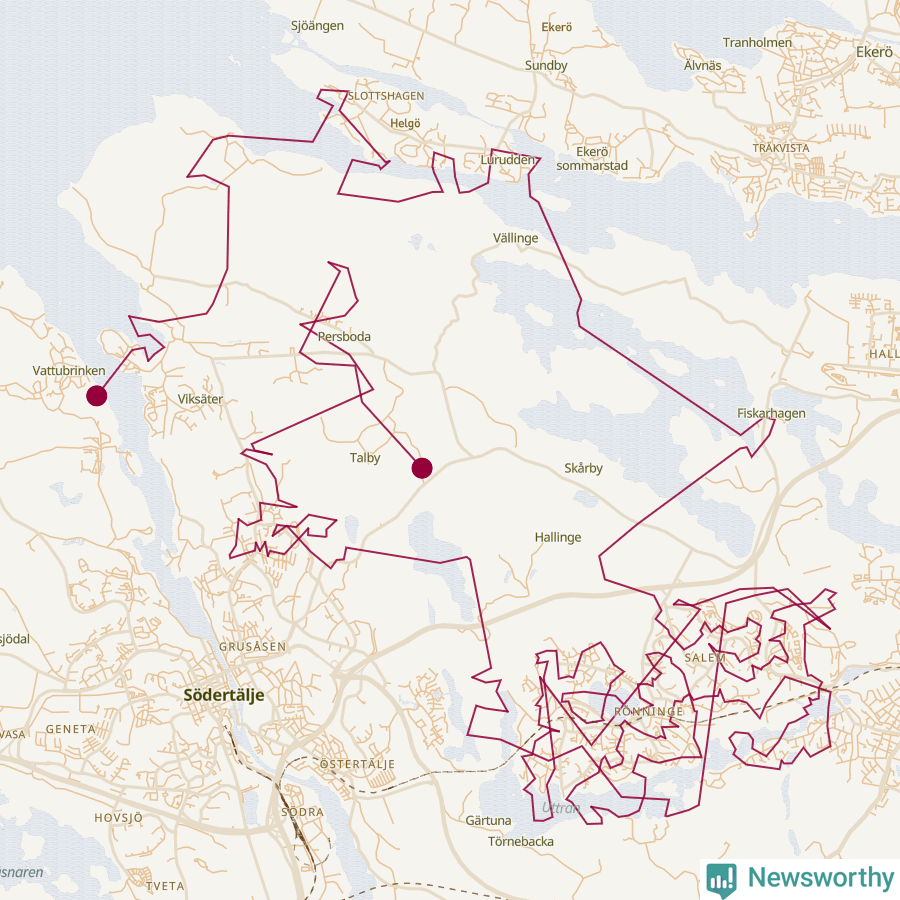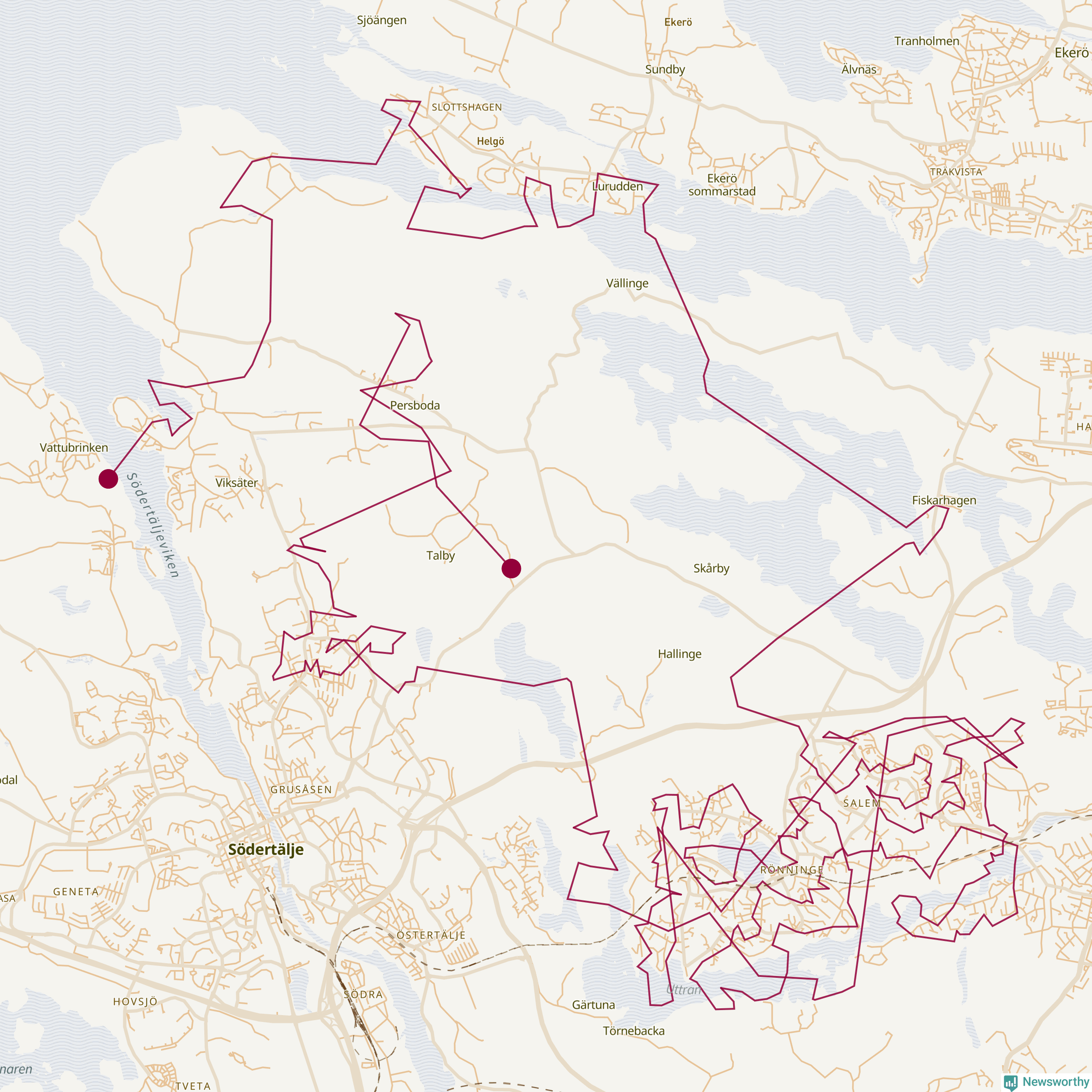 Och det finns färdiga matematiska modeller för att lösa problemet. Med statistik från SCB om hur många barn det bor i olika delar av kommunen har Newsworthy låtit en algoritm ta fram ett förslag på hur en optimal resväg skulle kunna se ut (eller åtminstone nästan optimal – algoritmerna för att lösa handelsresandeproblemet kräver extremt mycket datorkraft).