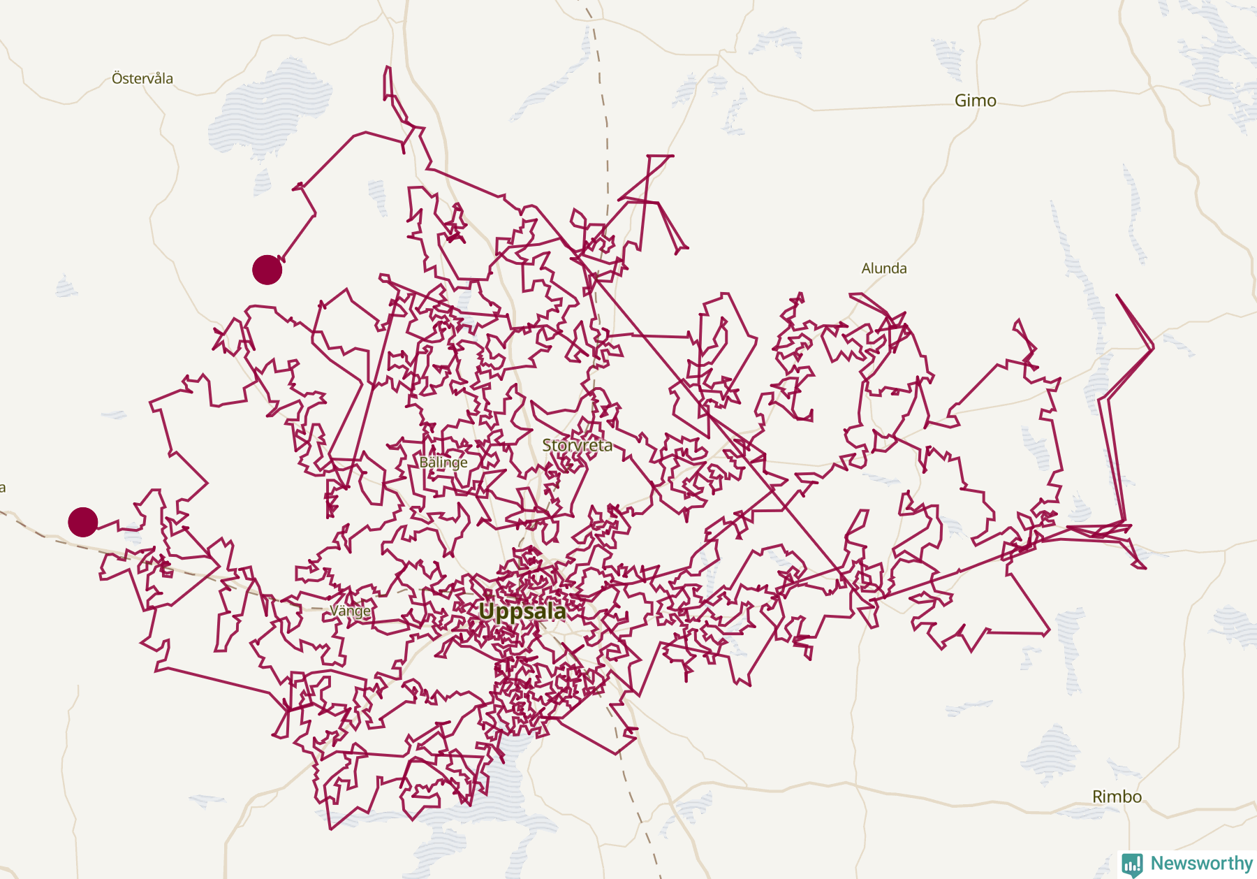 Och det finns färdiga matematiska modeller för att lösa problemet. Med statistik från SCB om hur många barn det bor i olika delar av kommunen har Newsworthy låtit en algoritm ta fram ett förslag på hur en optimal resväg skulle kunna se ut (eller åtminstone nästan optimal – algoritmerna för att lösa handelsresandeproblemet kräver extremt mycket datorkraft).