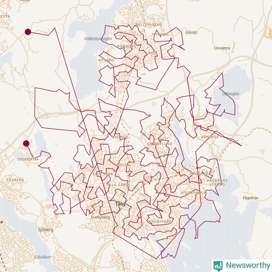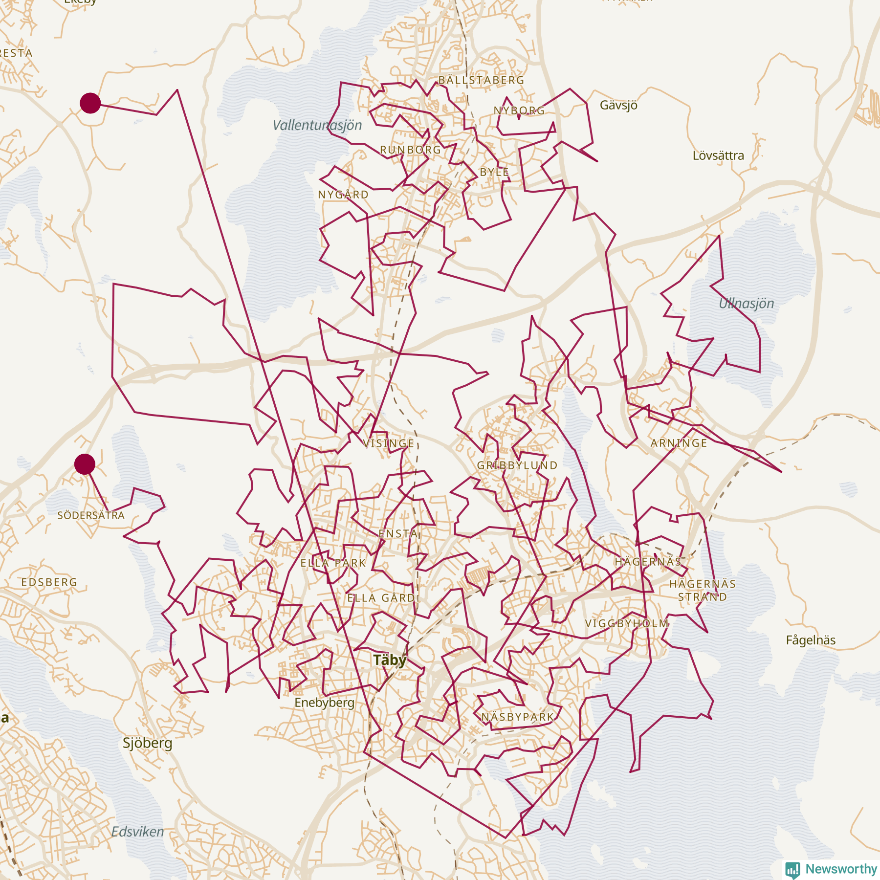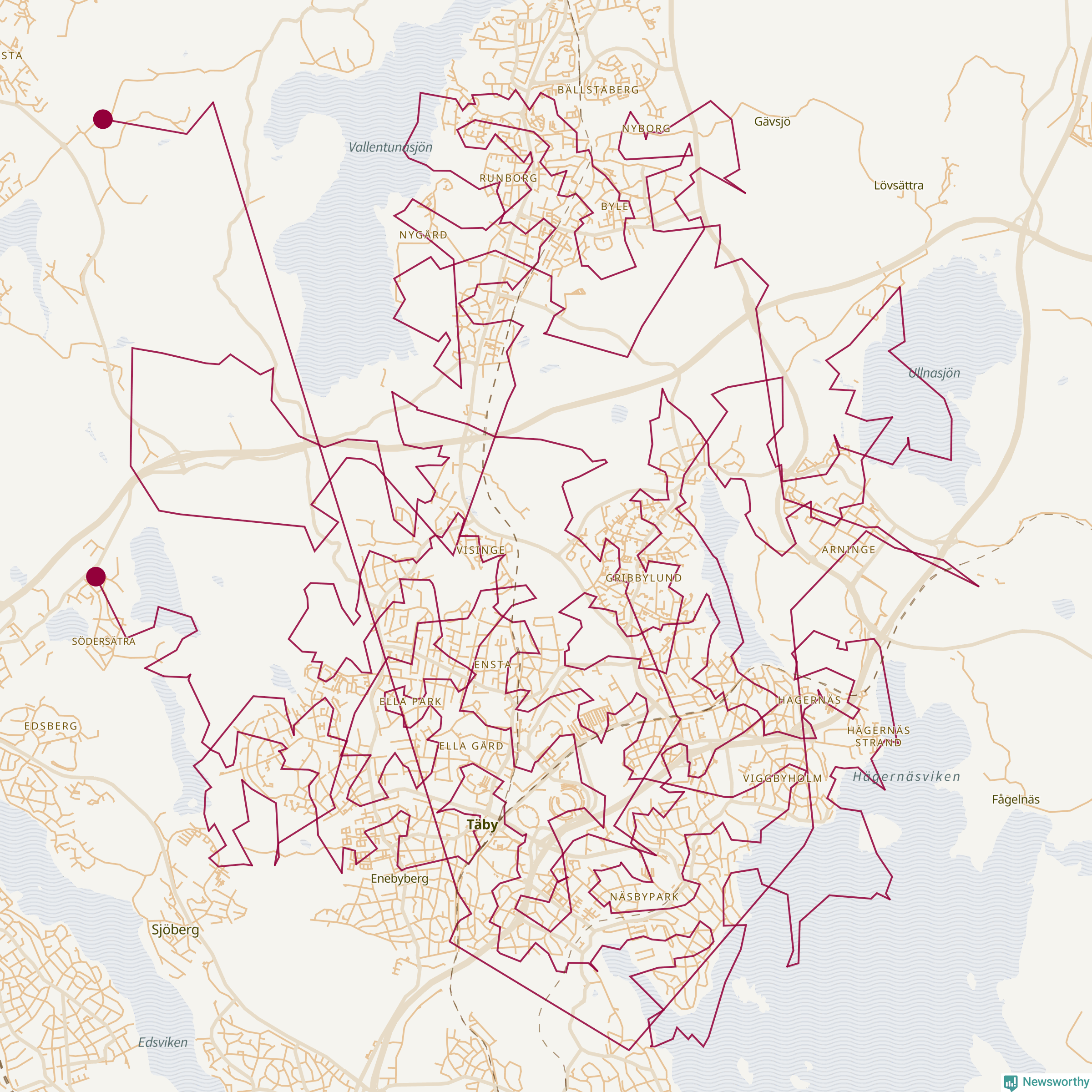 Och det finns färdiga matematiska modeller för att lösa problemet. Med statistik från SCB om hur många barn det bor i olika delar av kommunen har Newsworthy låtit en algoritm ta fram ett förslag på hur en optimal resväg skulle kunna se ut (eller åtminstone nästan optimal – algoritmerna för att lösa handelsresandeproblemet kräver extremt mycket datorkraft).
