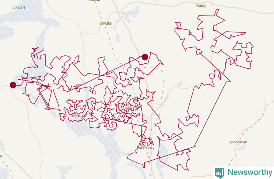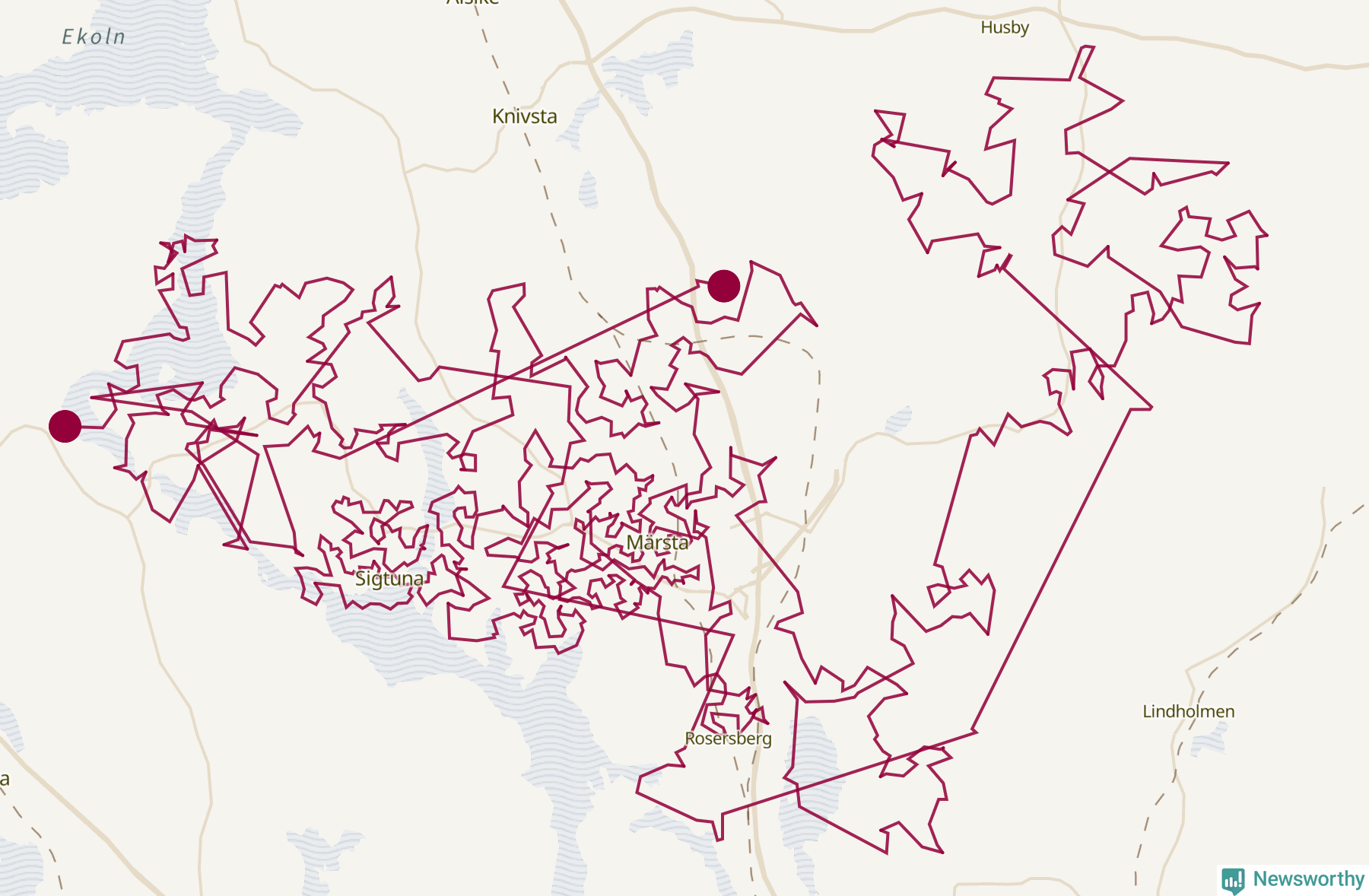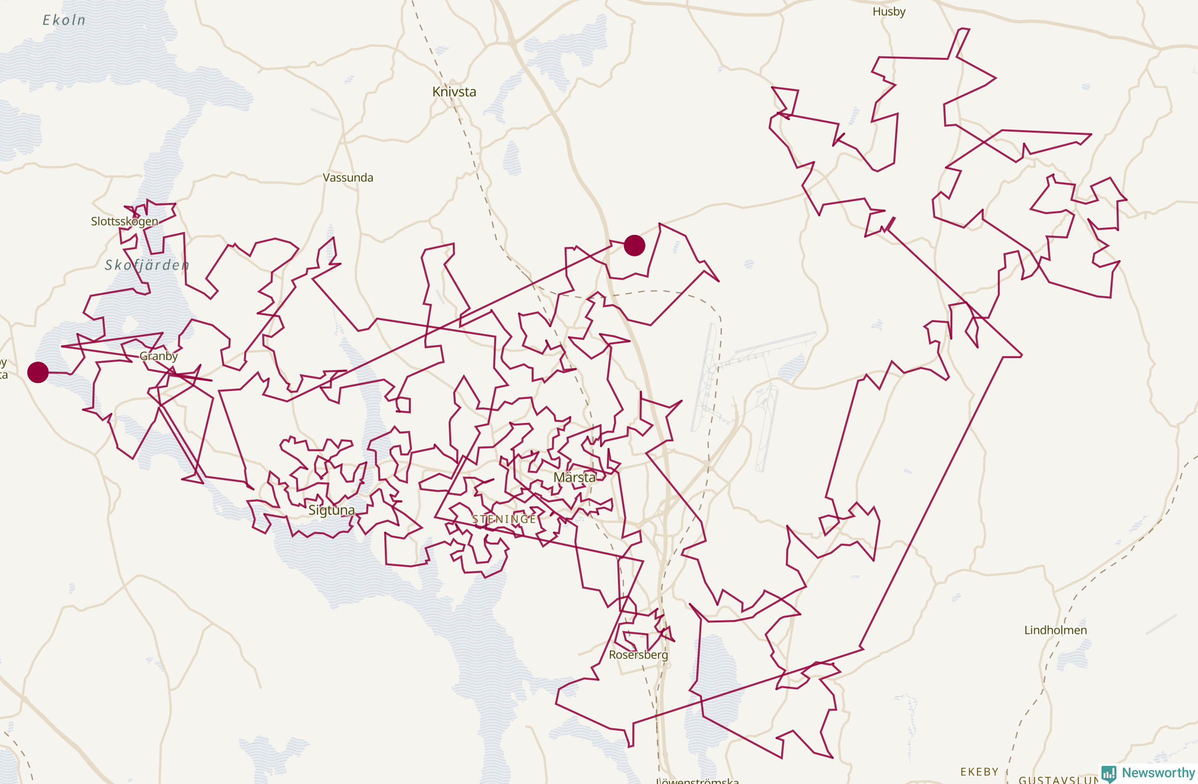 Och det finns färdiga matematiska modeller för att lösa problemet. Med statistik från SCB om hur många barn det bor i olika delar av kommunen har Newsworthy låtit en algoritm ta fram ett förslag på hur en optimal resväg skulle kunna se ut (eller åtminstone nästan optimal – algoritmerna för att lösa handelsresandeproblemet kräver extremt mycket datorkraft).