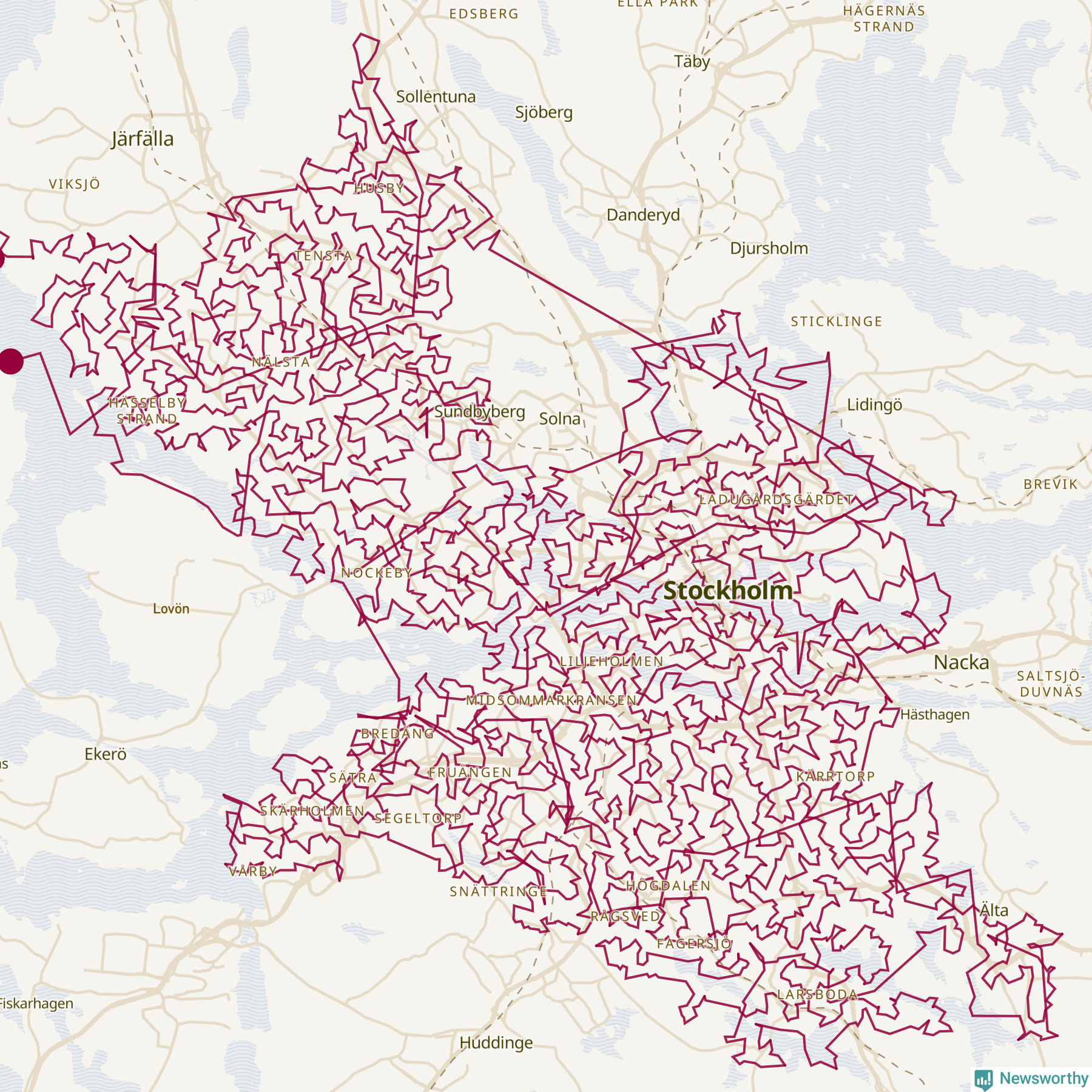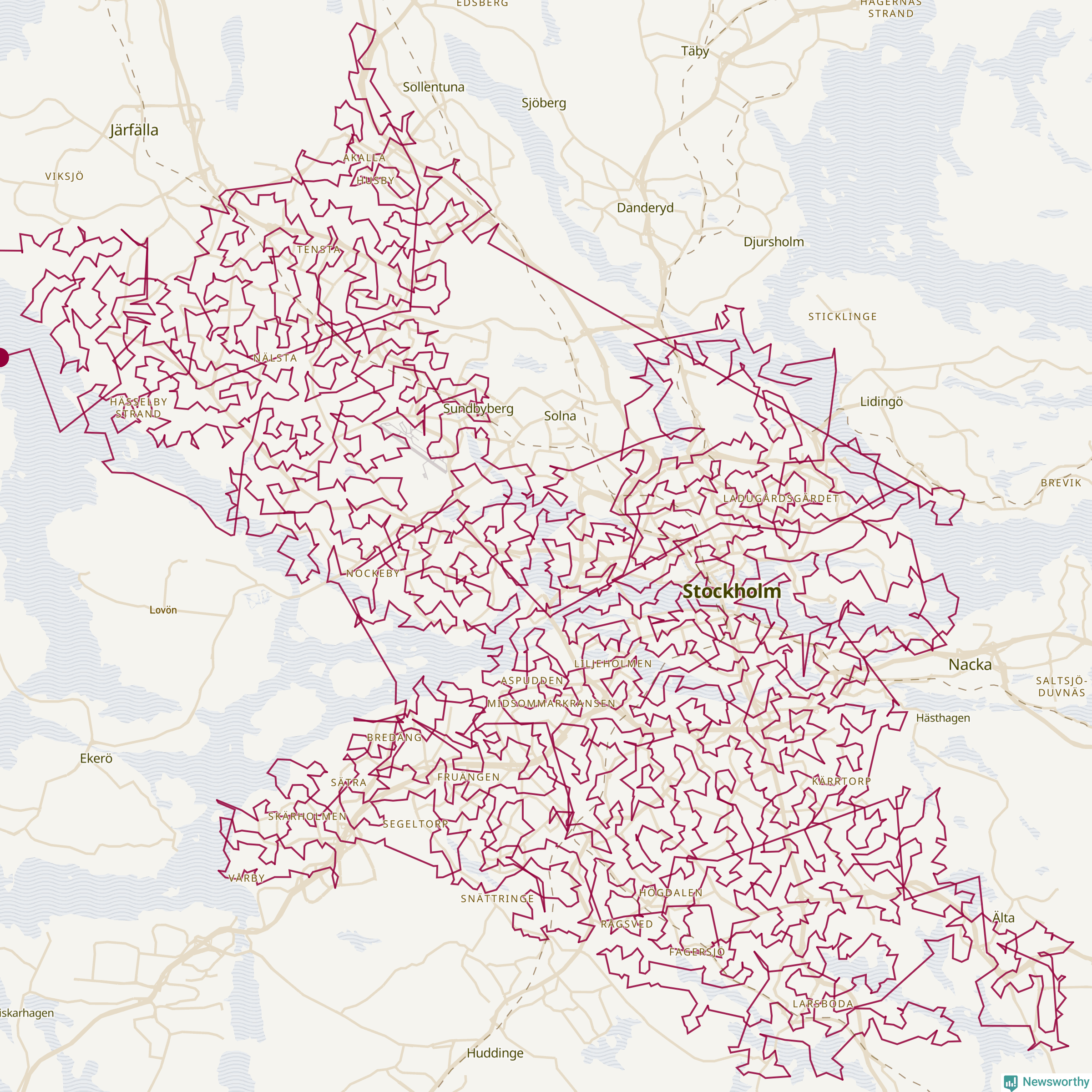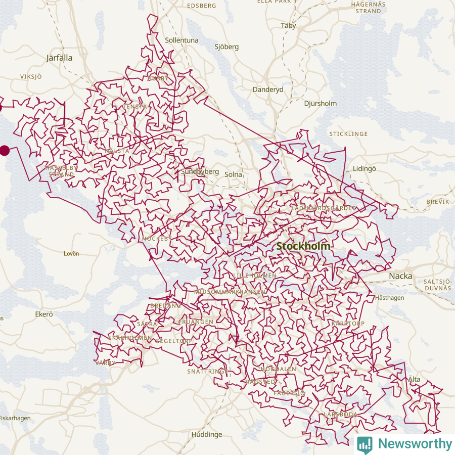 Och det finns färdiga matematiska modeller för att lösa problemet. Med statistik från SCB om hur många barn det bor i olika delar av kommunen har Newsworthy låtit en algoritm ta fram ett förslag på hur en optimal resväg skulle kunna se ut (eller åtminstone nästan optimal – algoritmerna för att lösa handelsresandeproblemet kräver extremt mycket datorkraft).