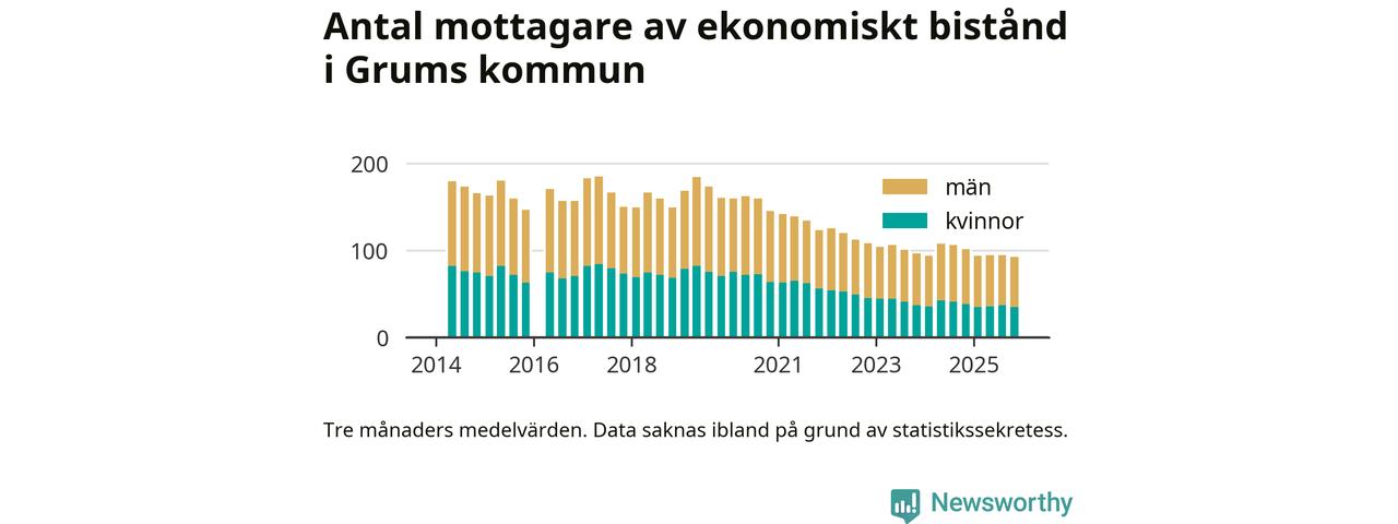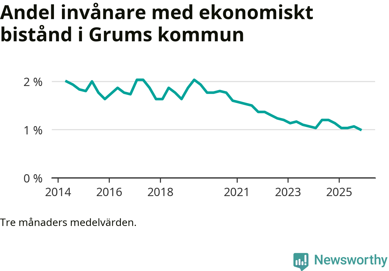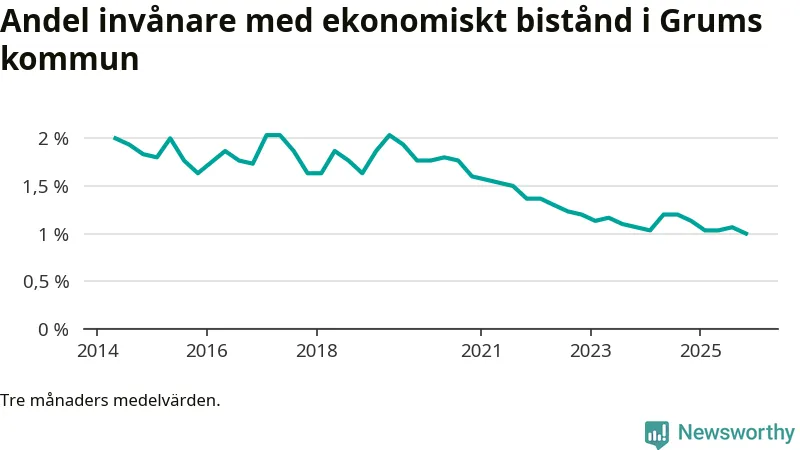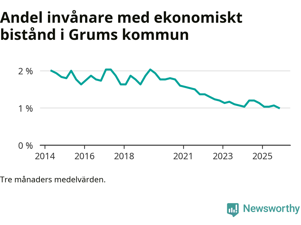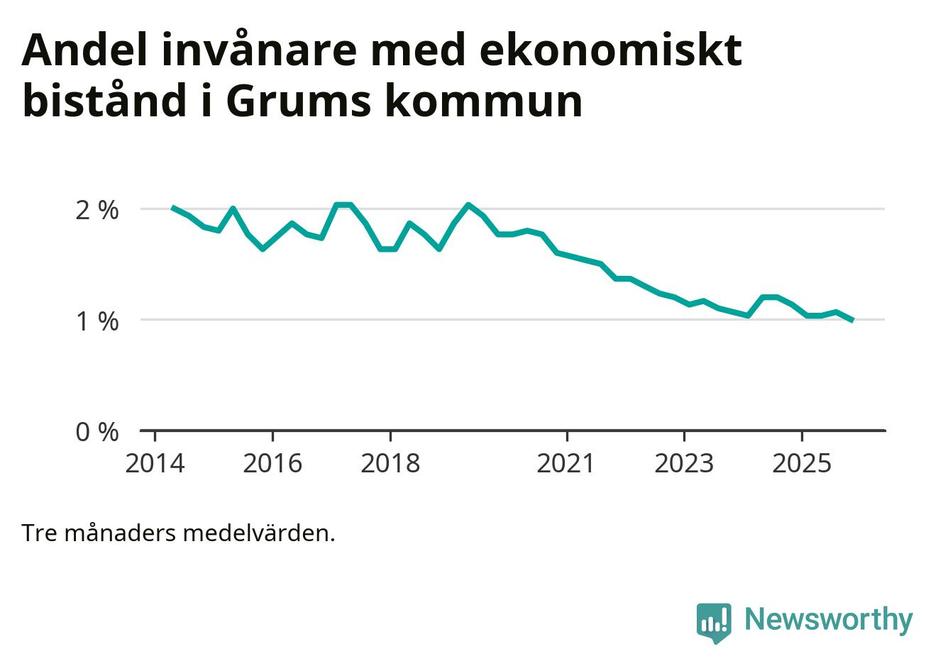 I genomsnitt 92 personer per månad fick ekonomiskt bistånd i Grums kommun under höstmånaderna (september till november), vilket motsvarar 1,0 procent av den vuxna befolkningen. Det är marginellt mindre än i somras, och något mindre andel än under hösten för ett år sedan.