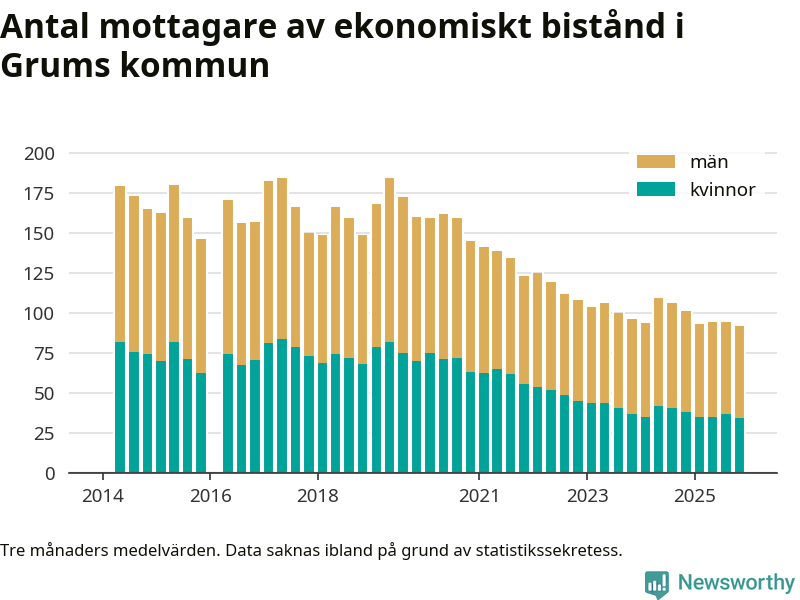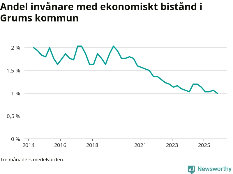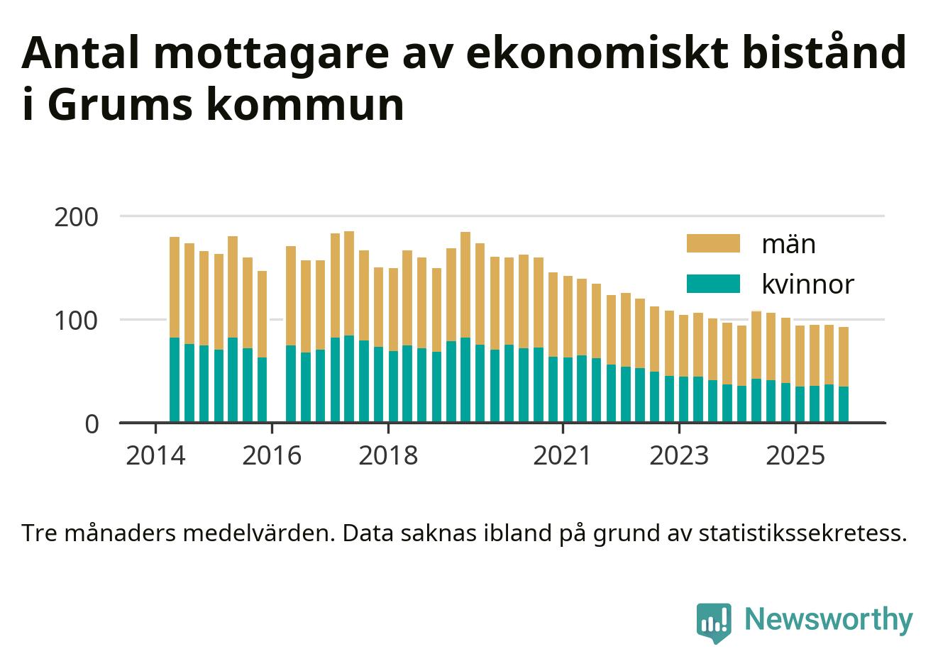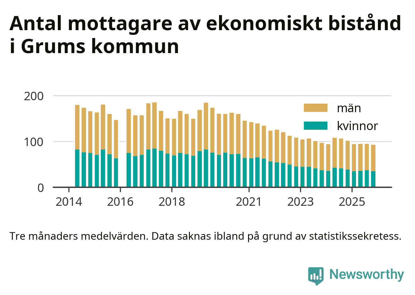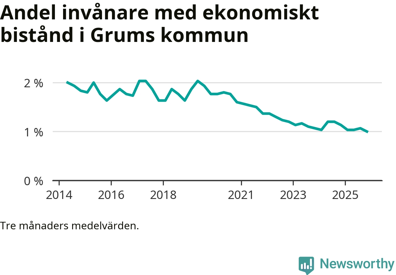 I genomsnitt 92 personer per månad fick ekonomiskt bistånd i Grums kommun under höstmånaderna (september till november), vilket motsvarar 1,0 procent av den vuxna befolkningen. Det är marginellt mindre än i somras, och något mindre andel än under hösten för ett år sedan.