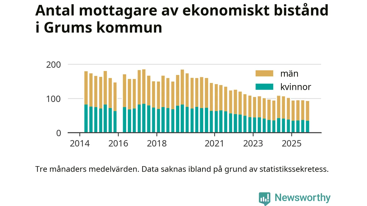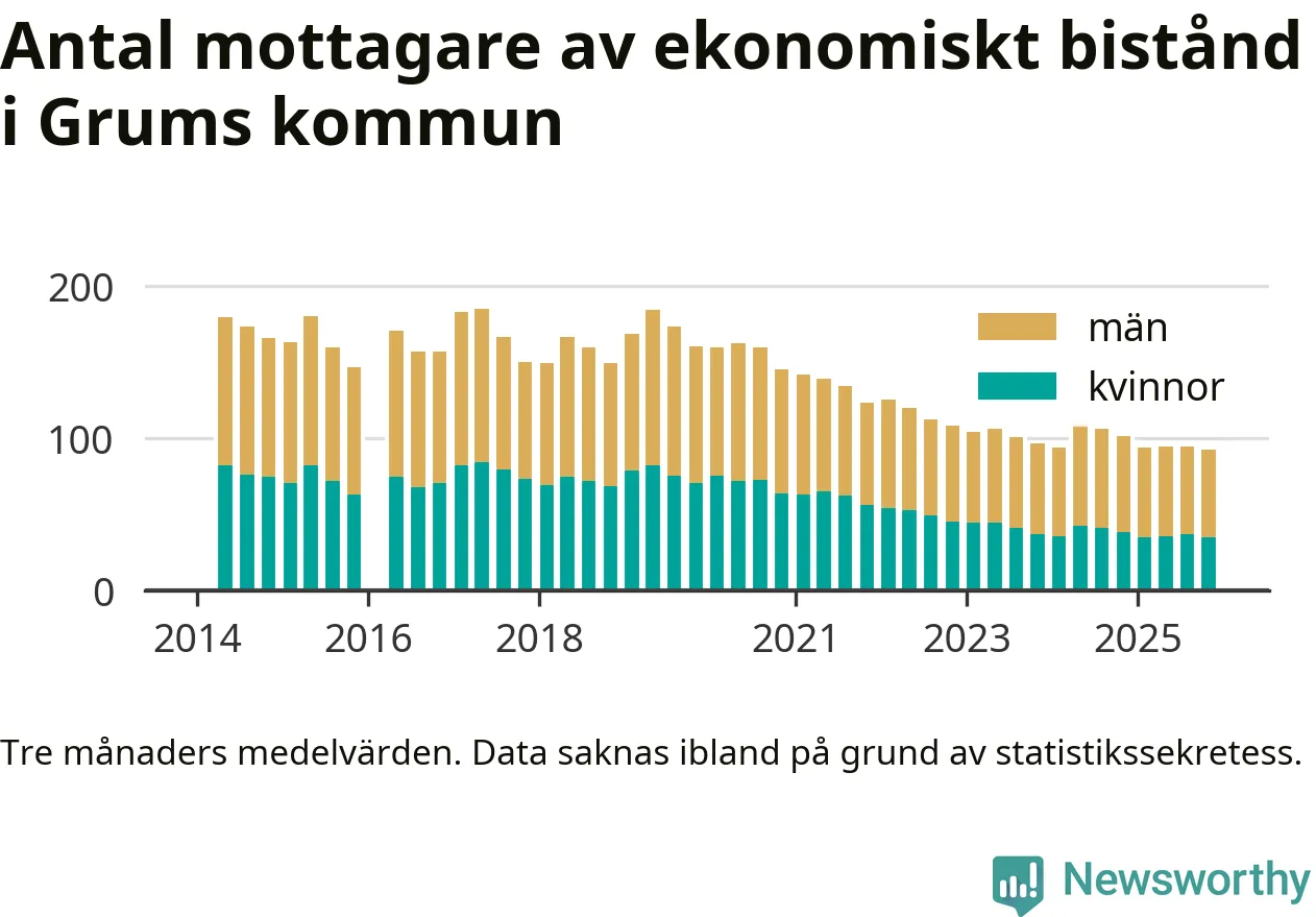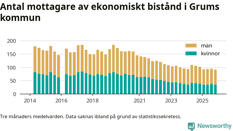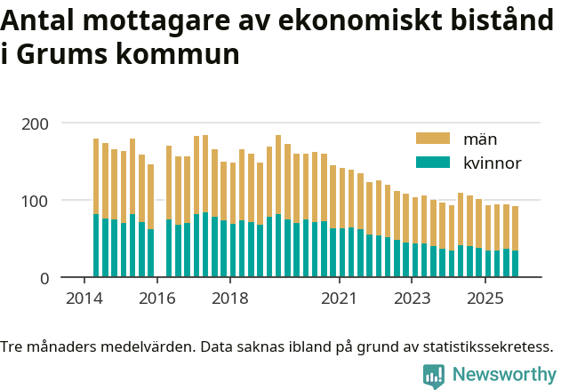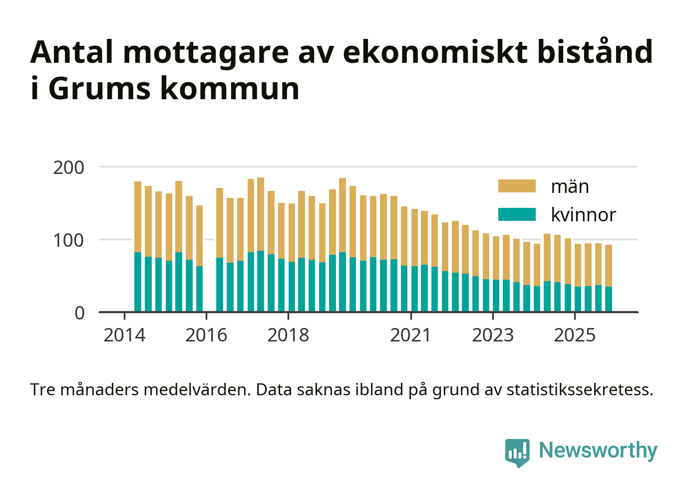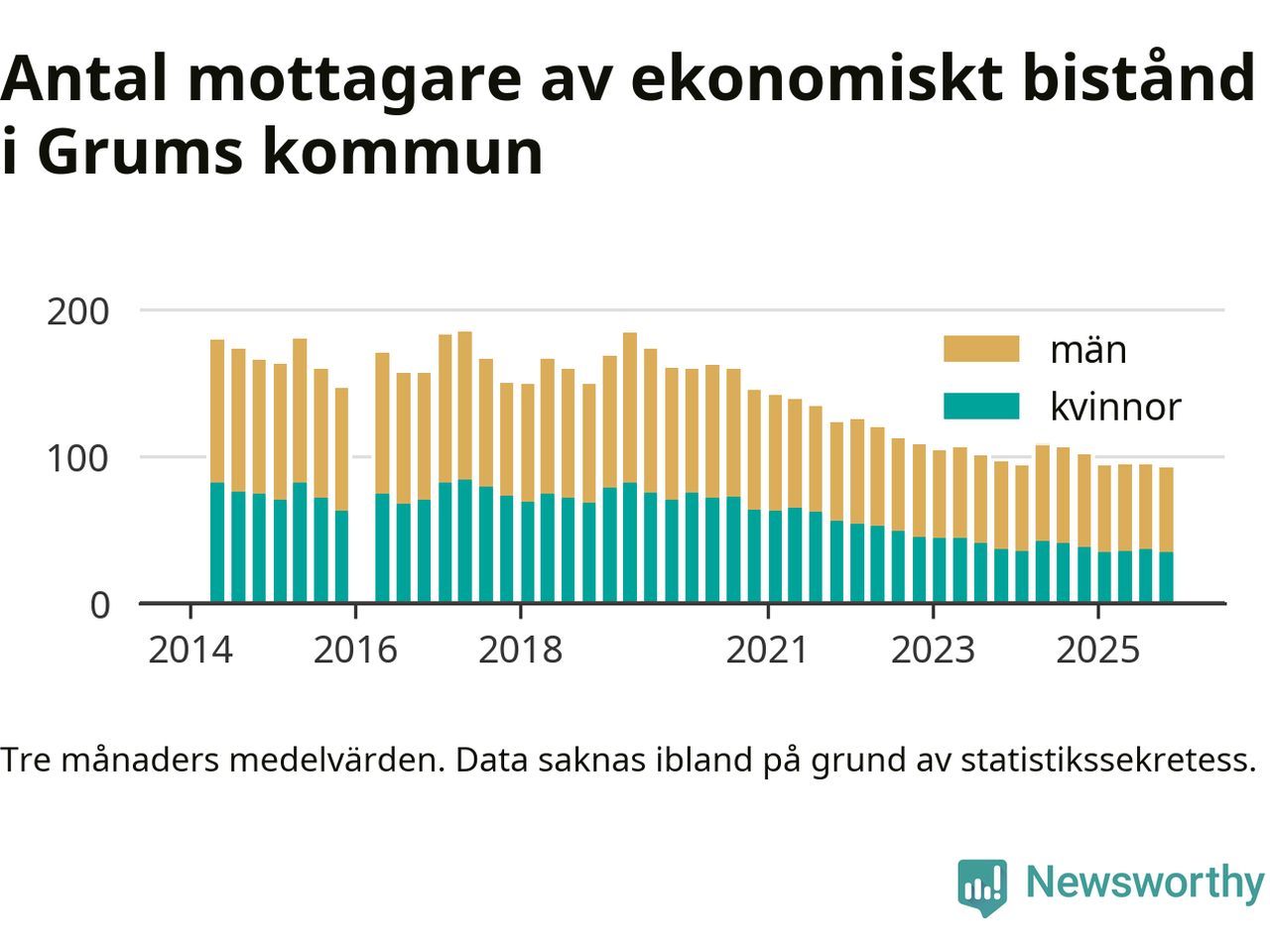 I genomsnitt 92 personer per månad fick ekonomiskt bistånd i Grums kommun under höstmånaderna (september till november), vilket motsvarar 1,0 procent av den vuxna befolkningen. Det är marginellt mindre än i somras, och något mindre andel än under hösten för ett år sedan.
