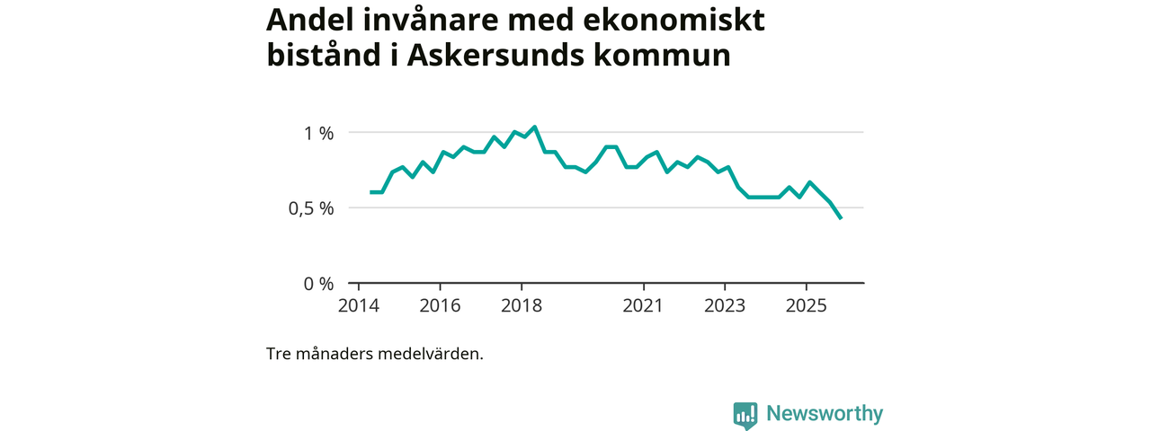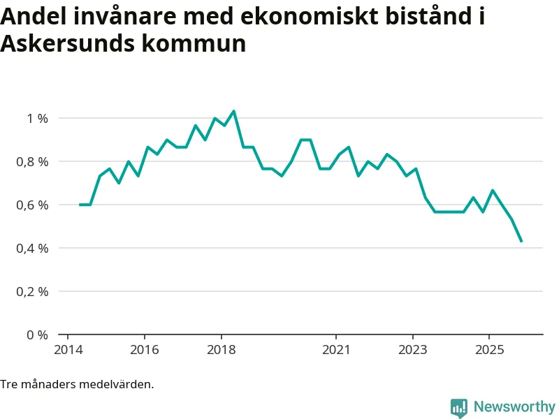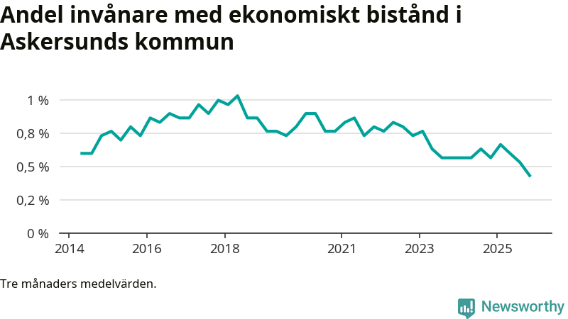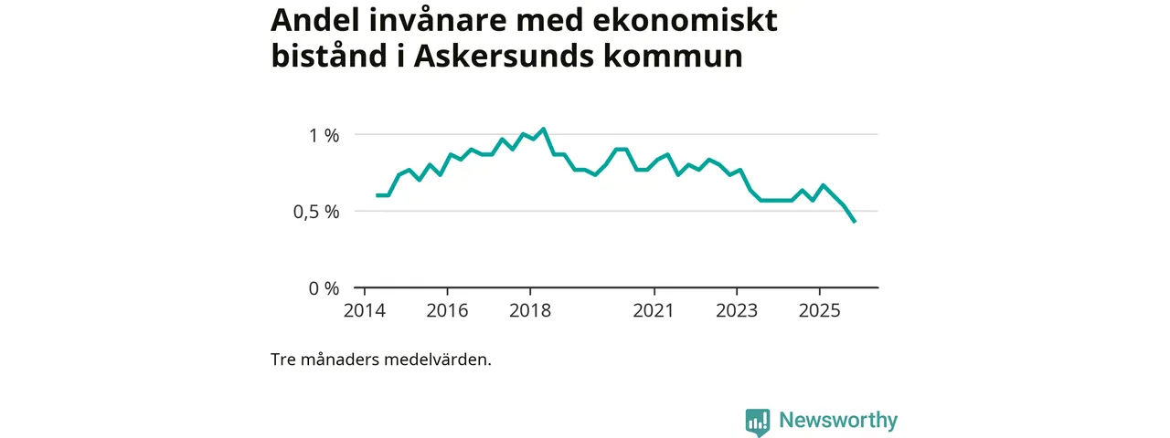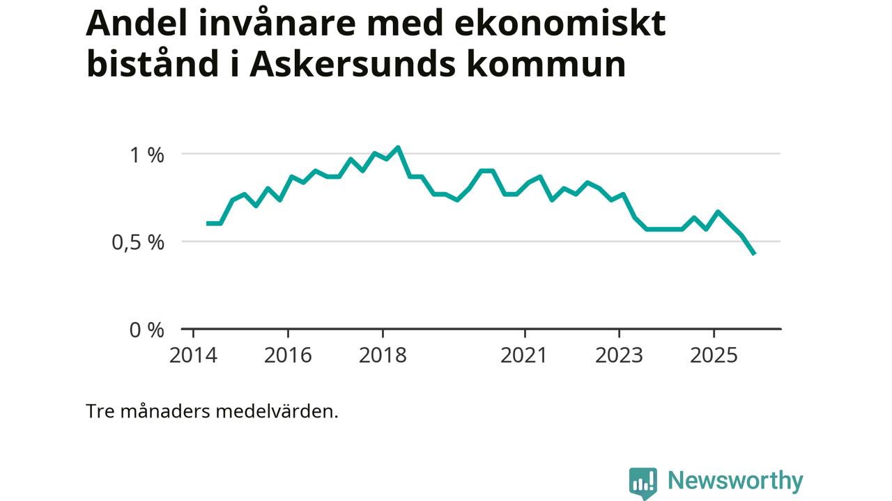 Andelen invånare med ekonomiskt bistånd i Askersunds kommun var under hösten den lägsta sedan åtminstone 2014. Det visar den senaste, preliminära statistiken från Socialstyrelsen.