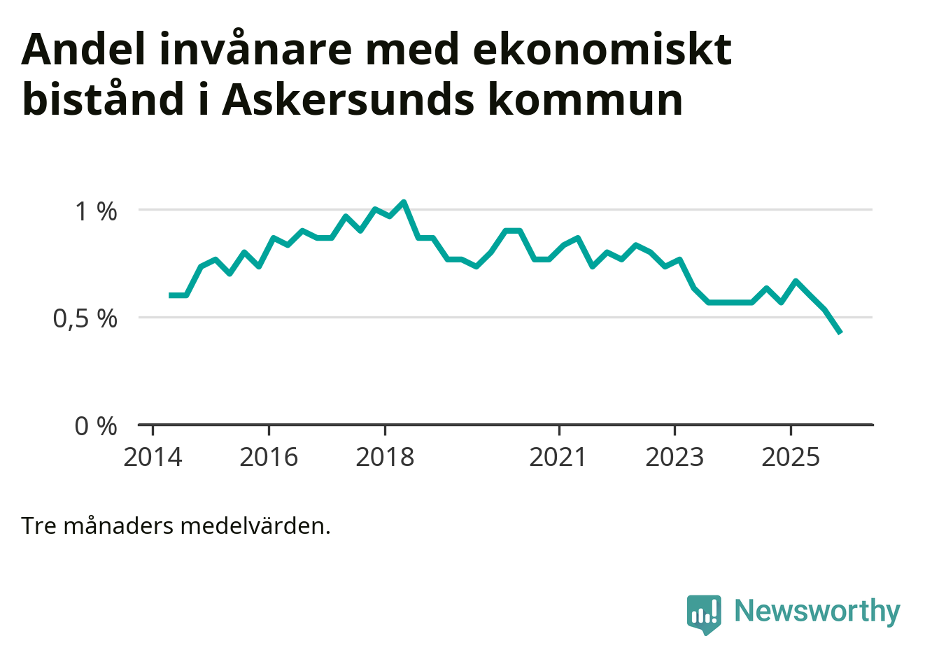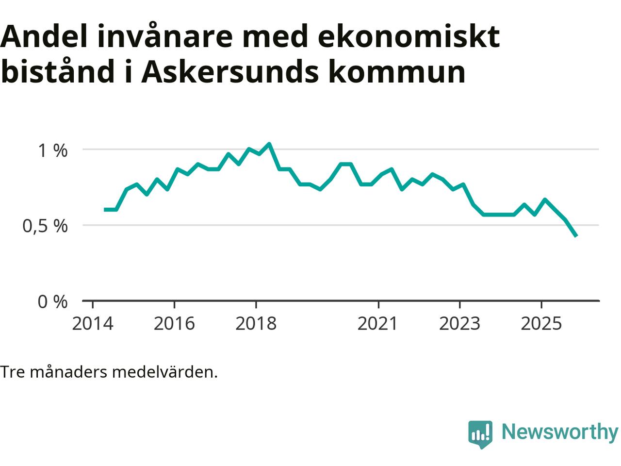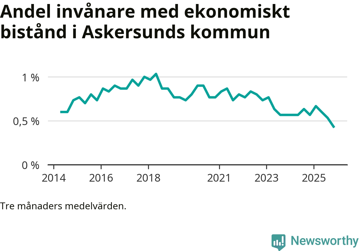 Andelen invånare med ekonomiskt bistånd i Askersunds kommun var under hösten den lägsta sedan åtminstone 2014. Det visar den senaste, preliminära statistiken från Socialstyrelsen.