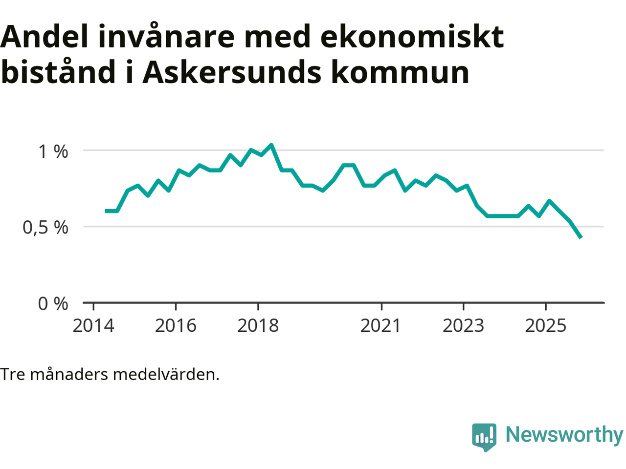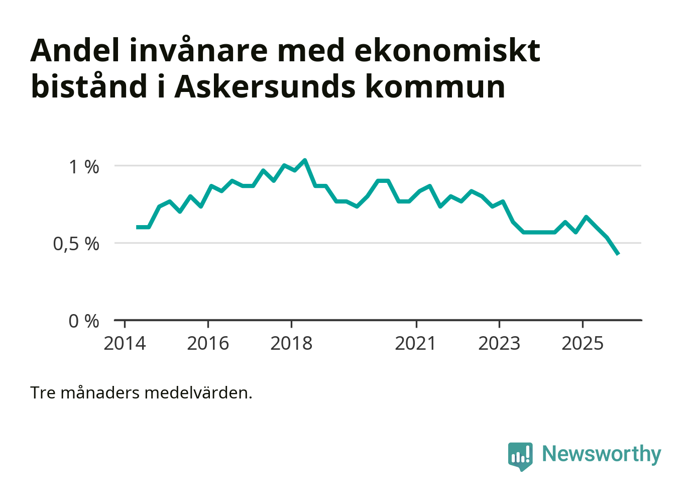 Höstens 0,4 procent är den lägsta andelen biståndstagare i kommunen under någon tremånadersperiod sedan åtminstone 2014, vilket är så långt tillbaka Socialstyrelsens statistik sträcker sig.