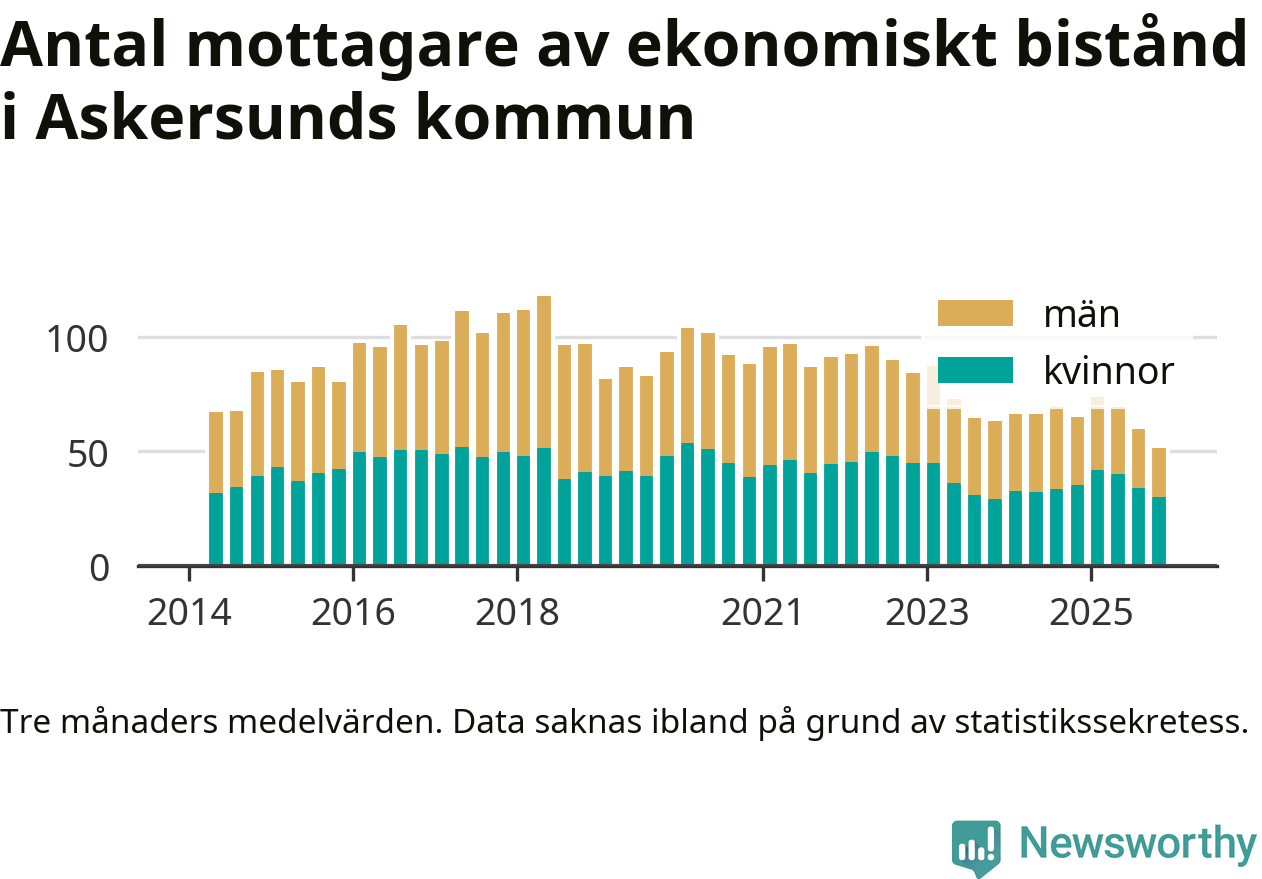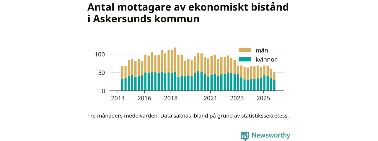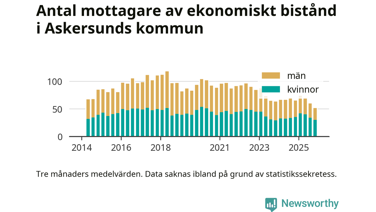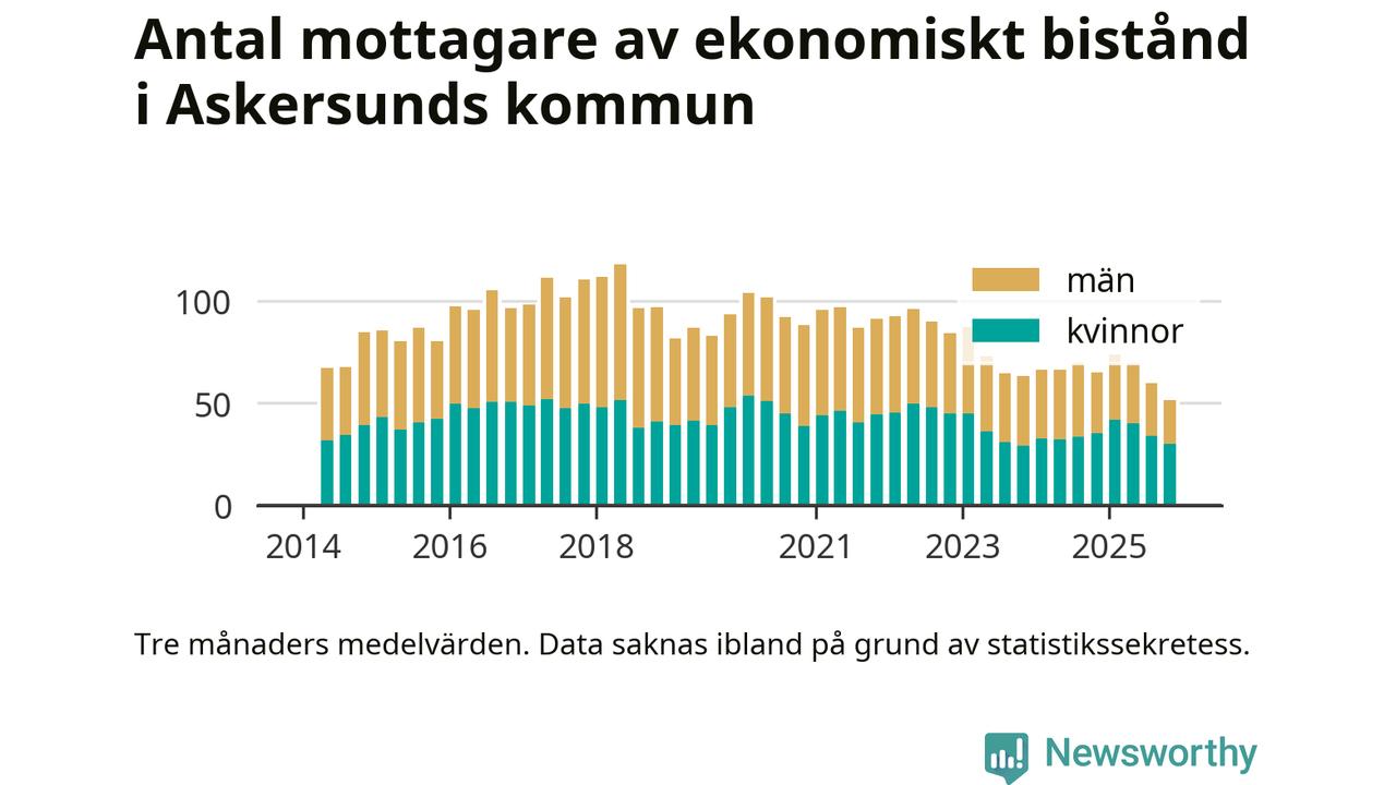 I genomsnitt 51 personer per månad fick ekonomiskt bistånd i Askersunds kommun under höstmånaderna (september till november), vilket motsvarar 0,4 procent av den vuxna befolkningen. Det är marginellt mindre än i somras, och något mindre andel än under hösten för ett år sedan.